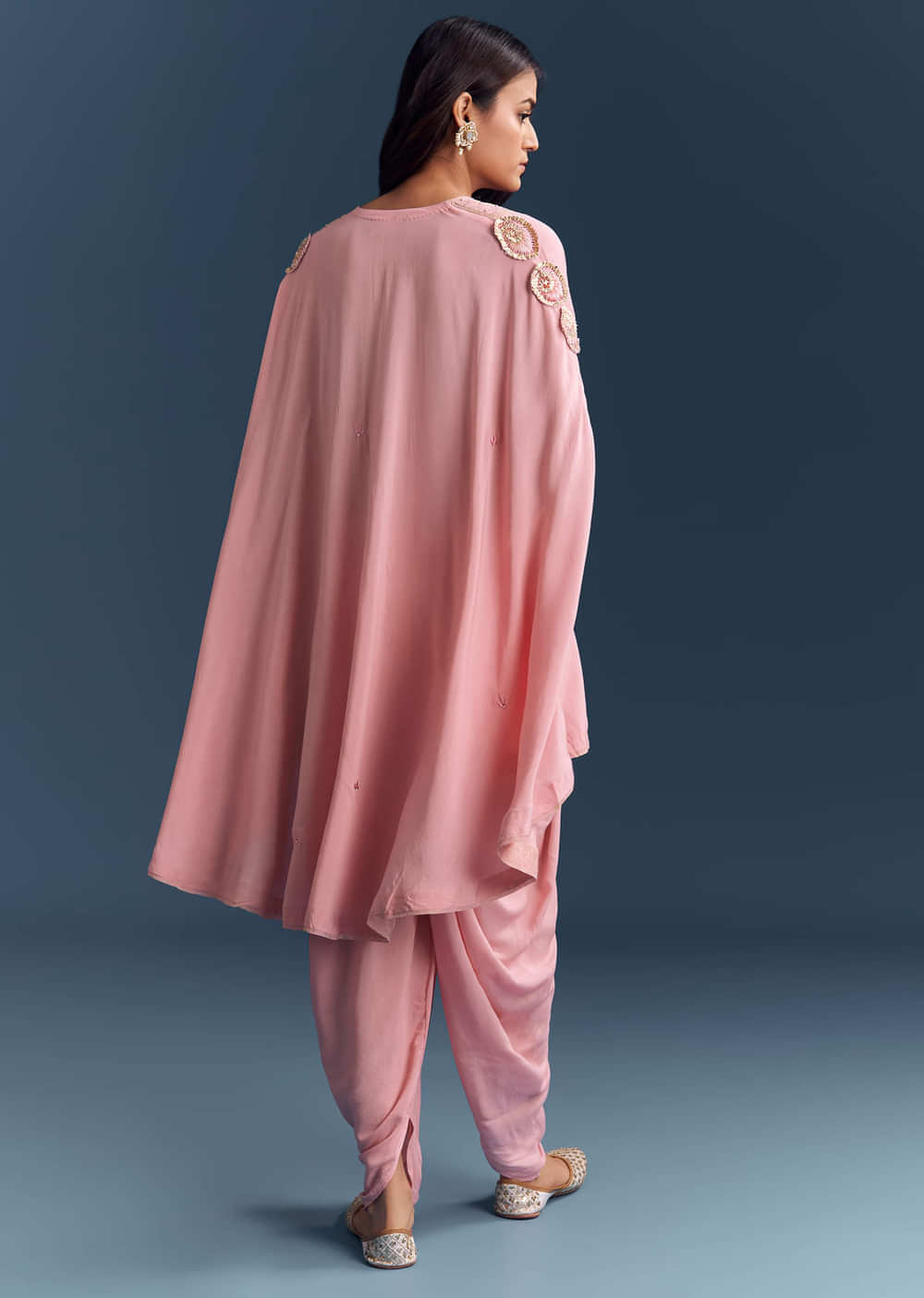 Pink Muslin Cape Top And Dhoti Set With Gota Work