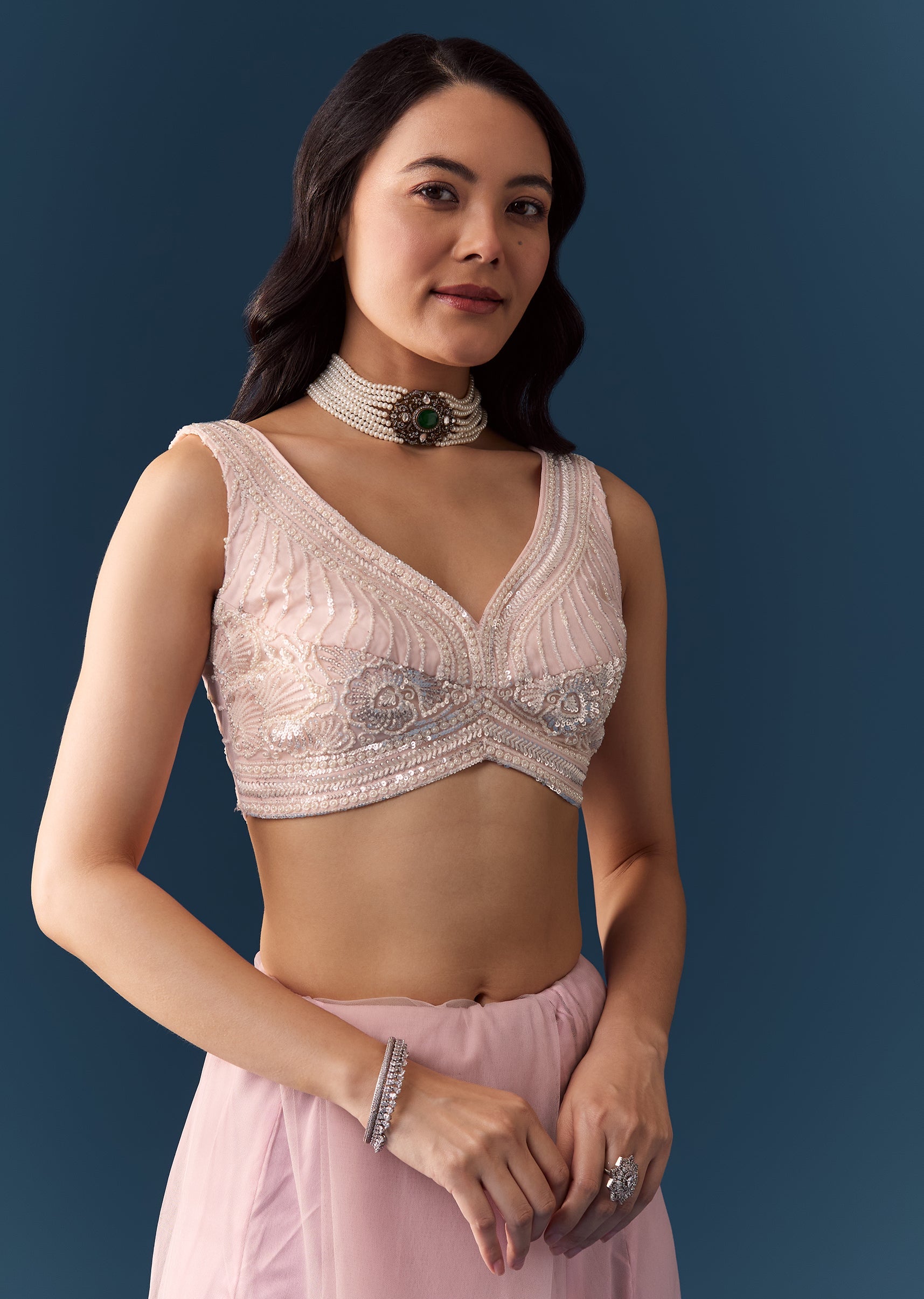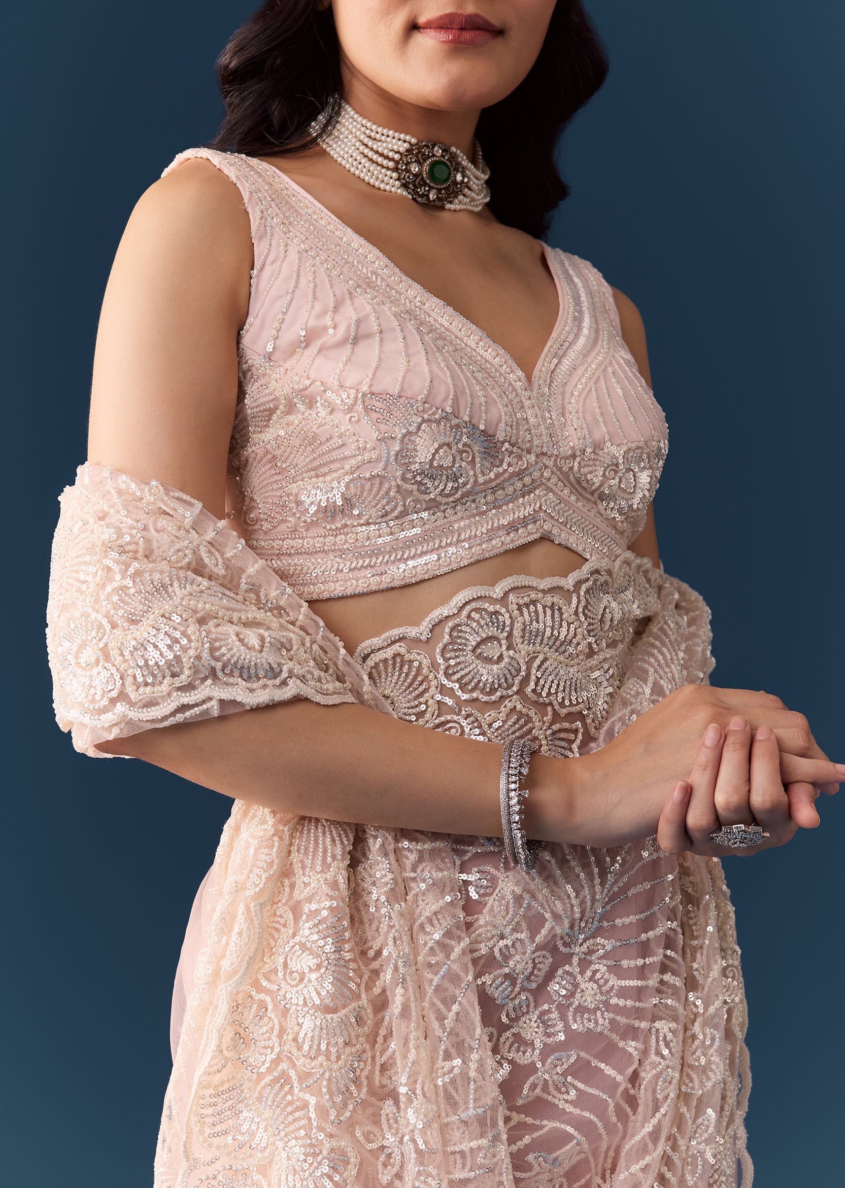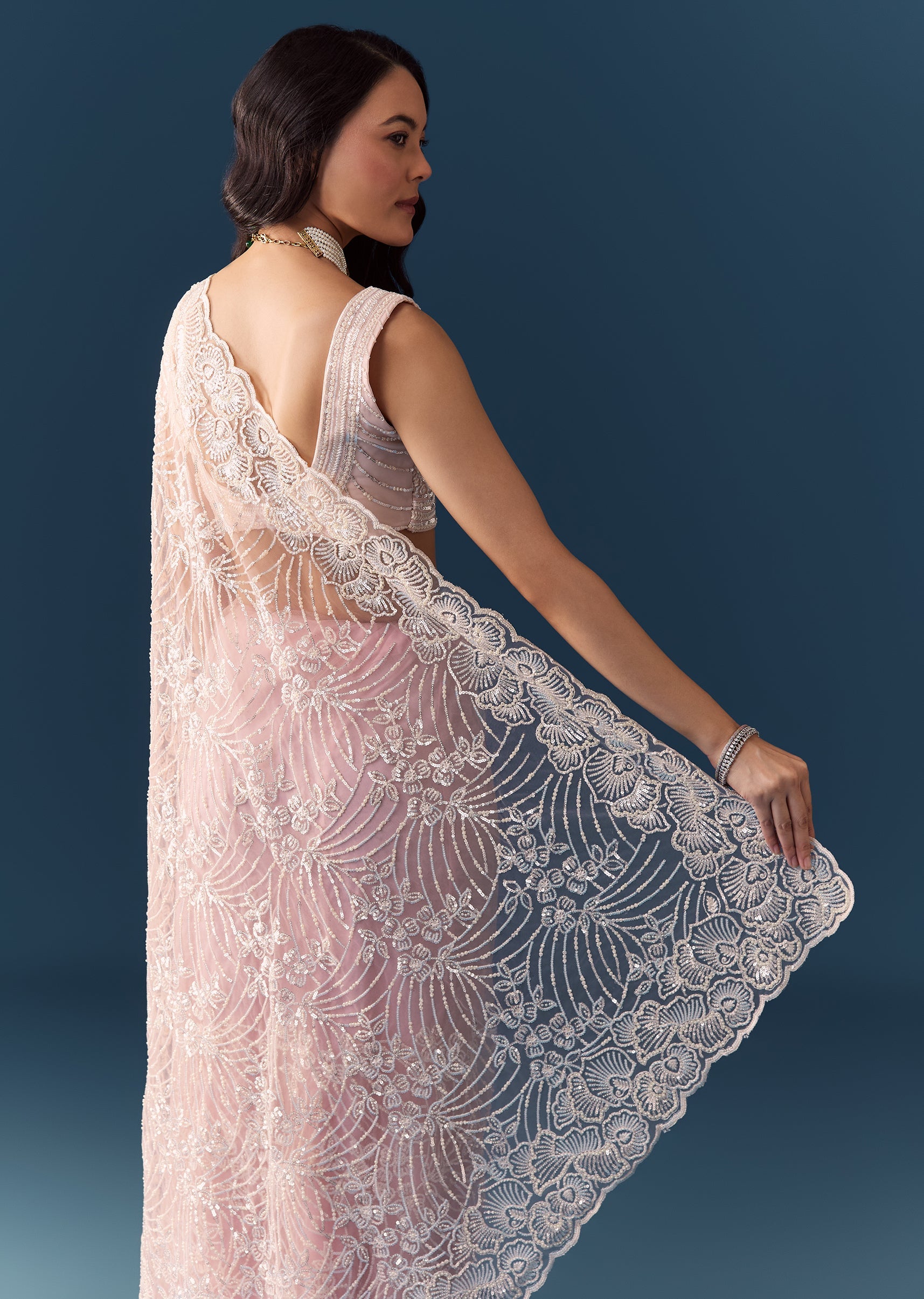 Pink Net Floral Jaal Cutdana Work Saree with Unstitched Blouse