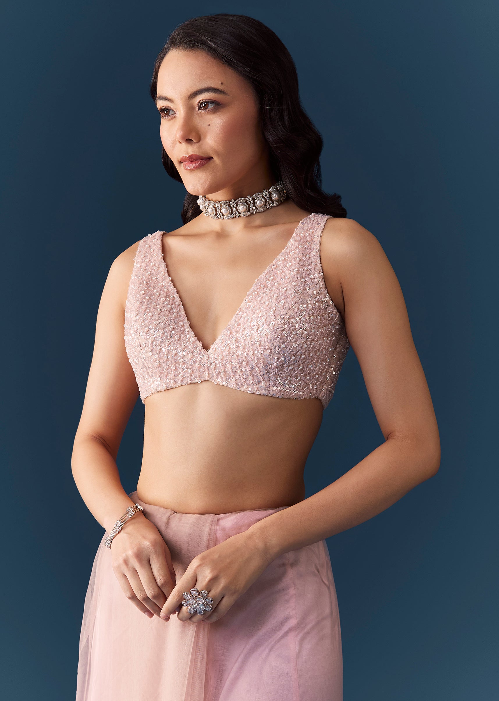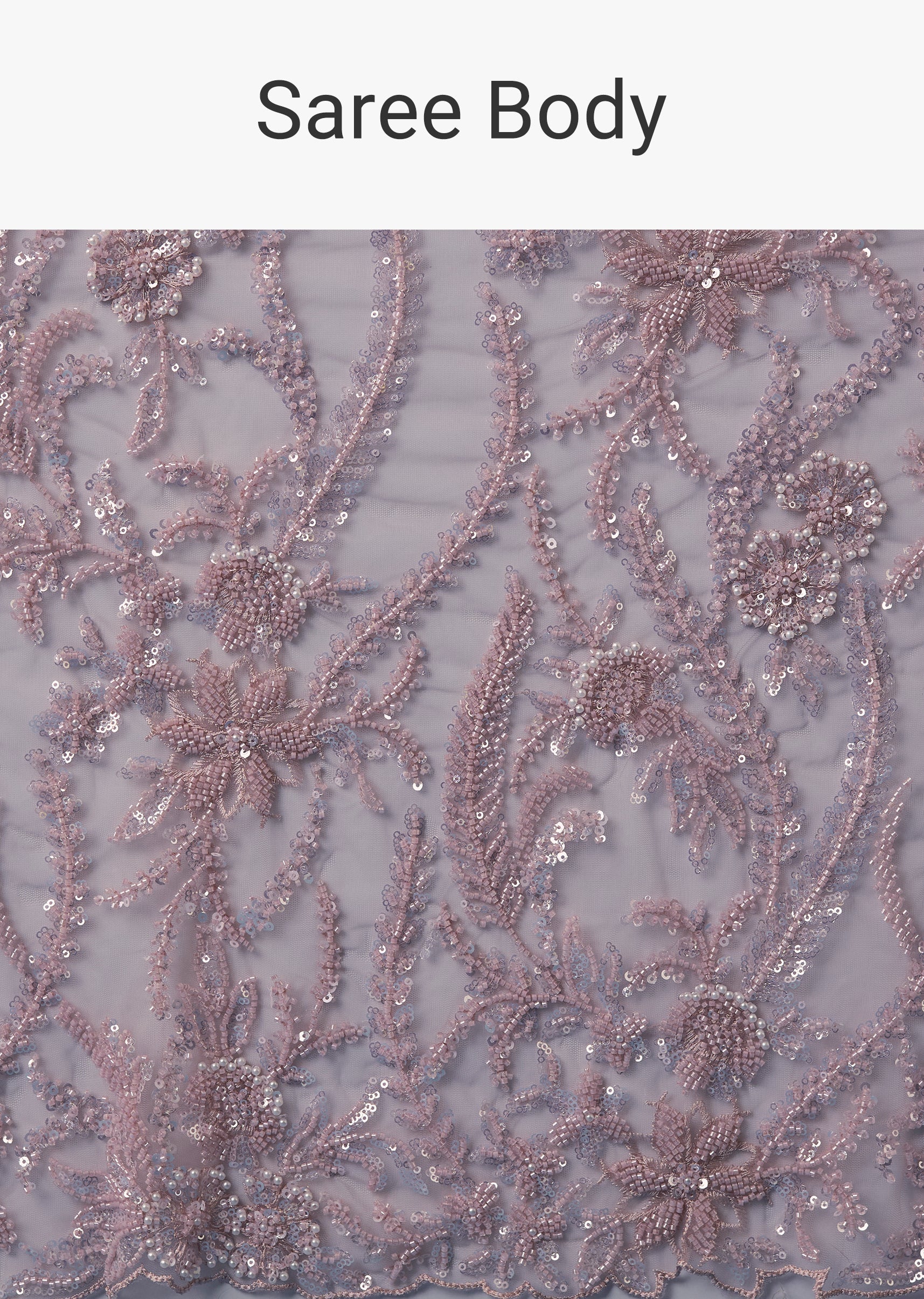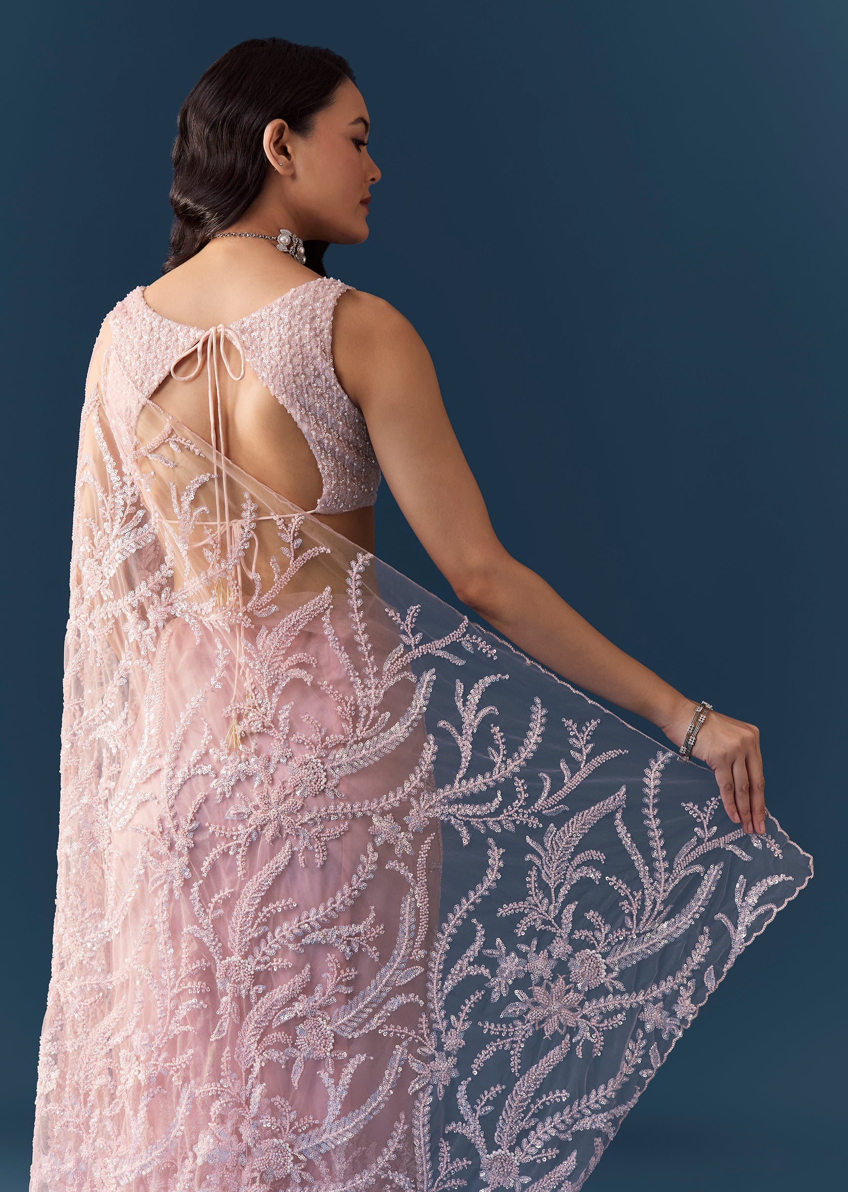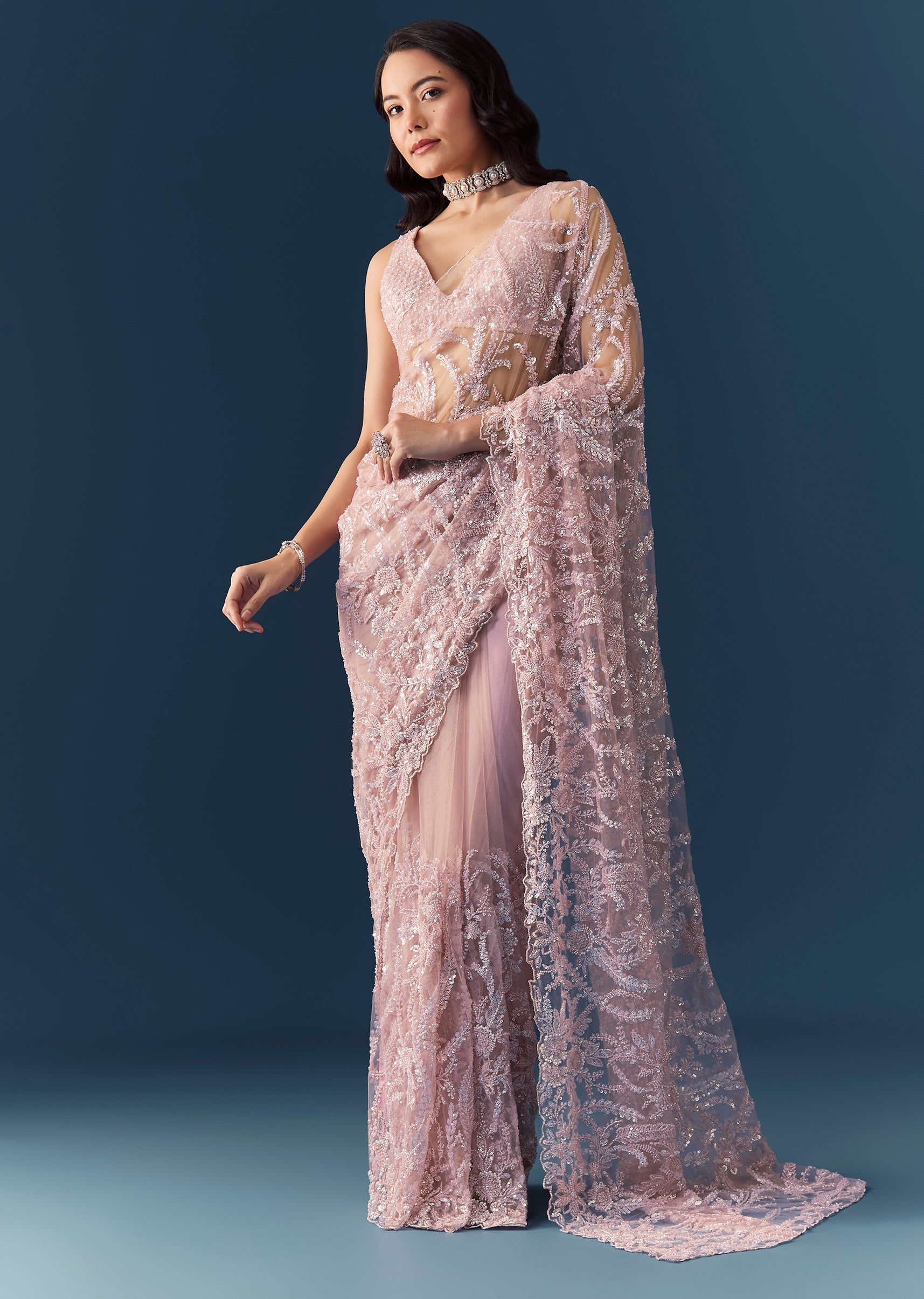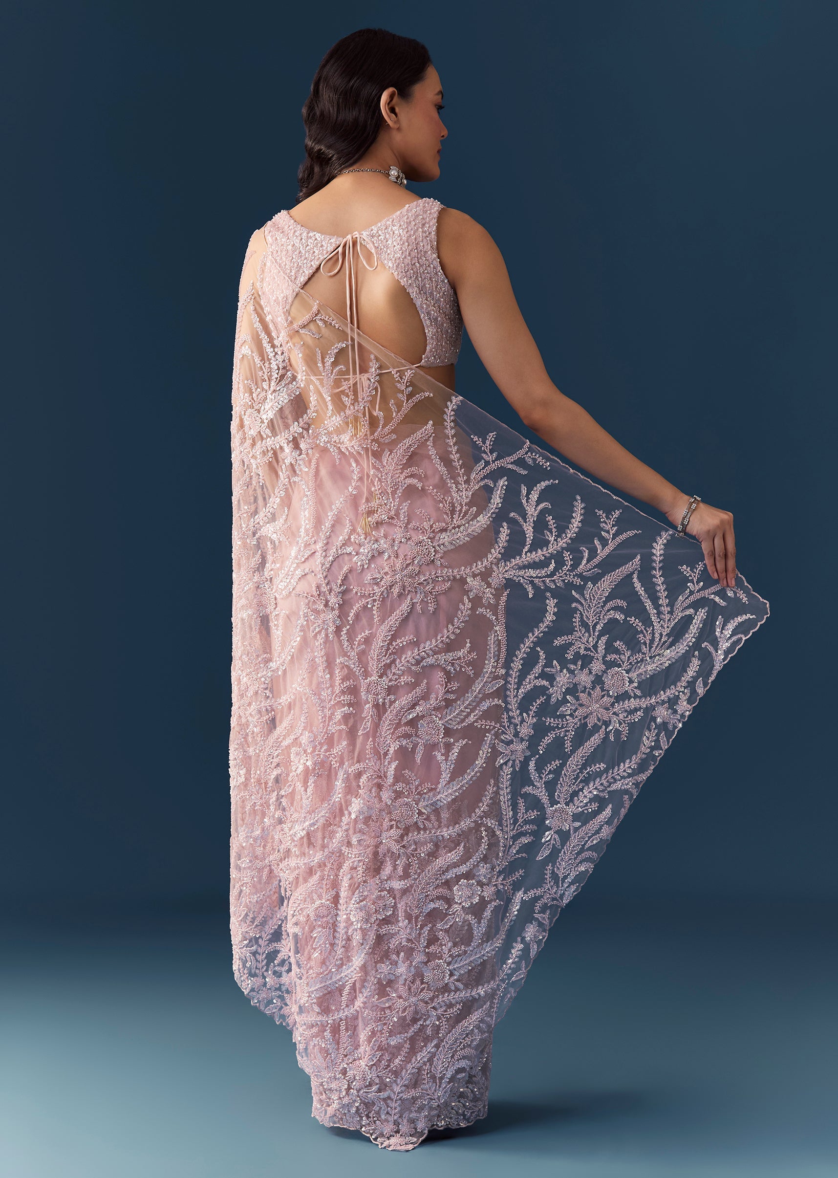 Pink Net Floral Jaal Work Saree with Unstitched Blouse