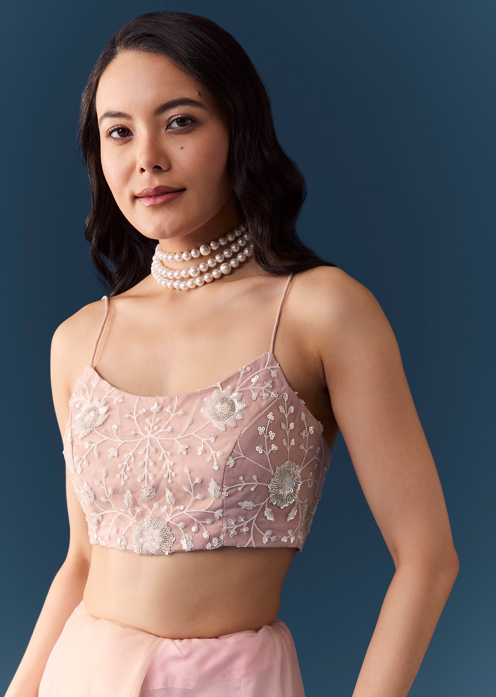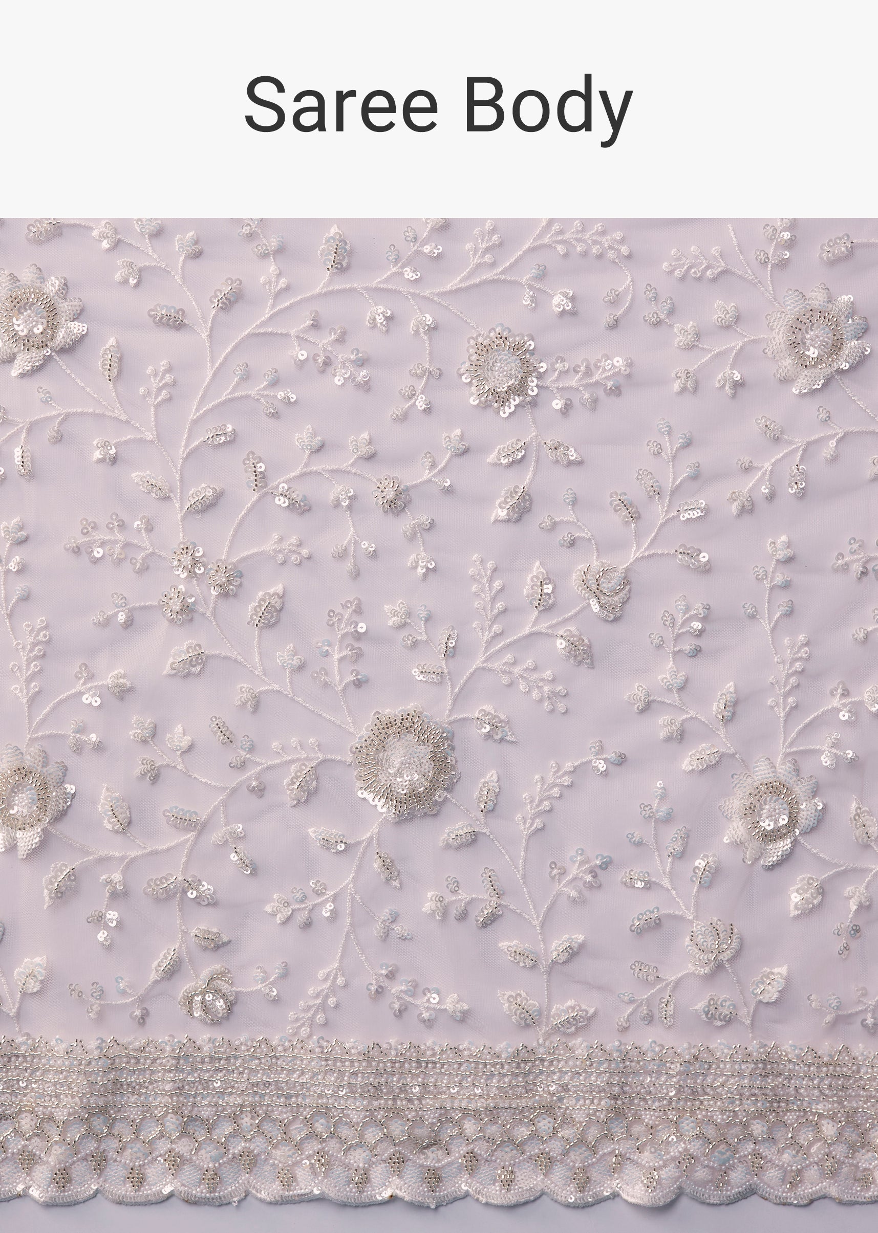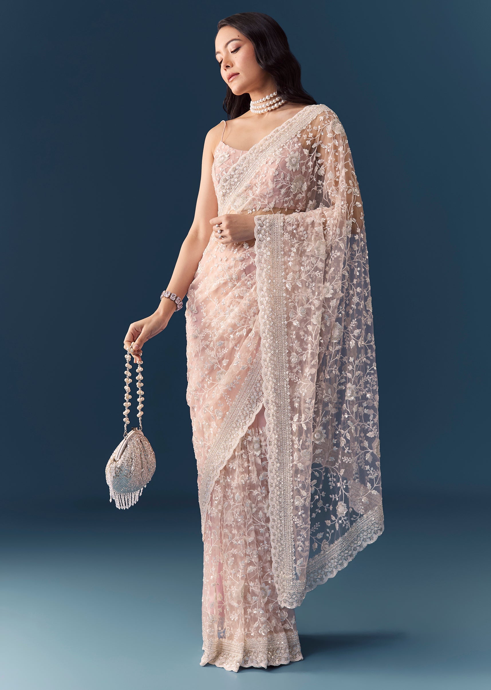 Radiate soft elegance with this pink heavy embroidered net saree, showcasing a delicate floral jaal design all over, intricately crafted with resham thread, cutdana, sequins, and beads. The graceful scallop... More Product Details