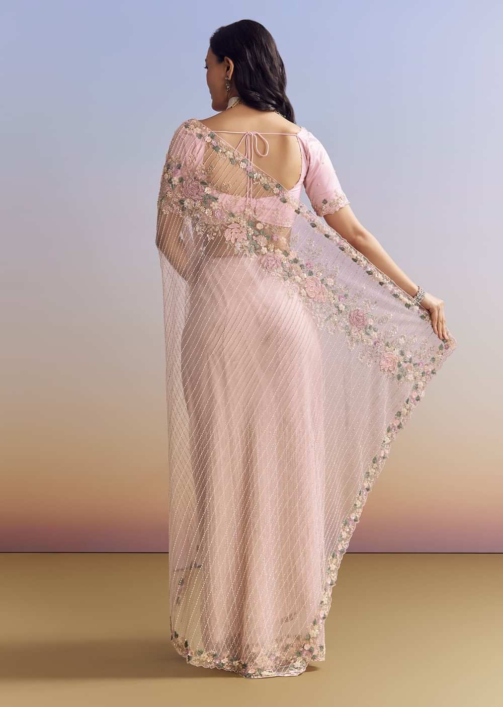 Pink Net Saree With Pastel Floral Embroidery And Resham Detailing