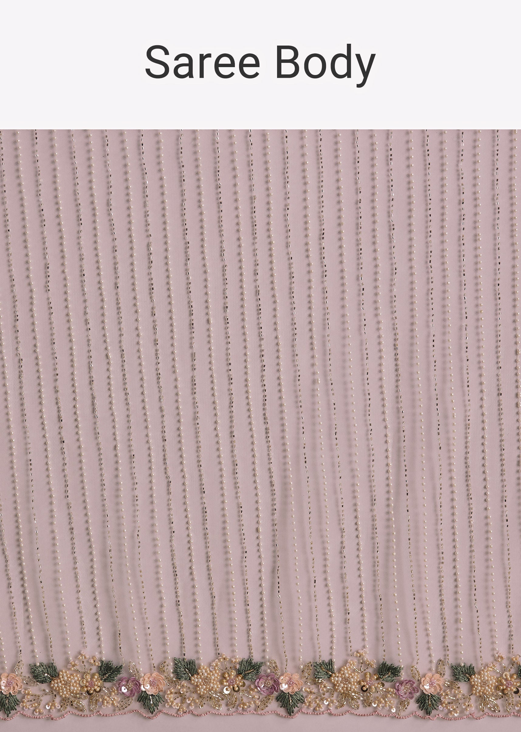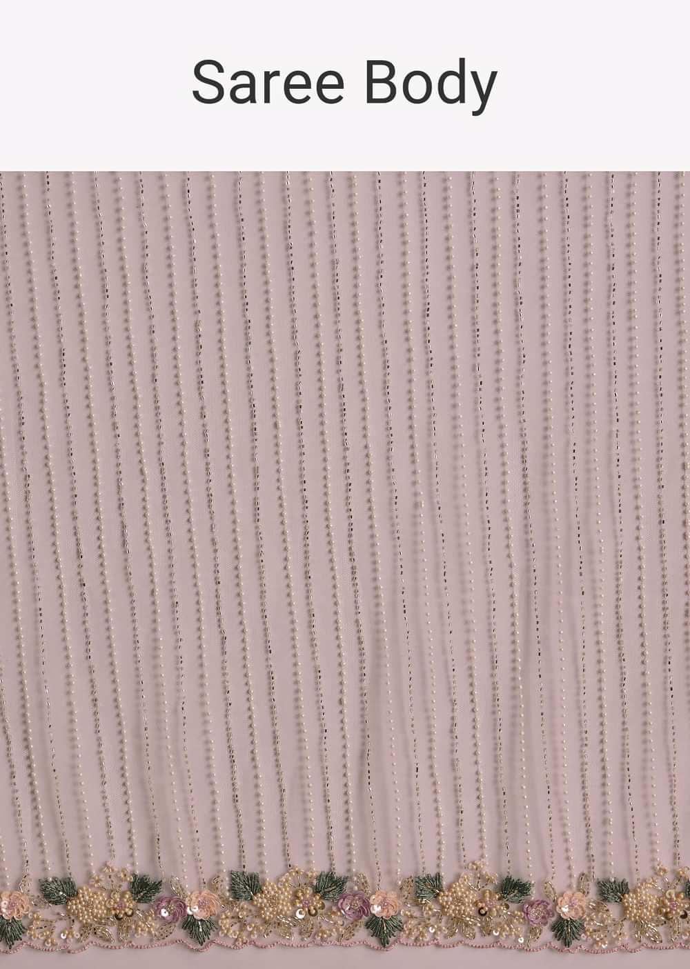 Light pink net saree delicately embroidered in floral motifs with sequins, cutdana, beads, and resham threads. Comes with an unstitched matching blouse. Perfect for Mehendi, Engagement, and Sangeet occasions. Awarded... More Product Details