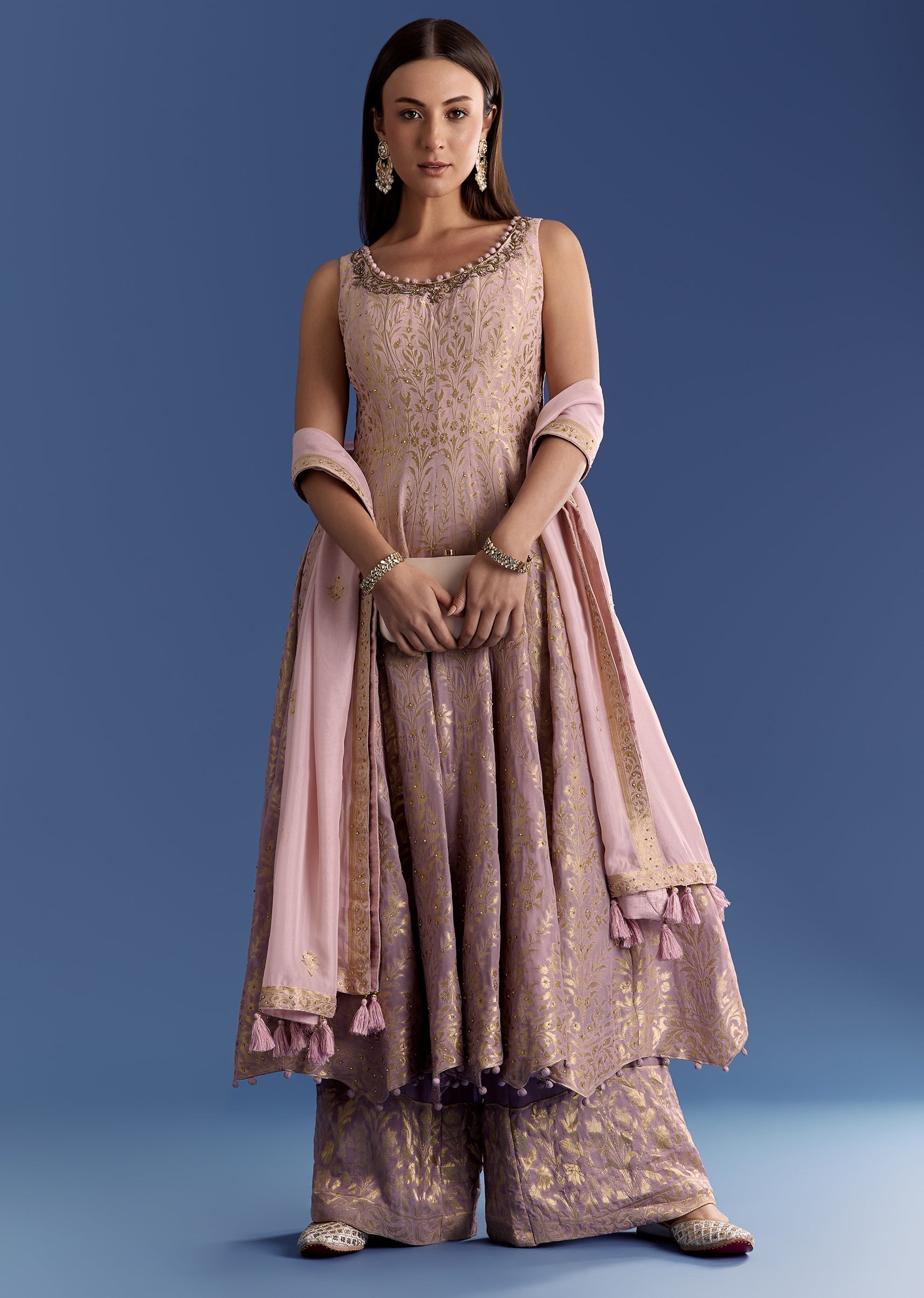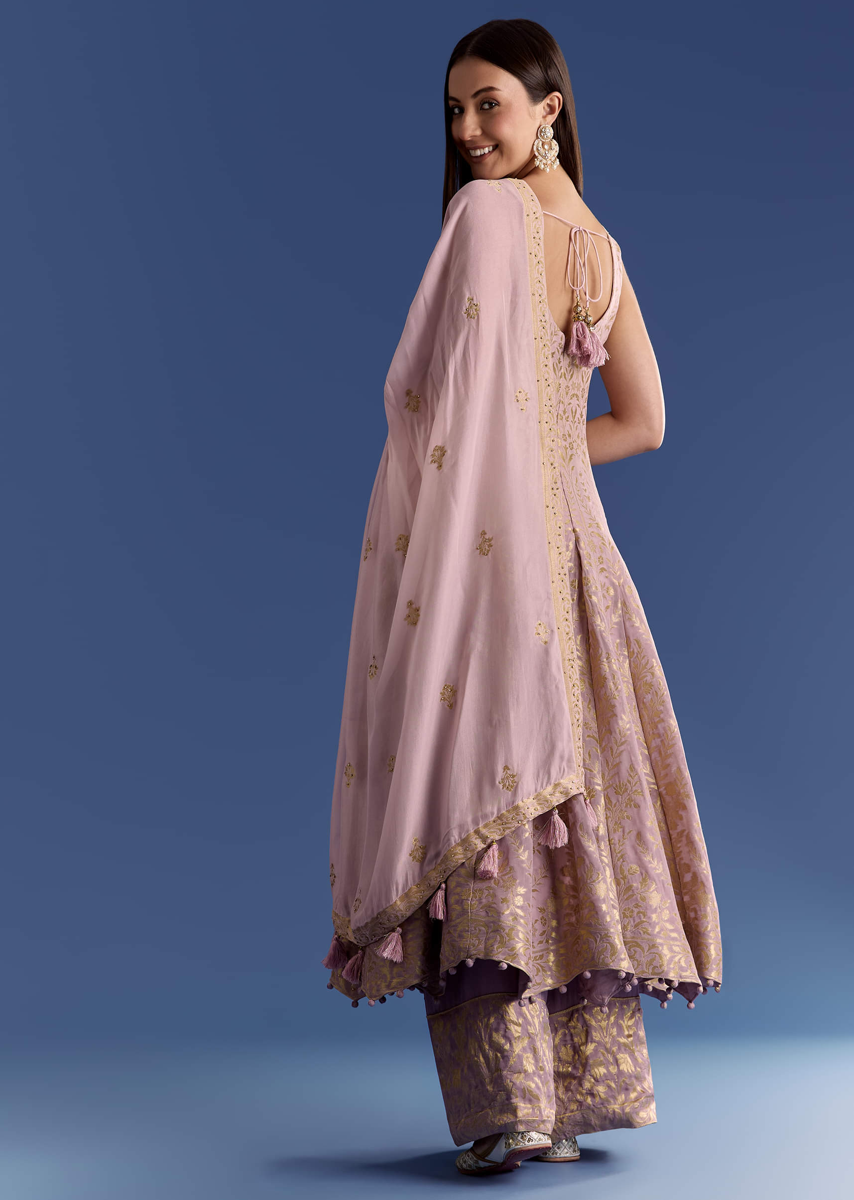 Swirling in hues of blush and rose, this ombre pink georgette anarkali is adorned with a shimmering cut dana neckline and a luminous zari dupatta. It moves like a soft... More Product Details