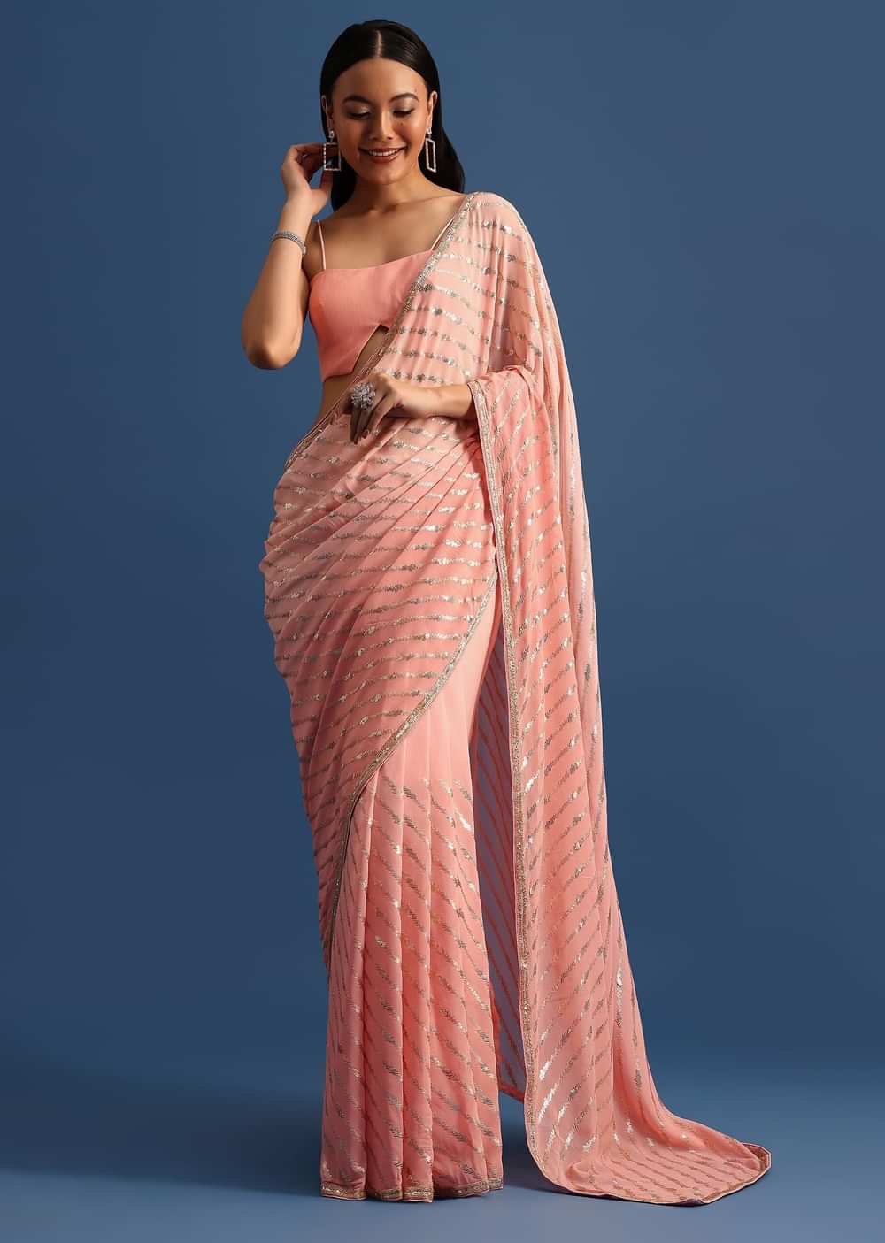 Unveil your grace in our pink ombre georgette saree, where delicate sequins weave a captivating shimmer across the fabric. This enchanting piece transitions from soft pink to a deeper hue. The saree comes with an unstitched blouse. It is ideal for making a statement at any festive occasion. Awarded as the Most Trusted Brand, we're delivering styles you love, just as promised.