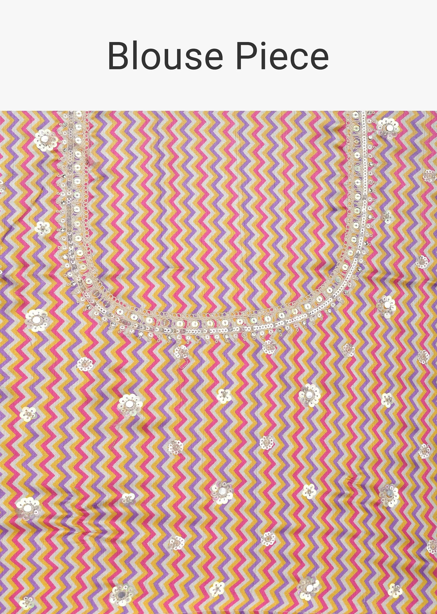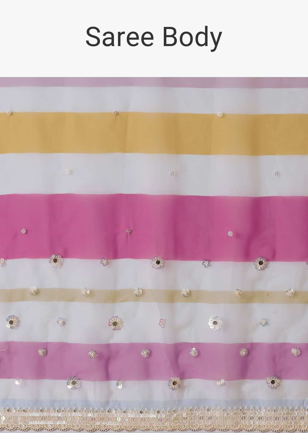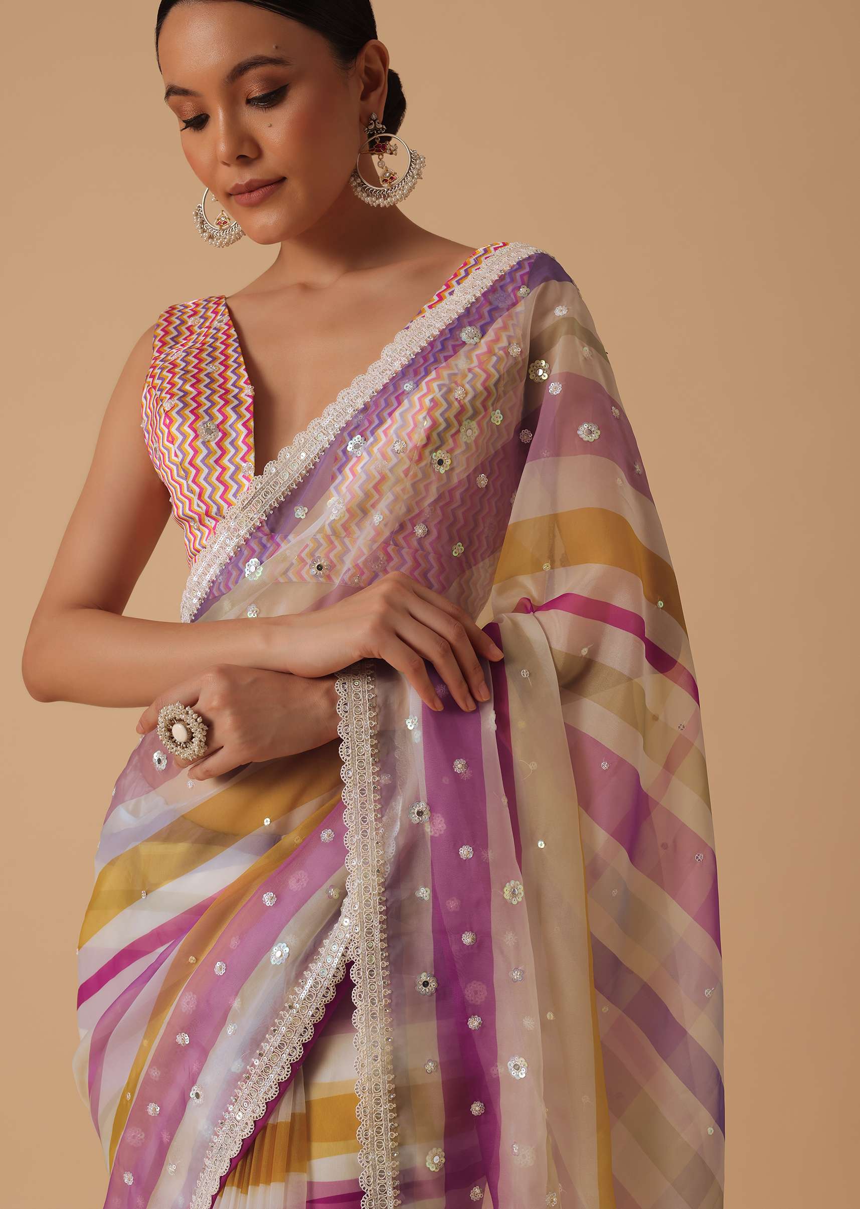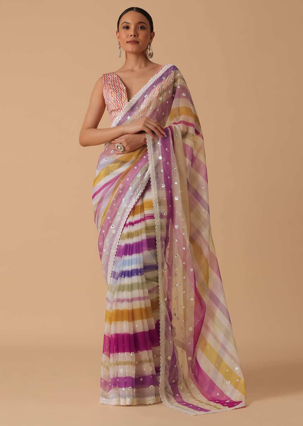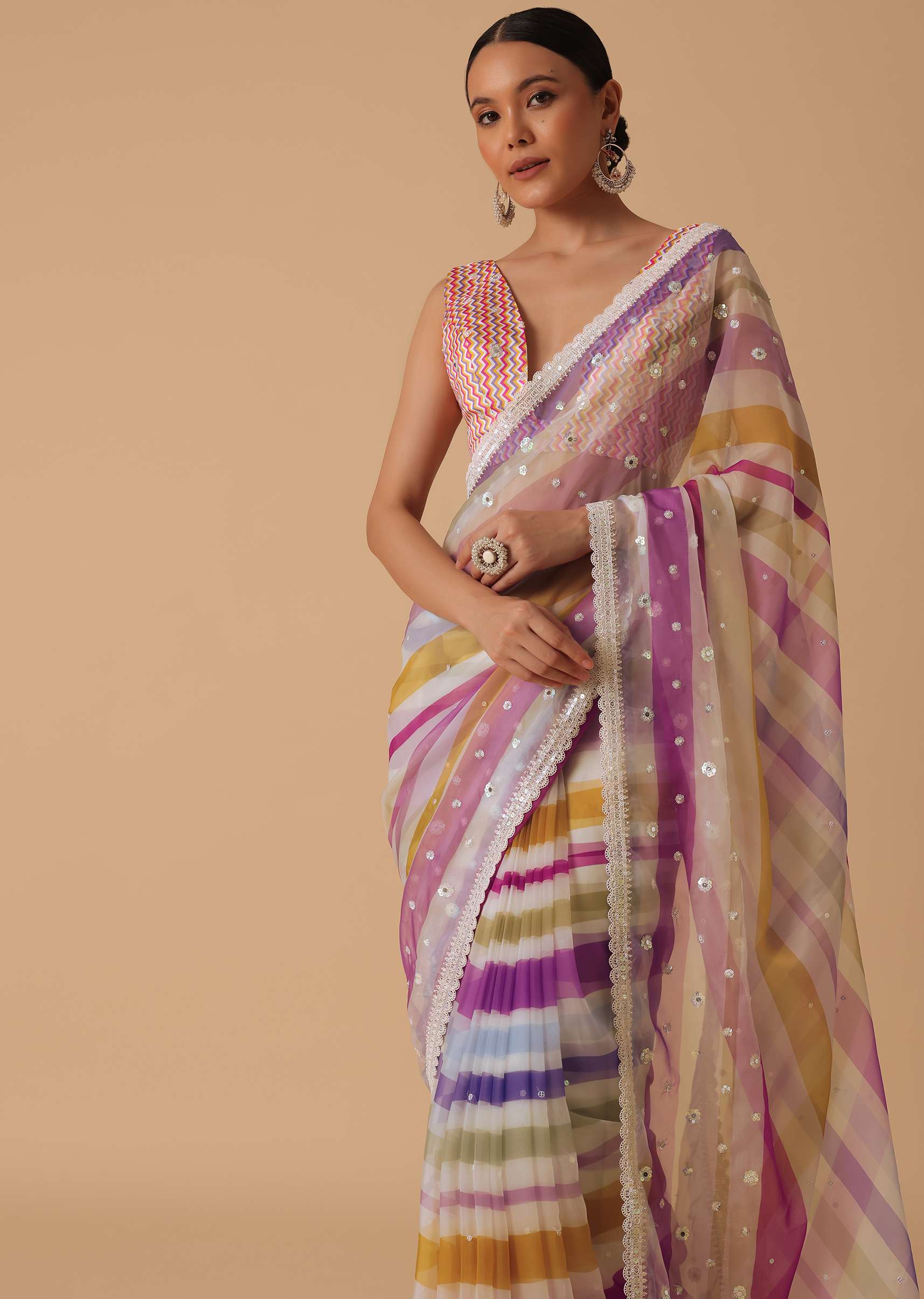 Let your festive wardrobe exhibit your unique personality with this organza saree. Crafted with multi-color stripes, it comes decked with glistening mirror work and intricate embroidery. The fun colors and sheer fabric make this drape a conversation starter at the next get-together. This saree is paired with an unstitched blouse piece. Awarded as the Most Trusted Brand, we're delivering styles you love, just as promised.