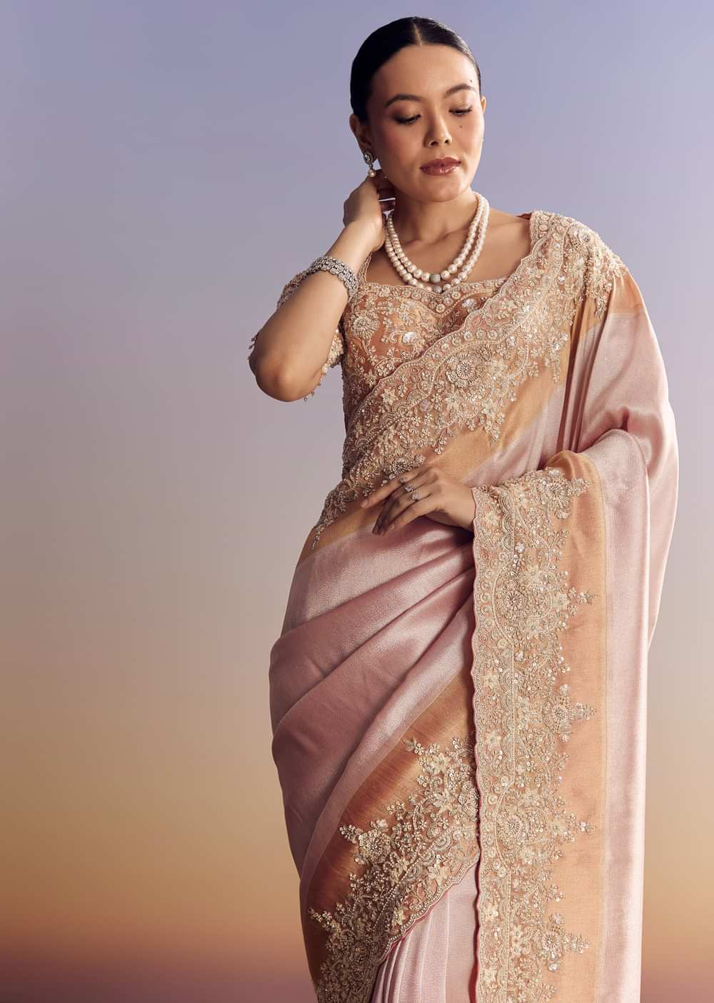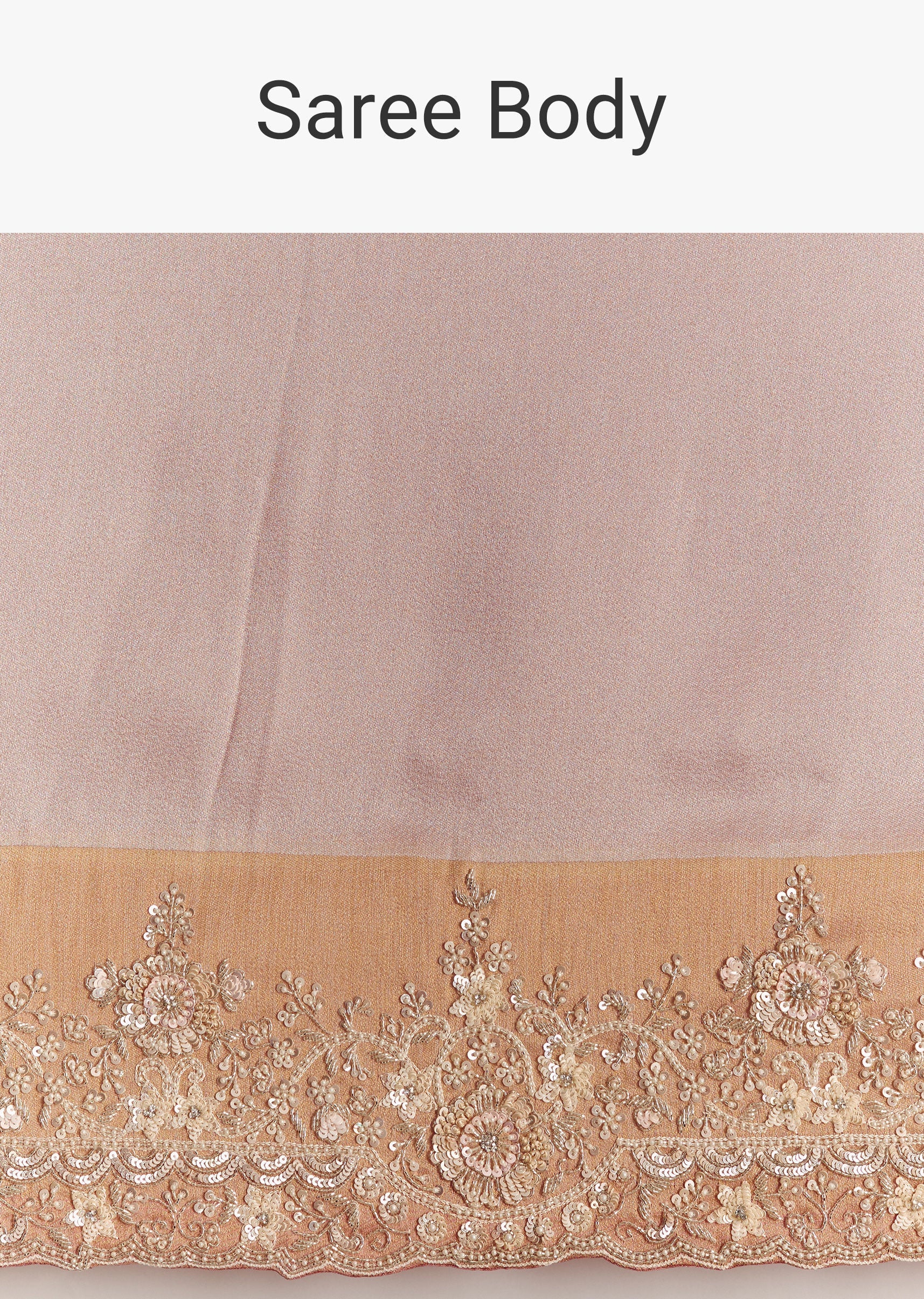 Kora silk saree in a dual-tone pink and peach palette with exquisite zardosi, sequins, cutdana, moti, and beads work. Comes with an unstitched blouse. Perfect for Mehendi, Engagement, and Reception.... More Product Details