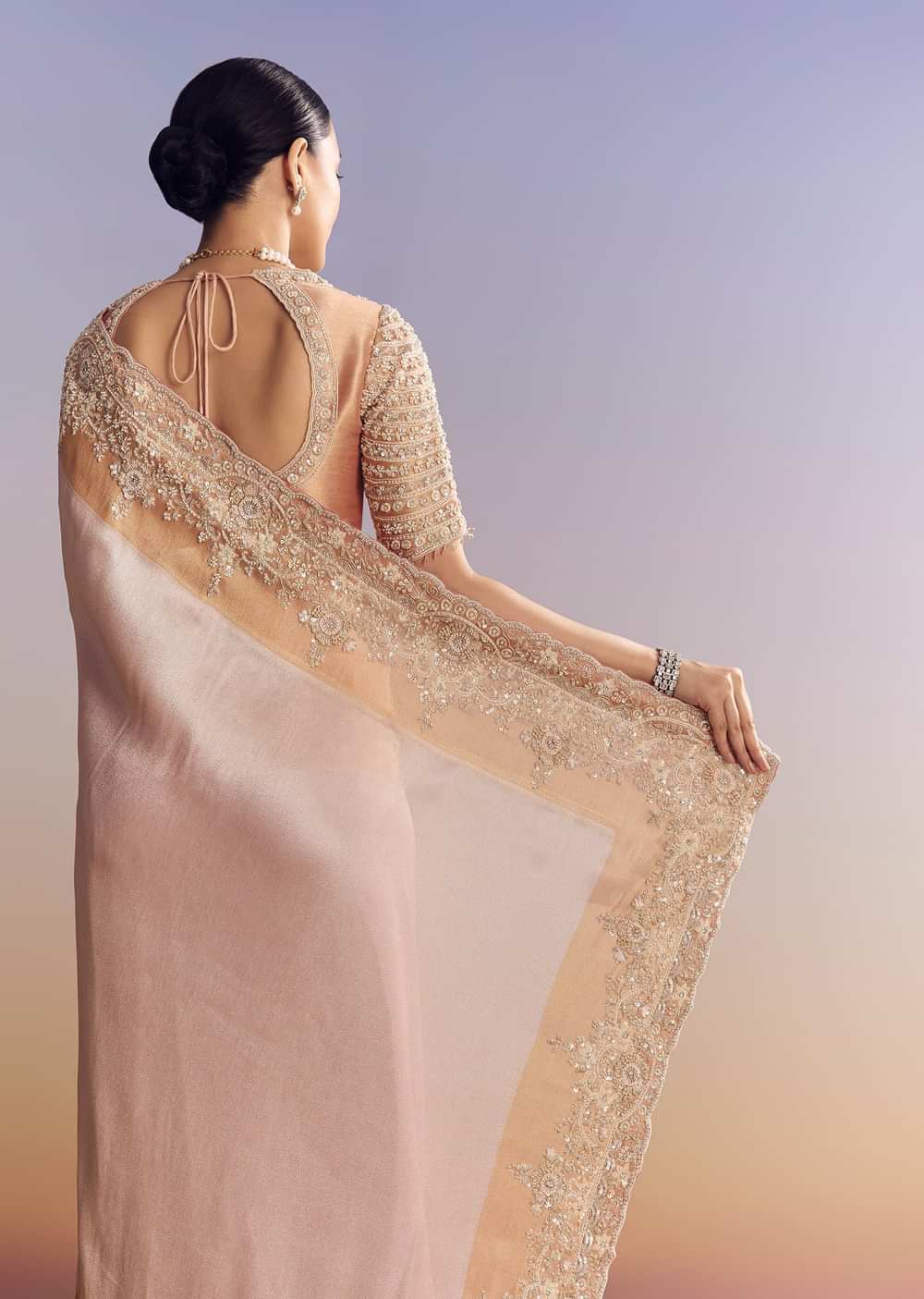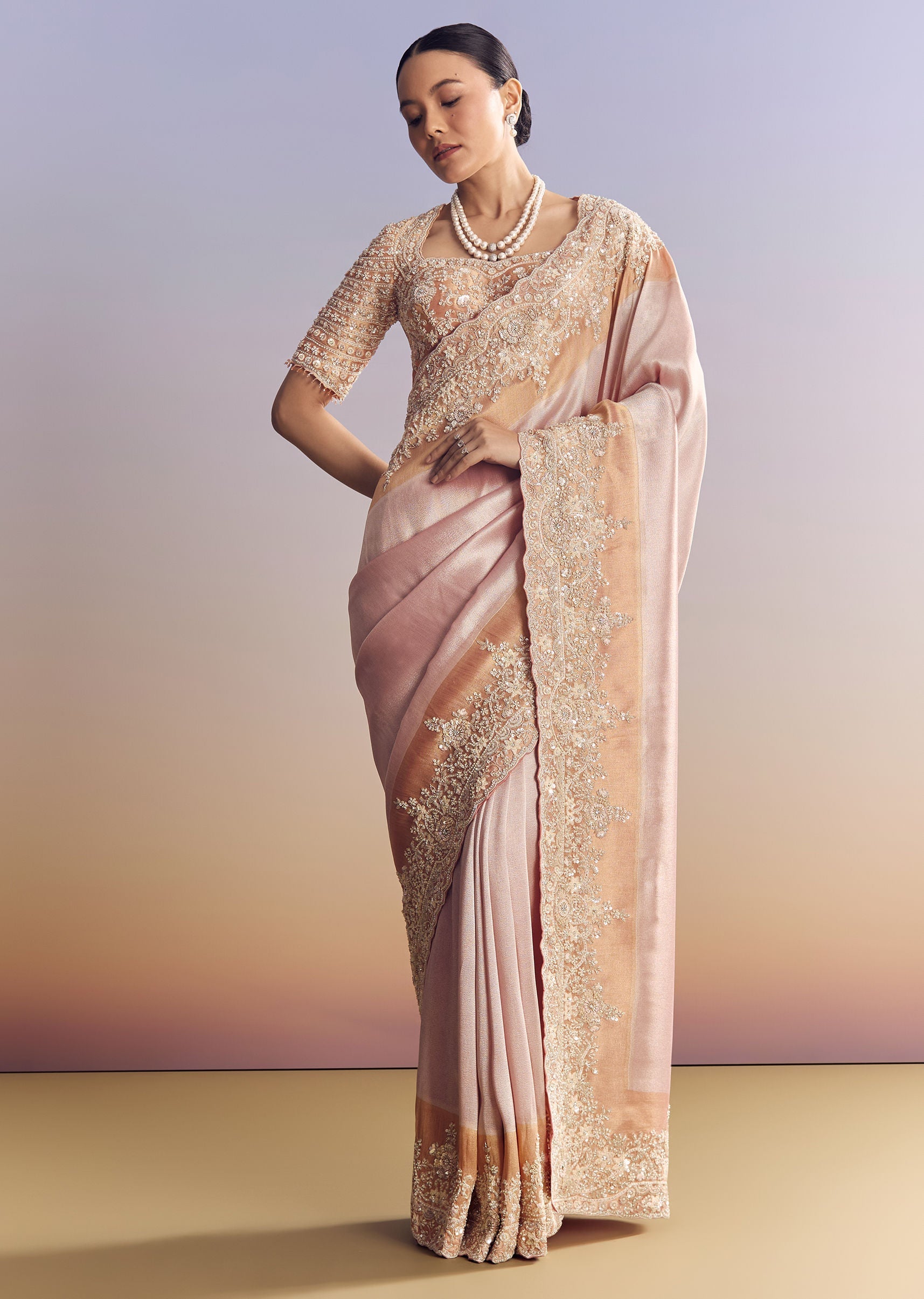 Pink Peach Kora Silk Saree With Zardosi Embroidery