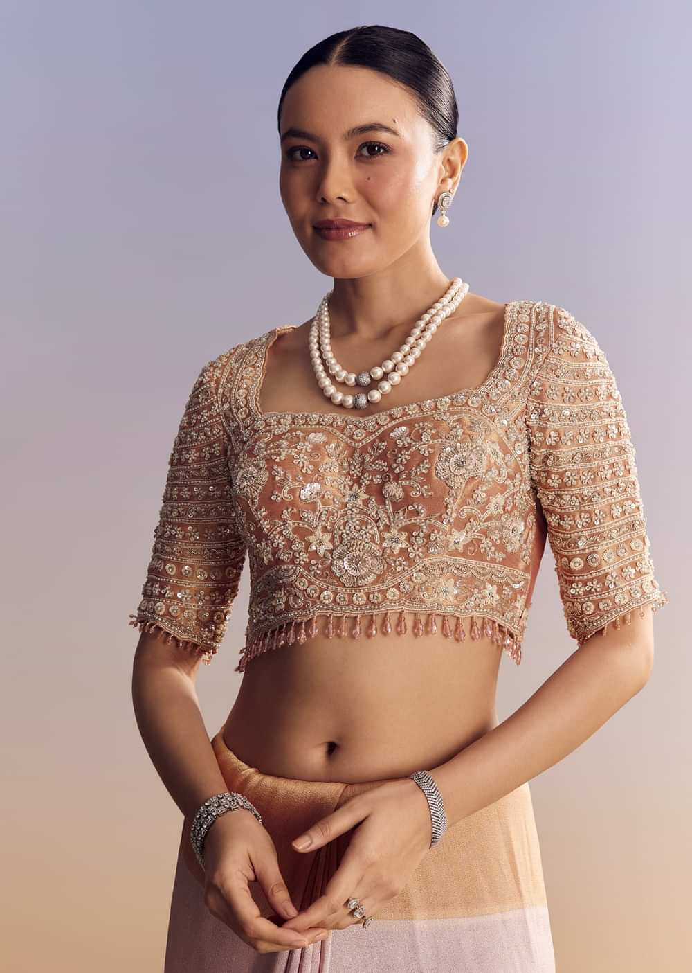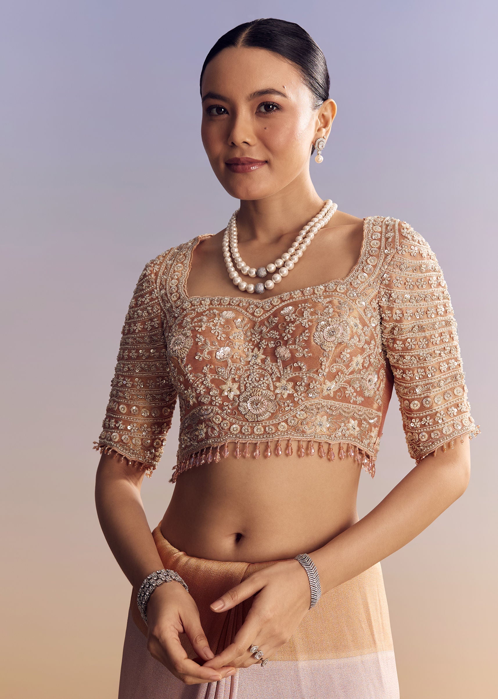 Kora silk saree in a dual-tone pink and peach palette with exquisite zardosi, sequins, cutdana, moti, and beads work. Comes with an unstitched blouse. Perfect for Mehendi, Engagement, and Reception. Awarded as the Most Trusted Brand, we're delivering styles you love, just as promised.