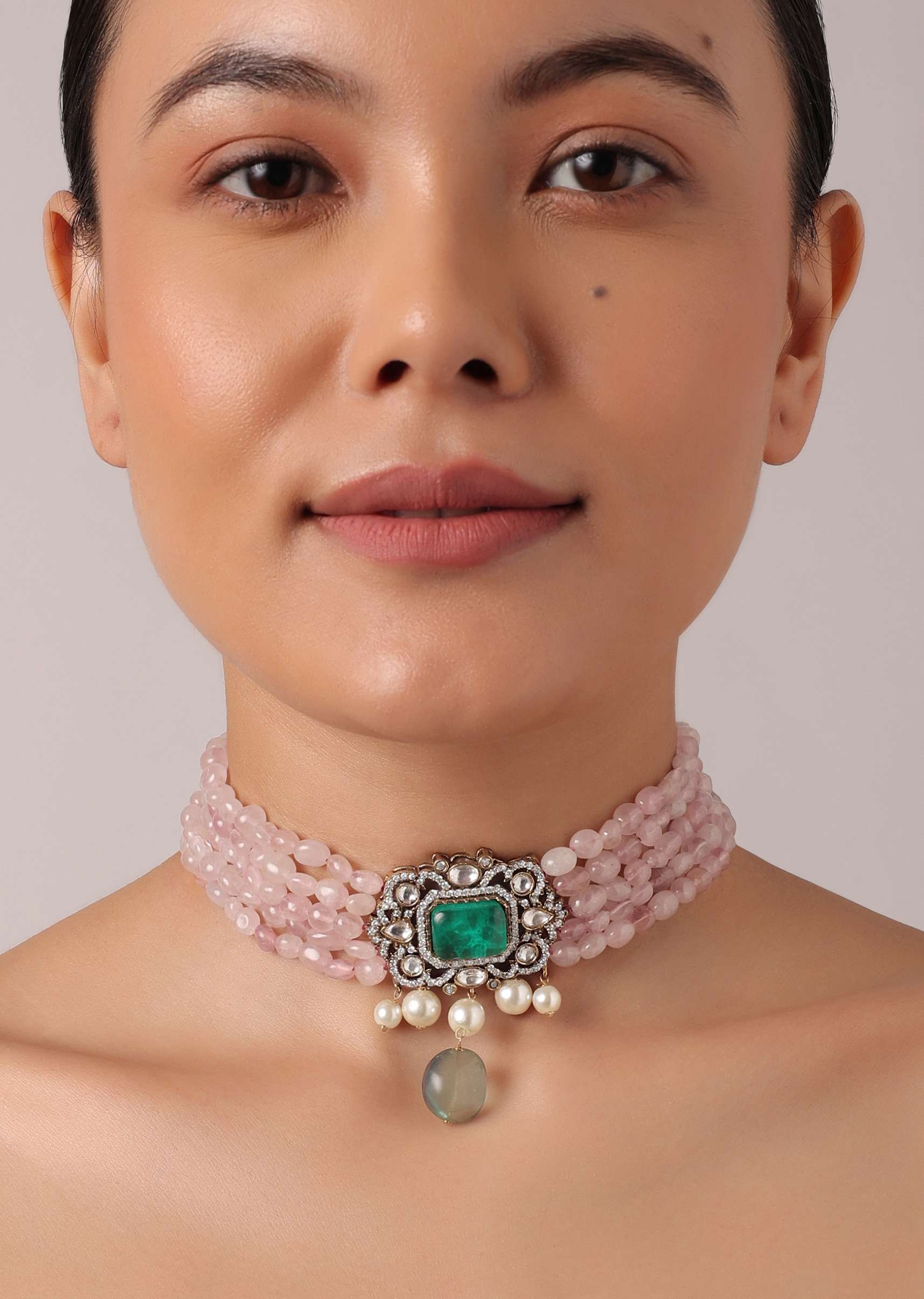 Exude elegant charm by adorning these captivating beauties. Made from high quality mix metal this choker set is constructed on a gold tone base. Flaunting a beautiful design it is amalgamation of meticulous artistry and traditions. Accentuated with pink hued bead strings it is enhanced with a geometric motif pendant. Embellished with delicate polki and kundan stones it is completed with matching carved danglers.Keep away from moisture perfume alcohol and harsh chemicals.Spot clean only.Keep away from sharp objects. Awarded as the Most Trusted Brand, we're delivering styles you love, just as promised.