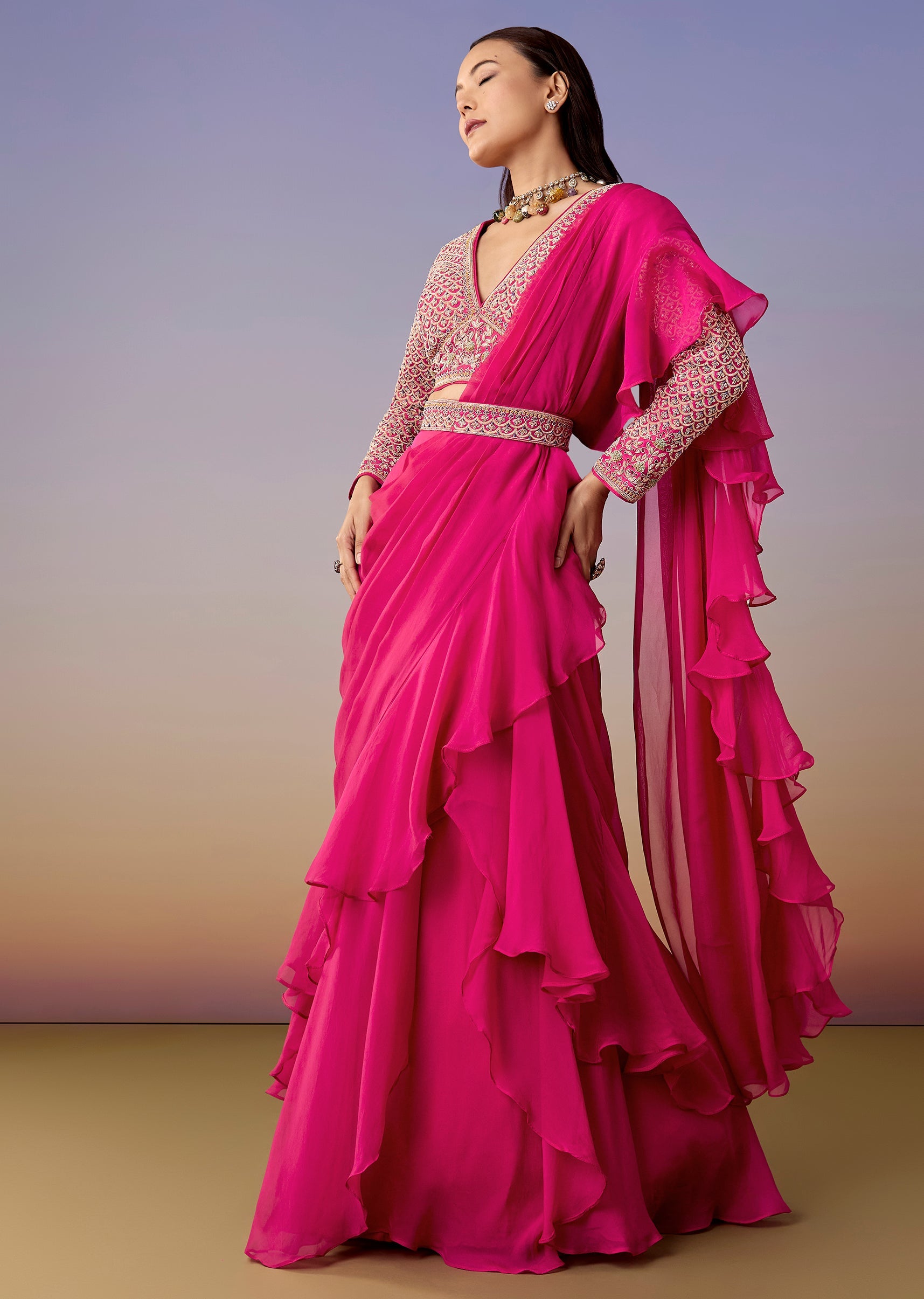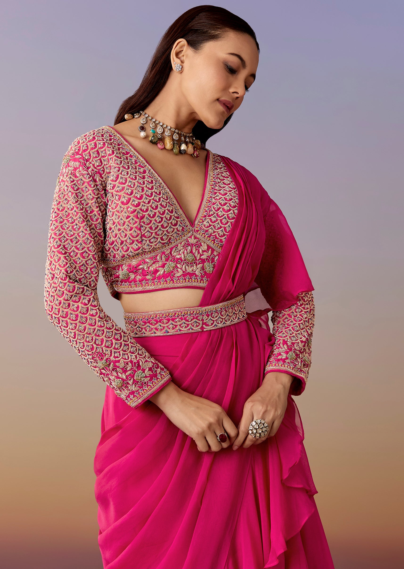 A modern pink ready-pleated saree paired with a zardosi and French-knot embellished blouse and a matching belt for definition. Full sleeves, V-neck, and side zip closure make it a sleek... More Product Details