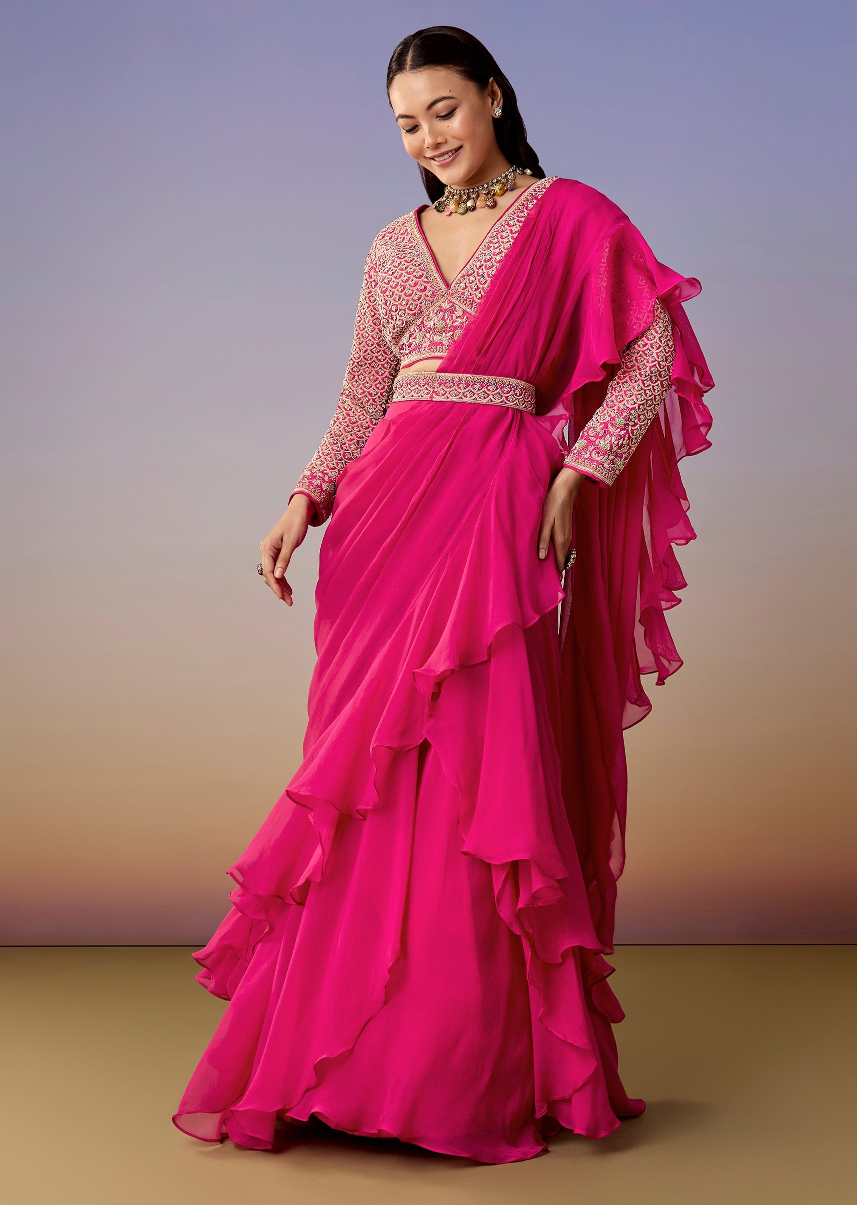 A modern pink ready-pleated saree paired with a zardosi and French-knot embellished blouse and a matching belt for definition. Full sleeves, V-neck, and side zip closure make it a sleek choice for weddings and festive evenings.Awarded as the Most Trusted Brand, we're delivering styles you love, just as promised.