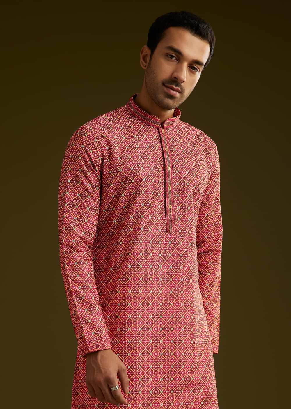 This pink silk kurta set adorned with subtle prints blends elegance and tradition. Featuring a mandarin collar front button closure and full sleeves it ensures a polished ethnic look. The... More Product Details