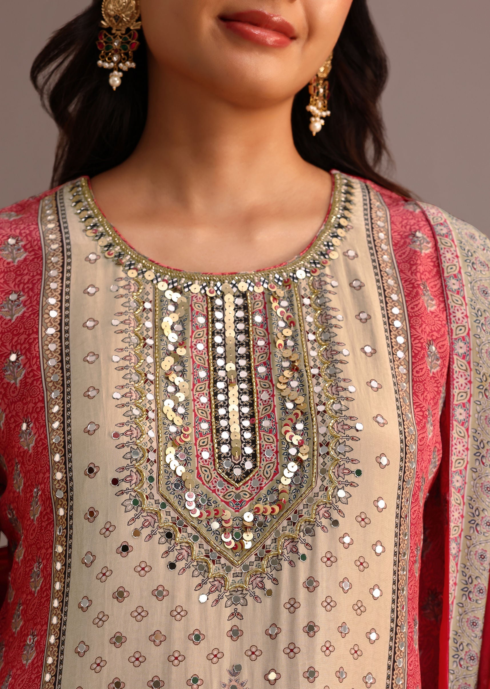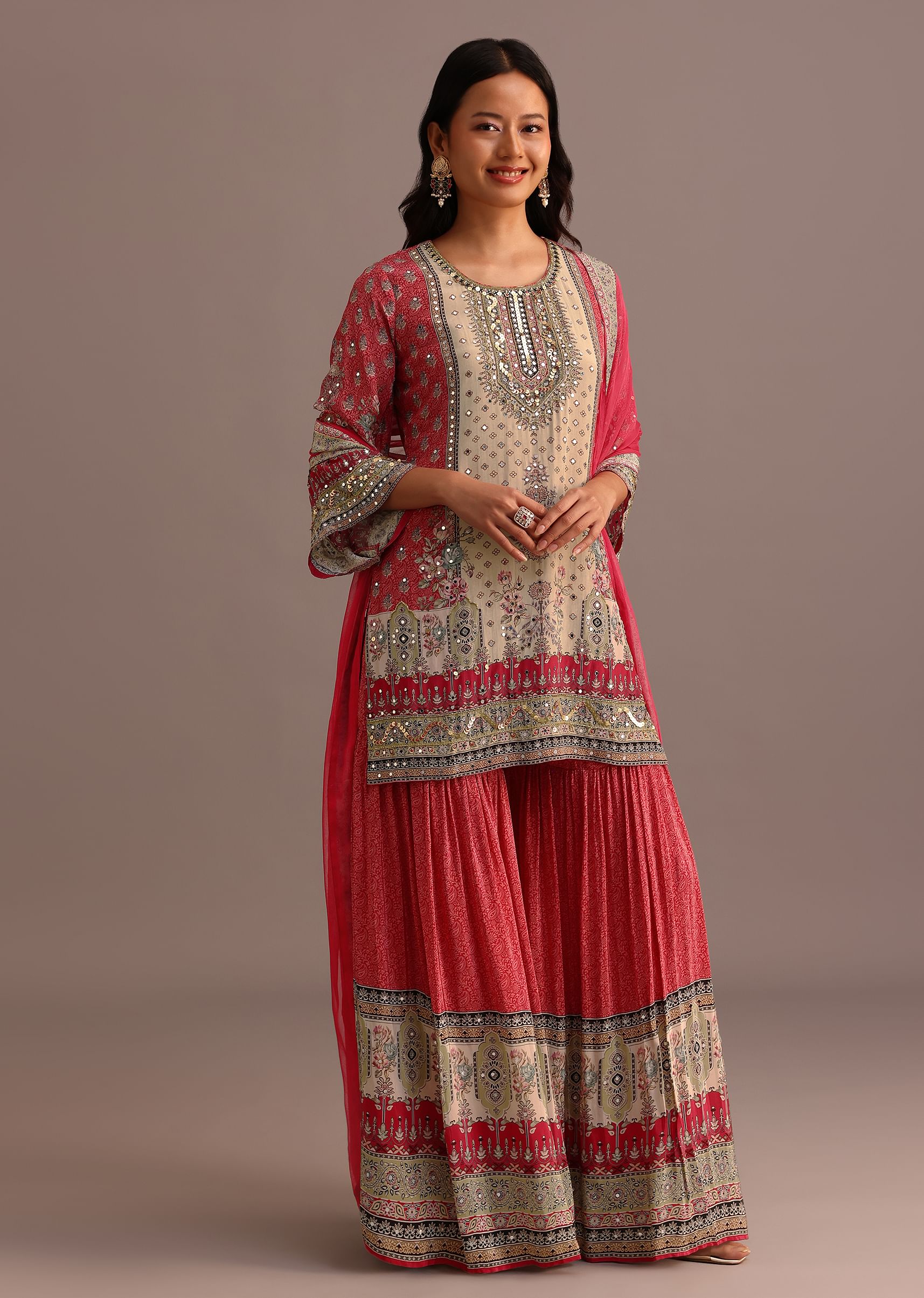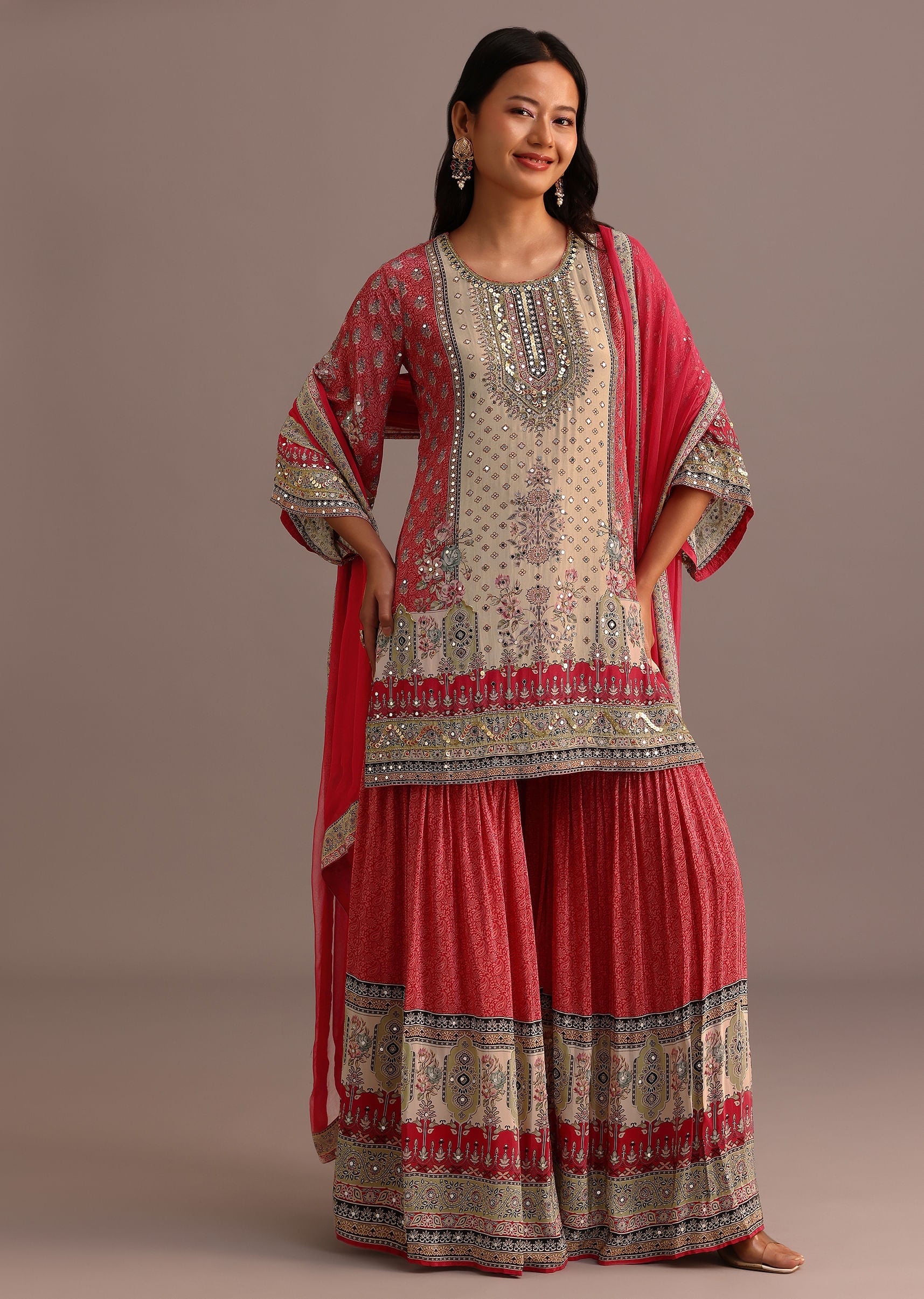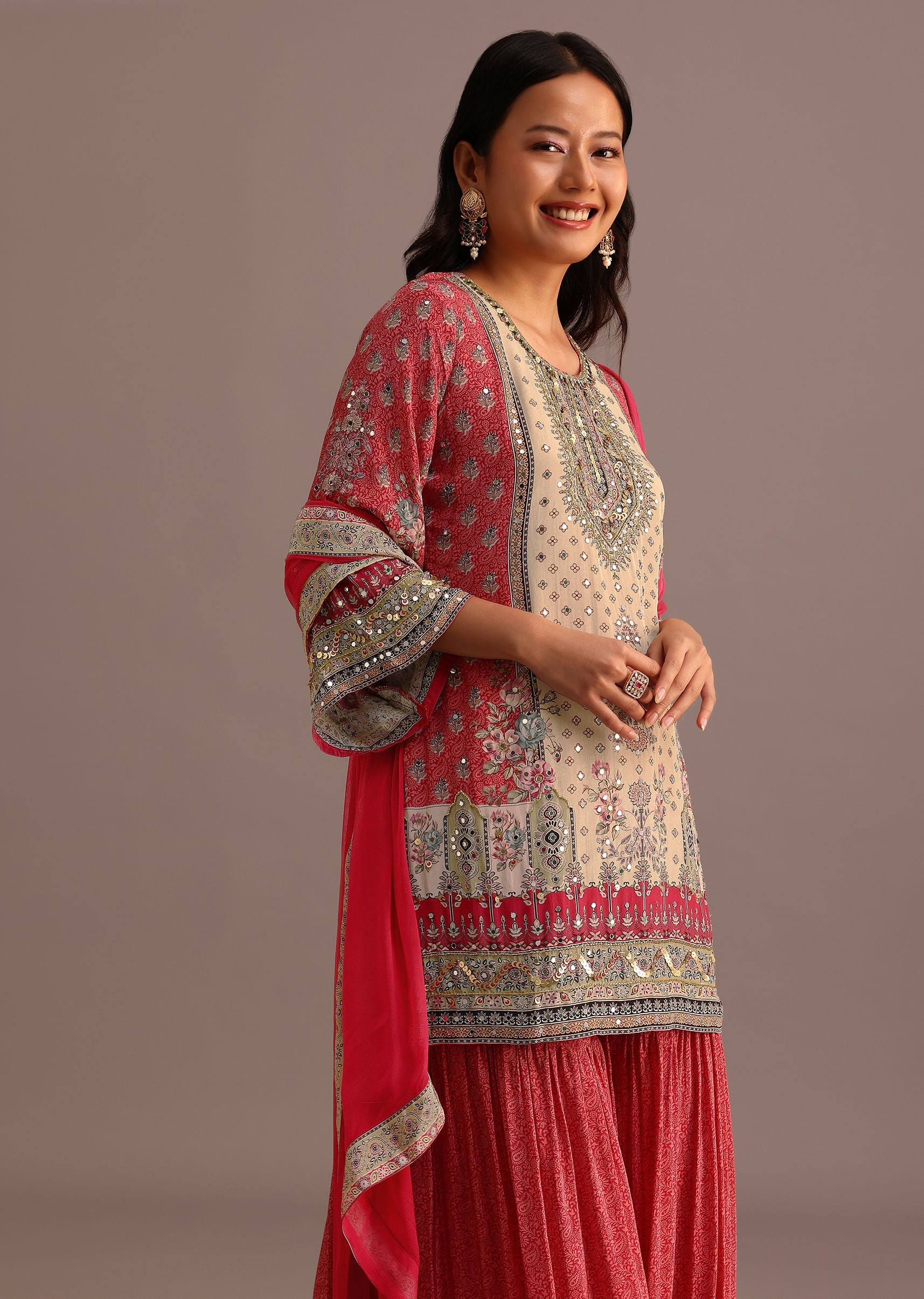 Pink Printed Kurti Sharara Suit With Chiffon Dupatta