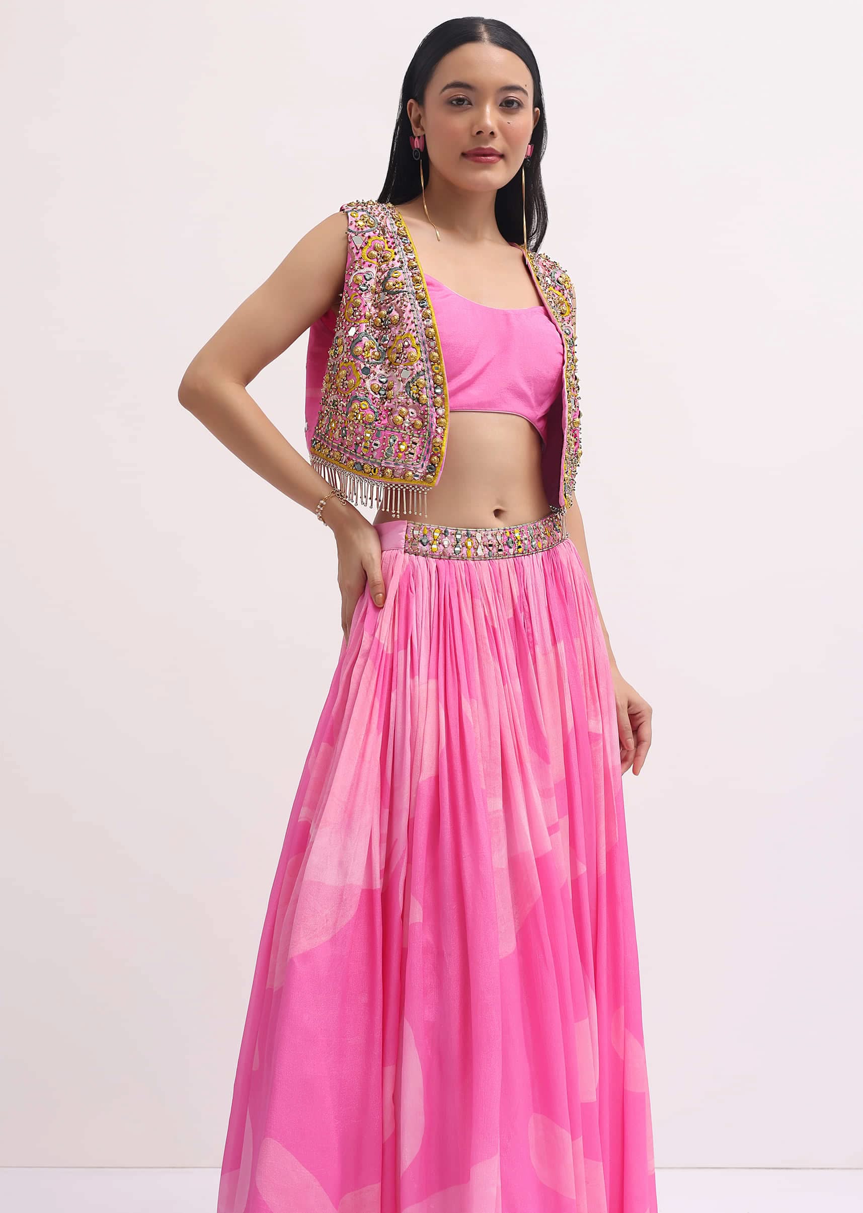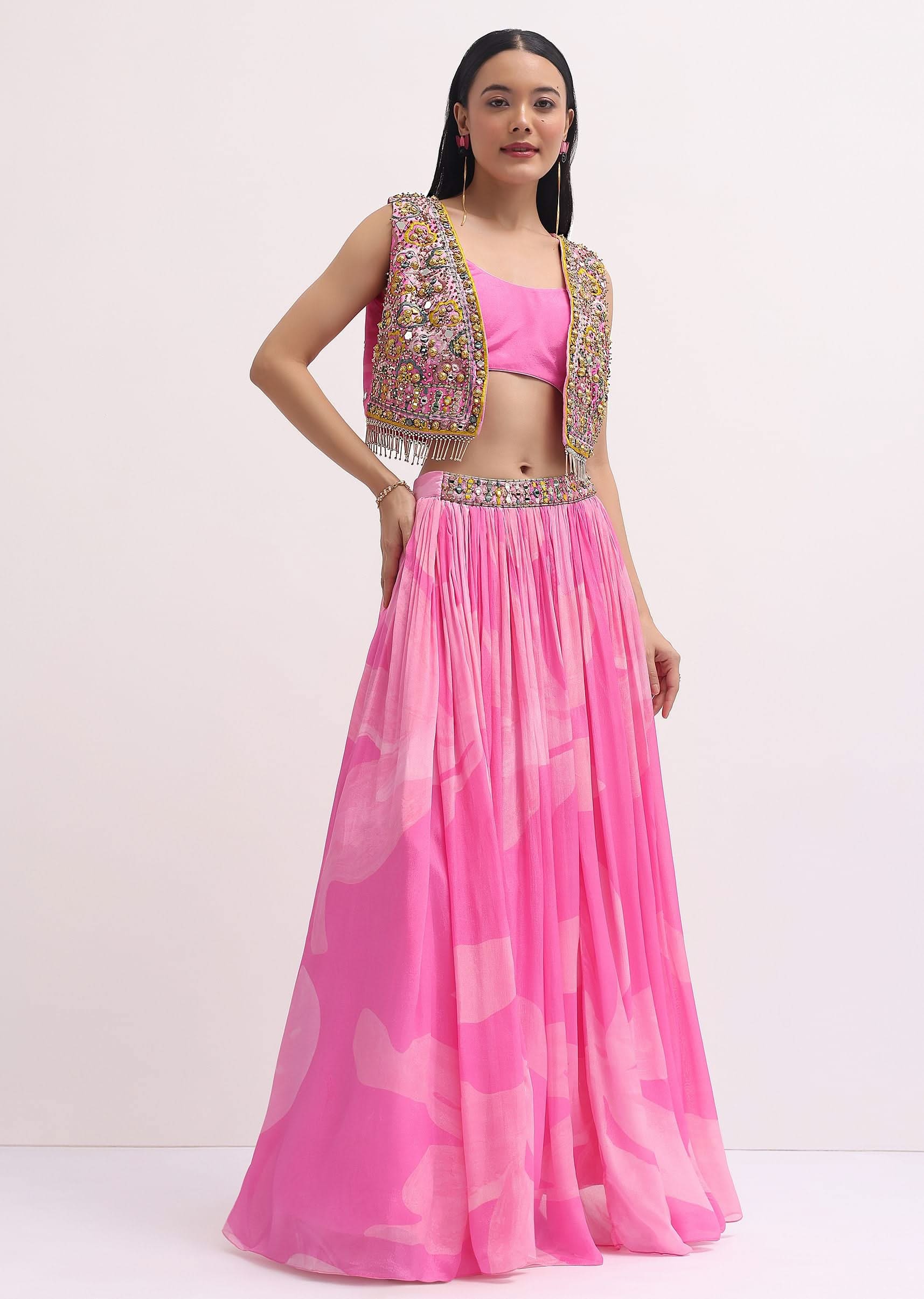 Pink Printed Lehenga Choli With Embroidered Jacket