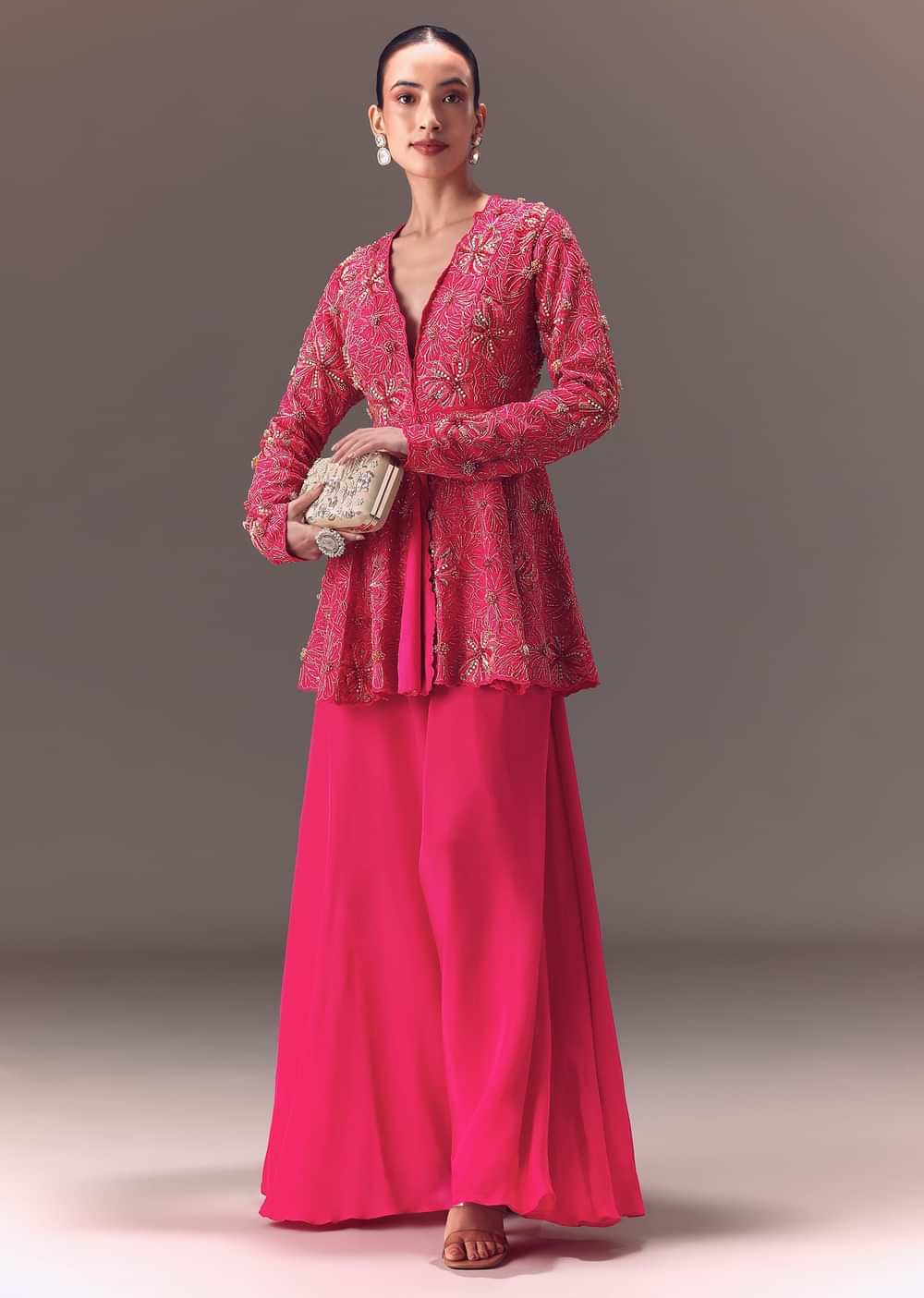 Flaunt your exquisite fusion style with our eyecatching hot pink top and palazzo set. Adorned with intricate hand embroidery showcasing glittery accents that display floral motifs. Crafted from a rich... More Product Details