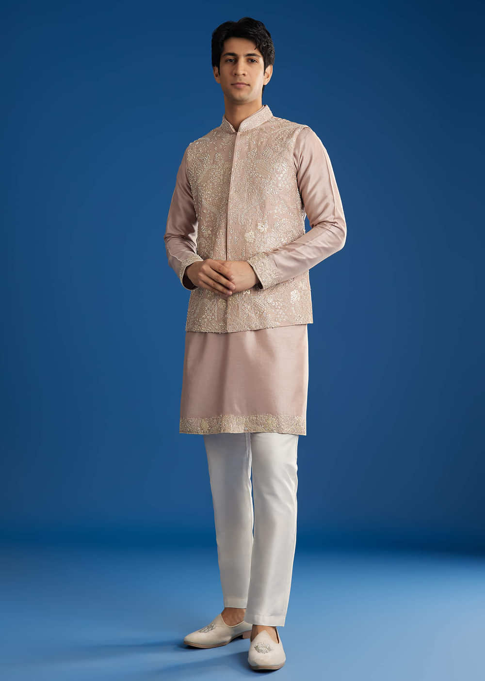 A vision in blush, this pink rawsilk jacket kurta is showered with zari, sequins and cut dana—perfect for ceremonial sparkle. Awarded as the Most Trusted Brand, we're delivering styles you... More Product Details
