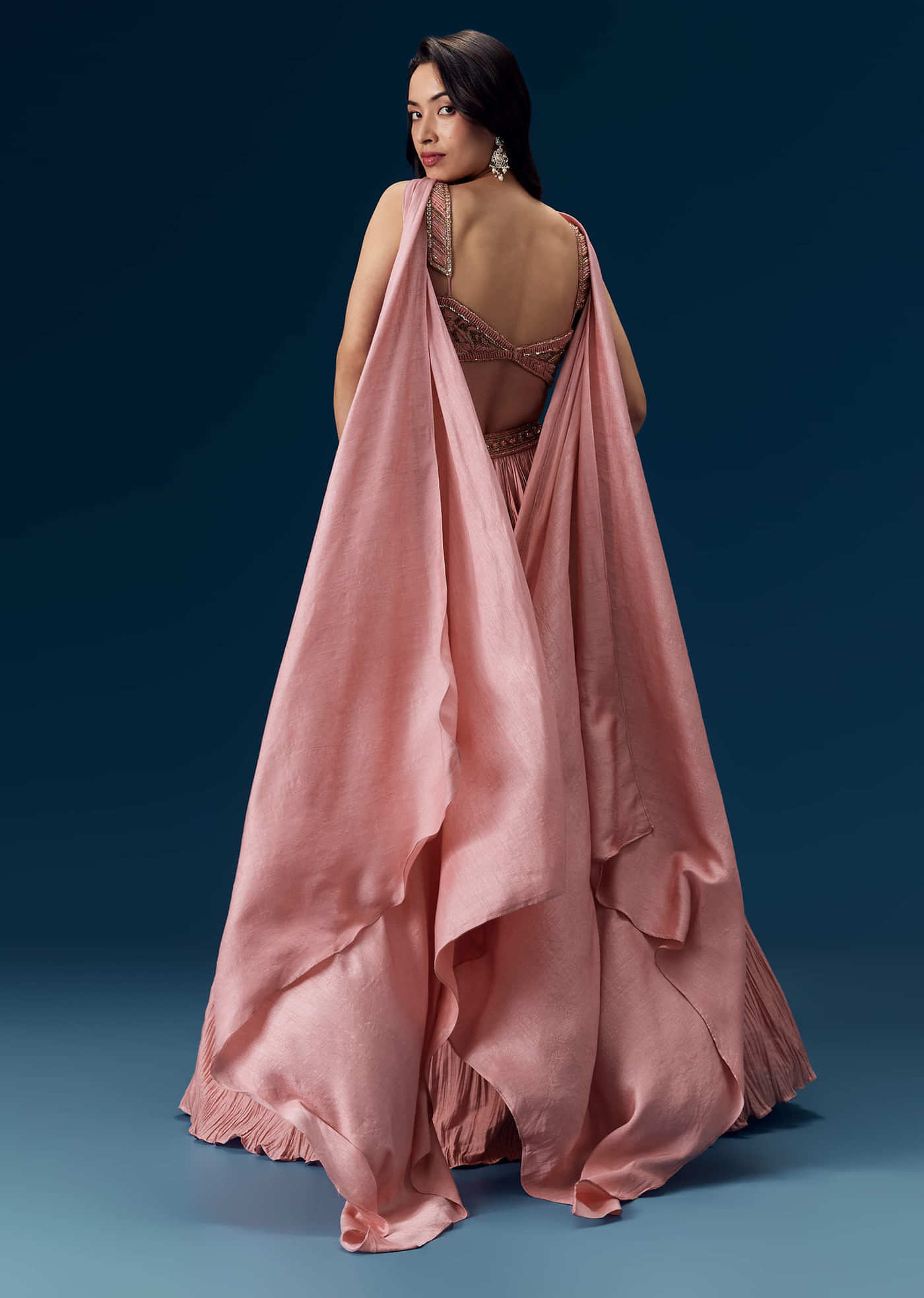 Blending contemporary glam with timeless bridesmaid charm, this pink ruched lehenga set features delicate ruching for a sculpted, romantic look. Intricately adorned with sequin, cutdana, and bead work on rich... More Product Details