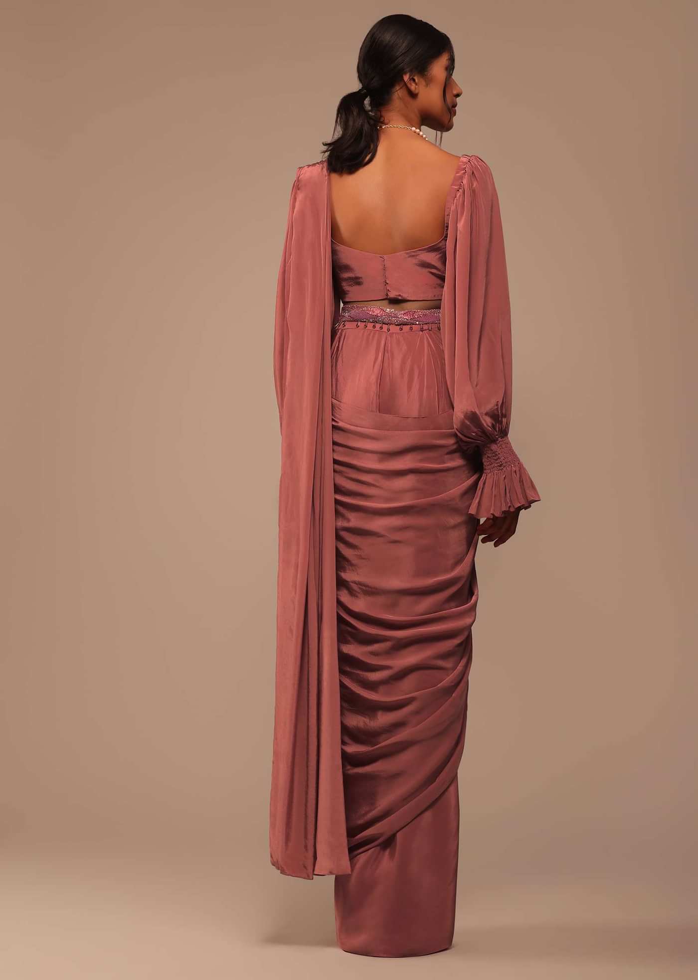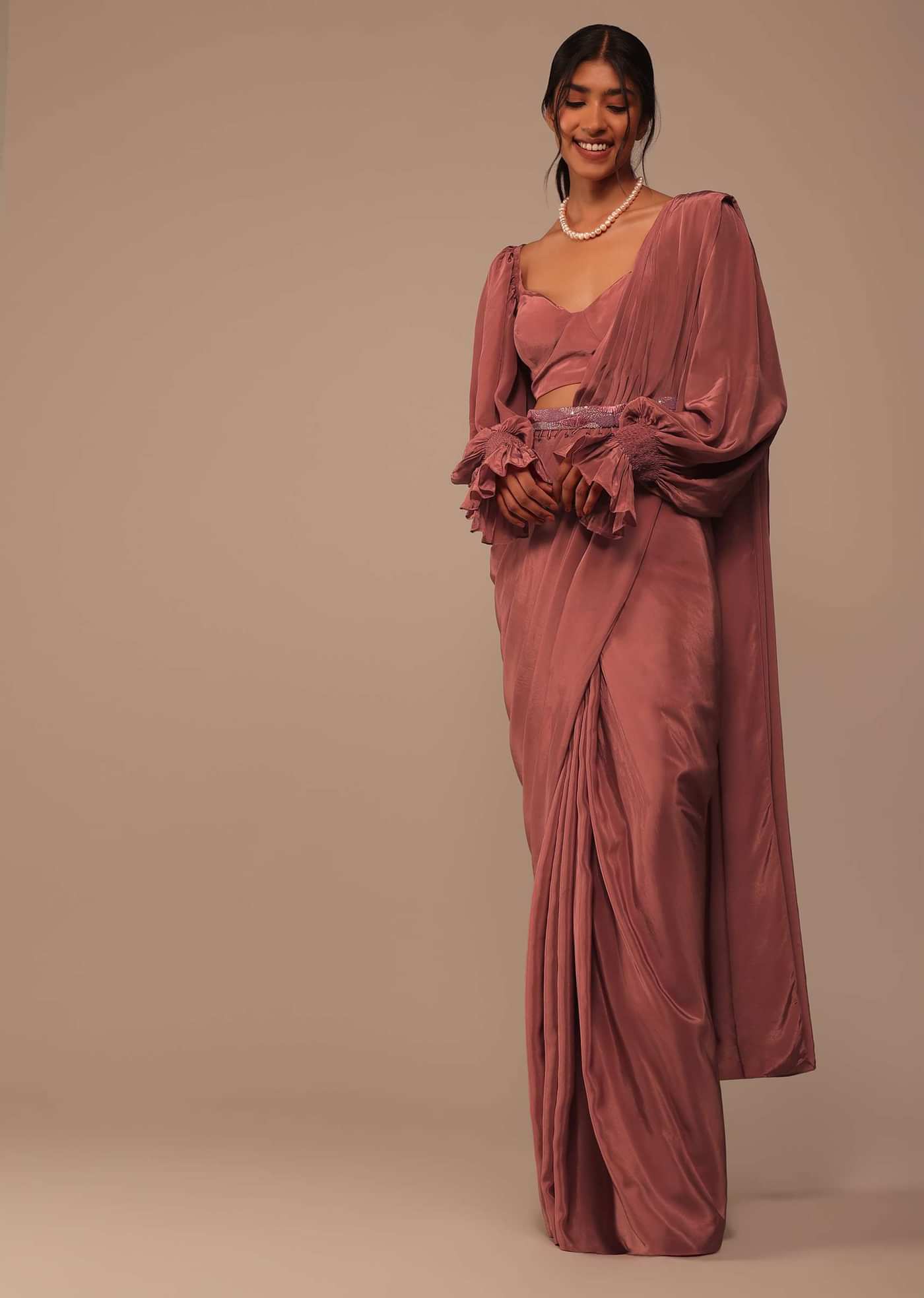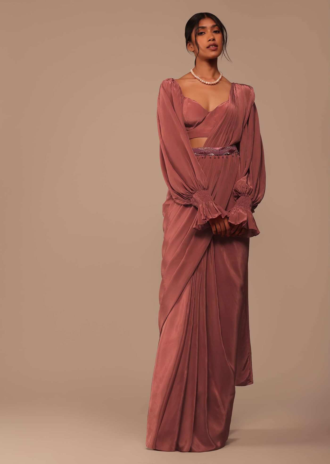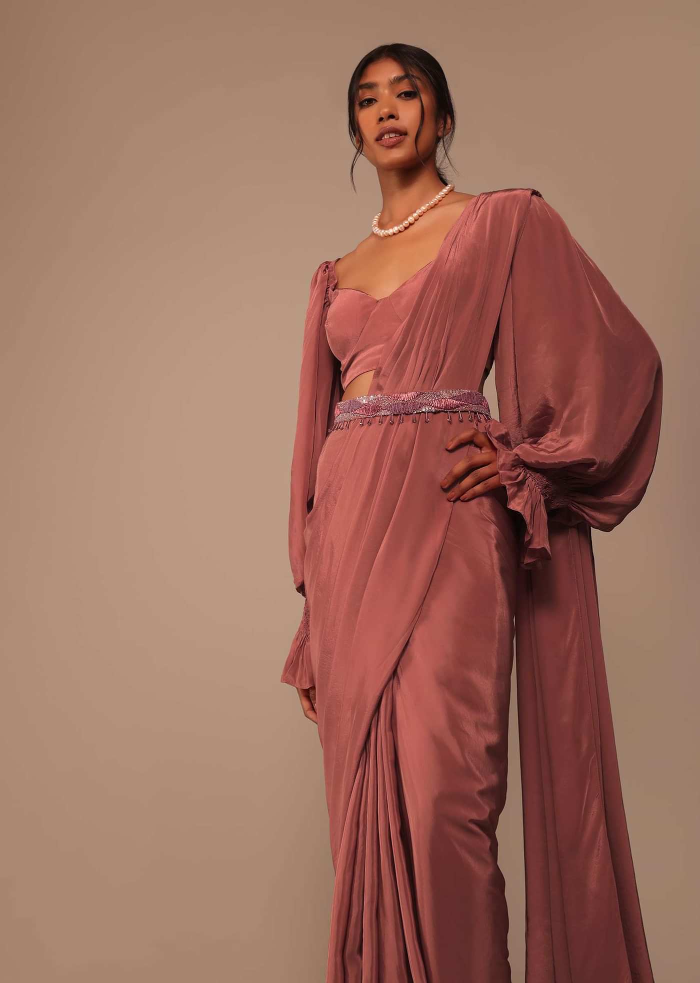 Pink Saree With Lantern Sleeved Blouse And Hand Worked Belt