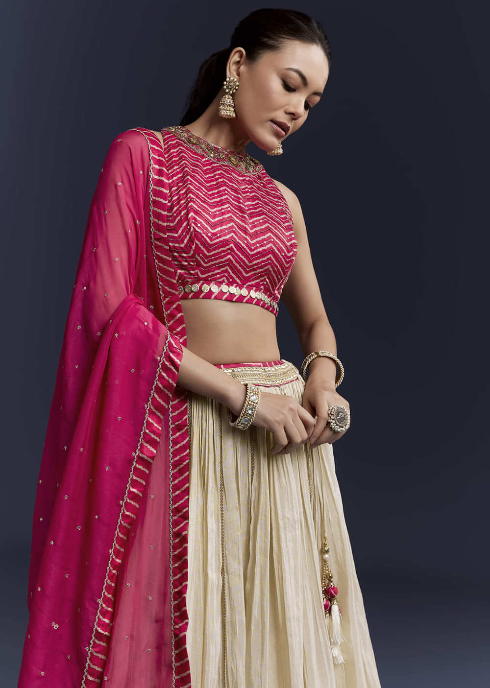 Vivid and modern, this pink and cream satin bridesmaid lehenga shows off a hand-dyed chevron choli that catches the eye with every turn. The choli is finished with sequins and cut dana hand work, and the coordinated lehenga with a matching dupatta ties everything together. You will look right for a mehendi or sangeet event. Awarded as the Most Trusted Brand, we're delivering styles you love, just as promised.