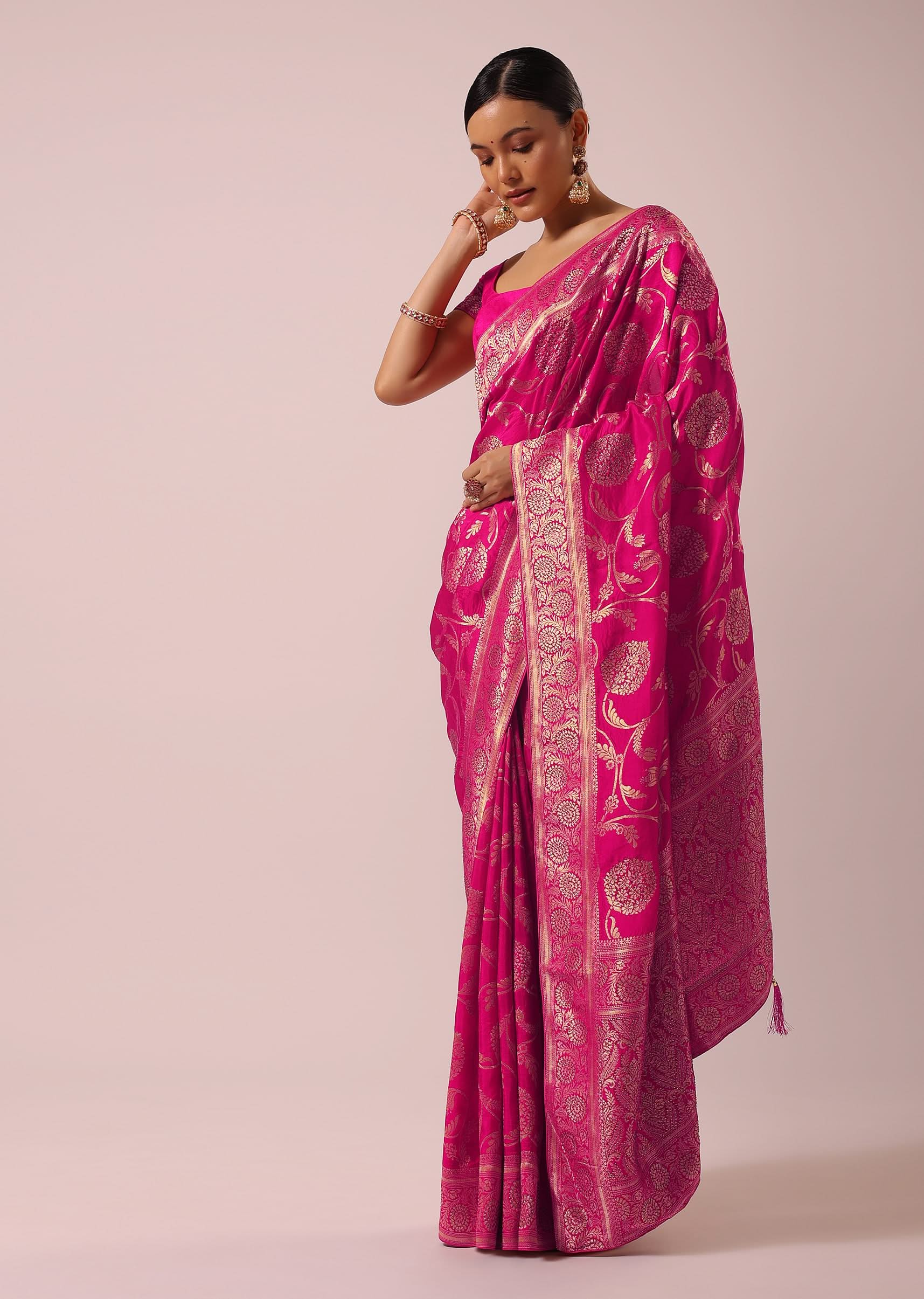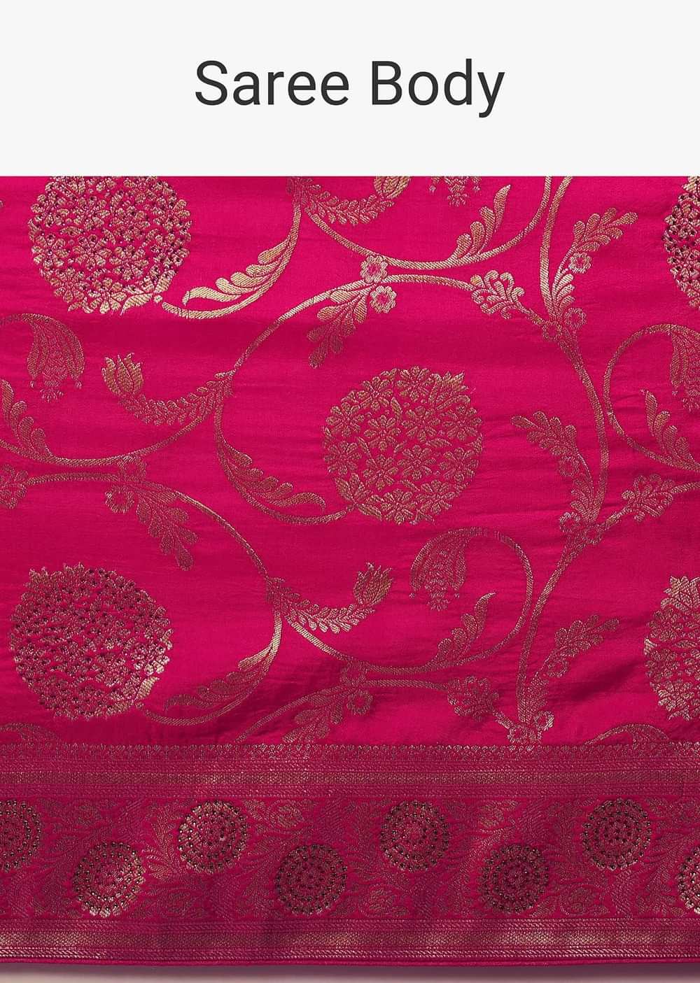 A captivating medley of old-world charm and stunning hues, this saree flaunts of exquisite floral woven motifs in a jaal pattern. Designed on a luxurious base, comes with an unstitched blouse piece in silk and satin organza fabric, this addition ensures you emanate a regal charm wherever you go. From receptions to weddings, don this saree for a stunning look.The blouse worn by the model is designed for styling purposes. Awarded As The Most Trusted Brand We'Re Delivering Styles You Love Just As Promised.