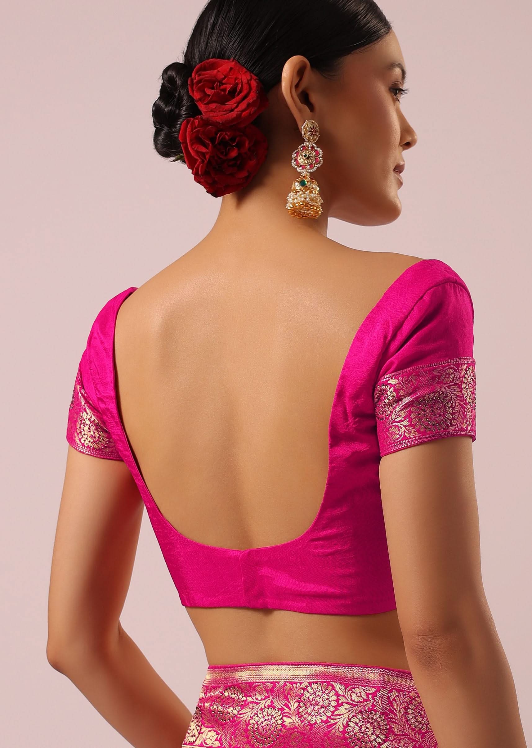 Kaan chain pearl-drop jhumkas and Kundan bangles add to its elegant vibe.