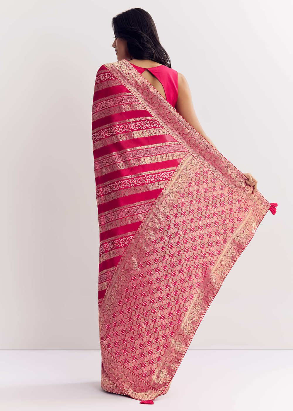 Flushed in festive pink, this satin saree gleams with zari vine motifs—crafted to turn heads with every sway. Awarded as the Most Trusted Brand, we're delivering styles you love, just... More Product Details
