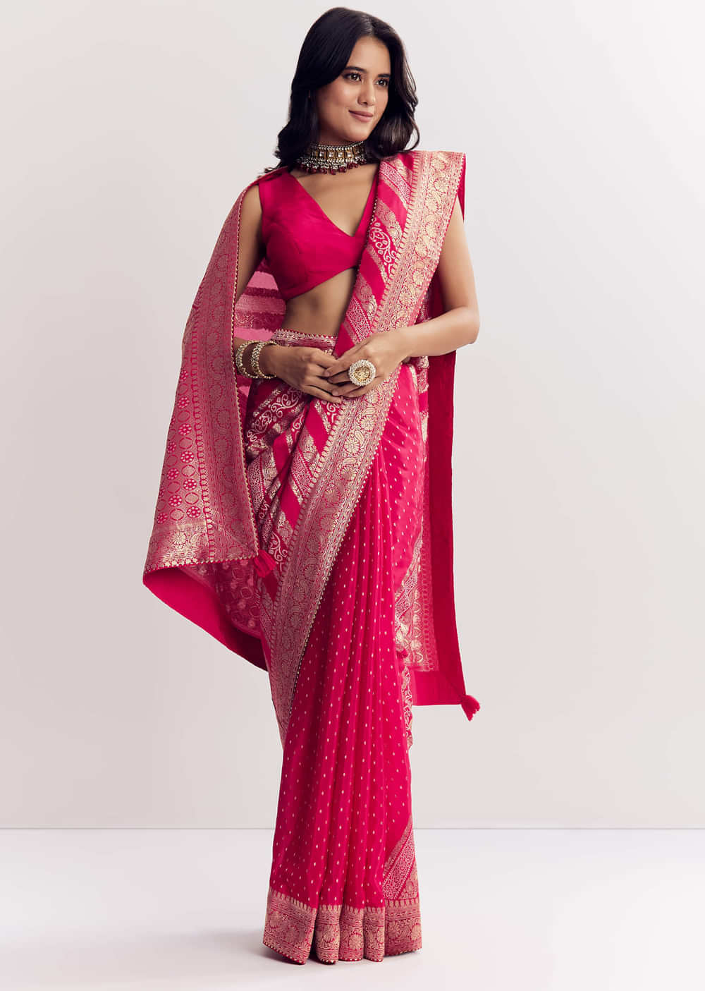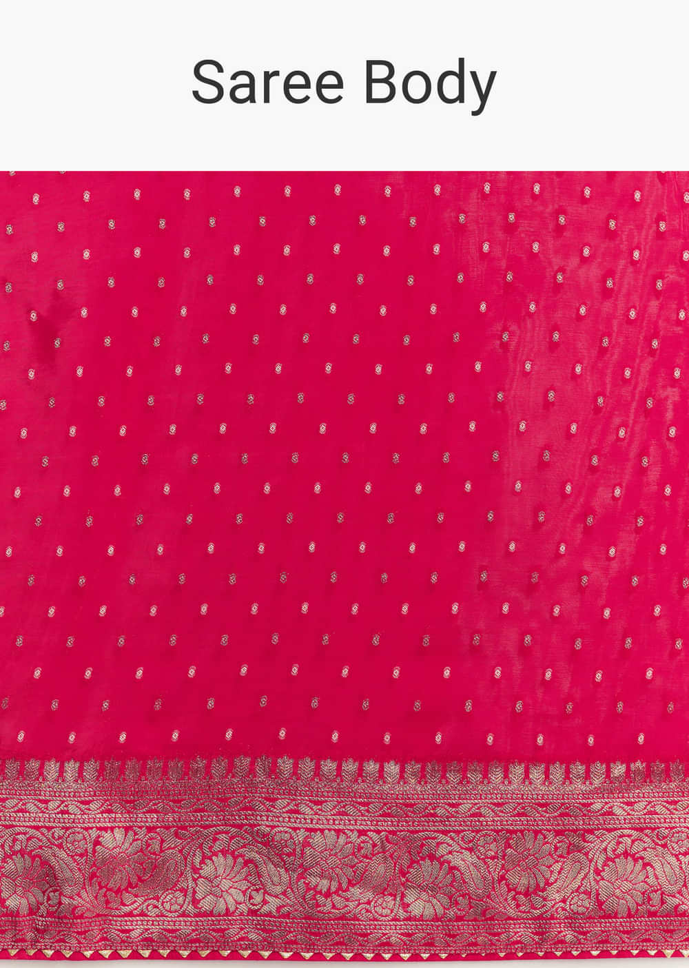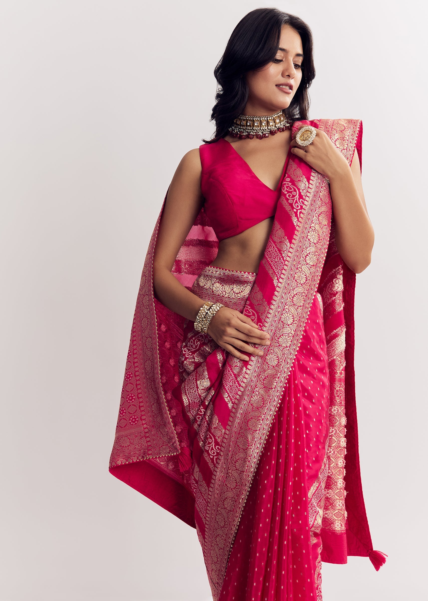 Flushed in festive pink, this satin saree gleams with zari vine motifs—crafted to turn heads with every sway. Awarded as the Most Trusted Brand, we're delivering styles you love, just as promised.