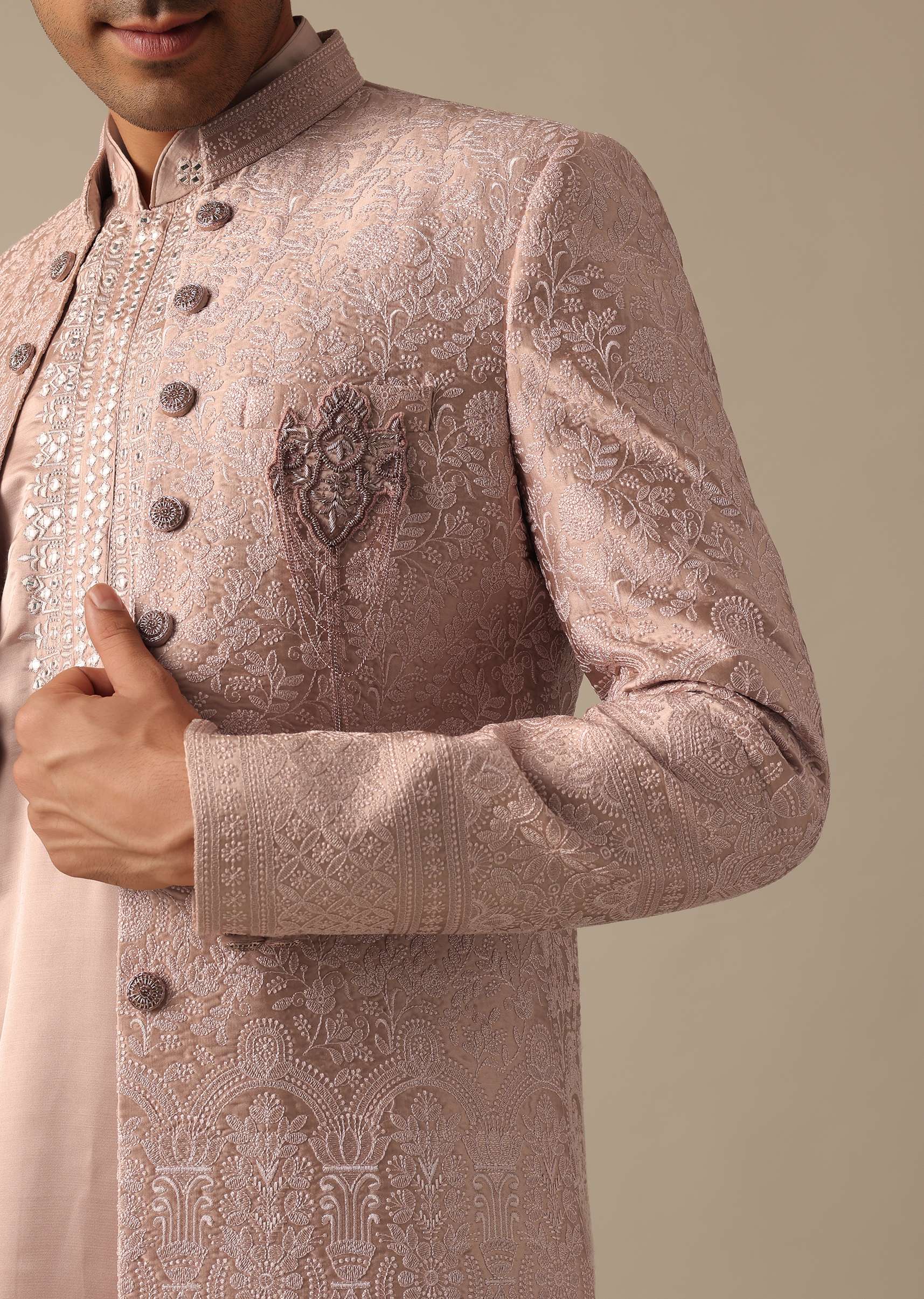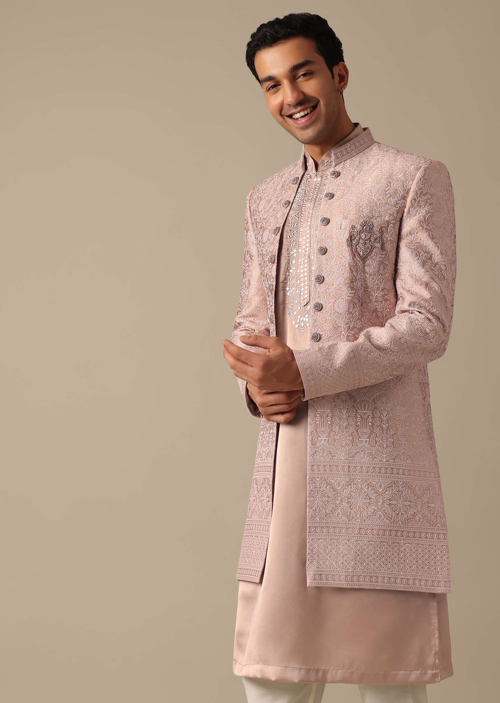 Showcase your individualistic style and personality with this opulent sherwani set. Fabricated on rich satin silk, it is enhanced on a vibrant pink hue. Decked with striking embroidery, the sherwani... More Product Details