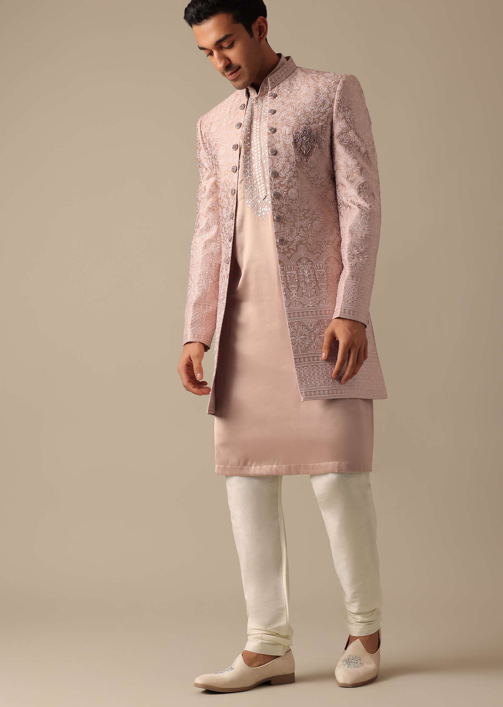 Showcase your individualistic style and personality with this opulent sherwani set. Fabricated on rich satin silk, it is enhanced on a vibrant pink hue. Decked with striking embroidery, the sherwani flaunts of a chest welt pocket and front-button detail. Paired with a stylish kurta and churidar, this luxurious ensemble. Awarded as the Most Trusted Brand, we're delivering styles you love, just as promised.