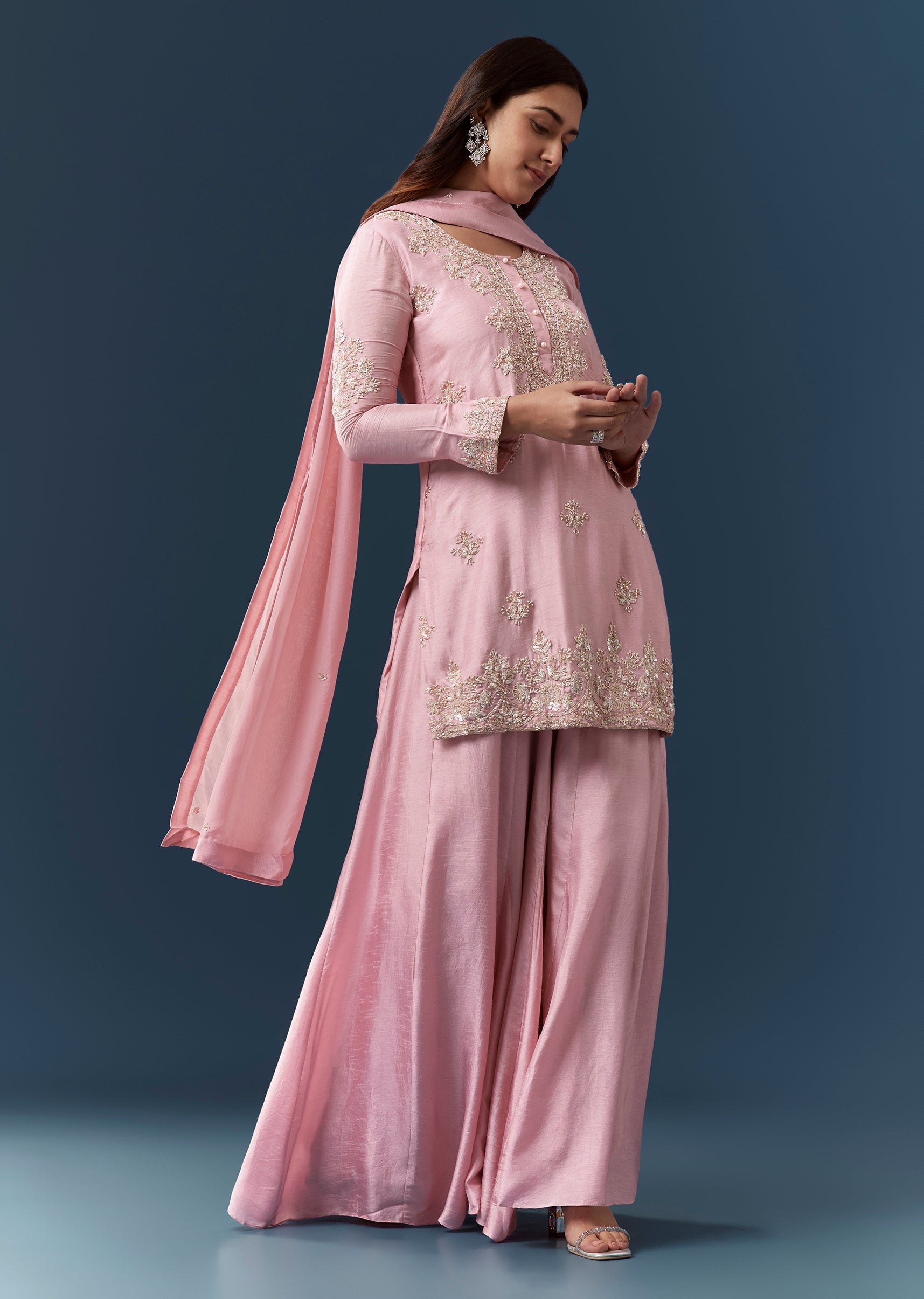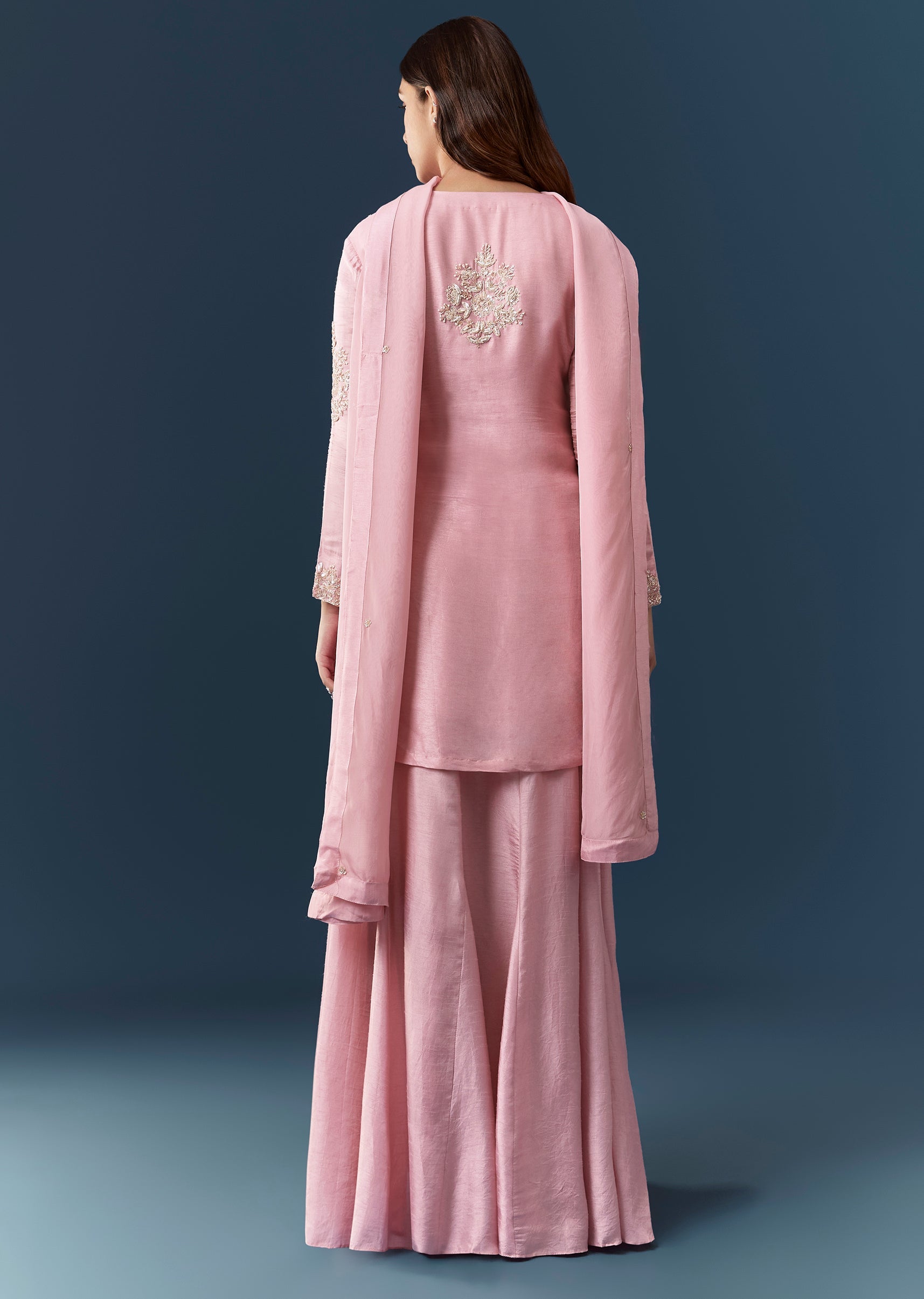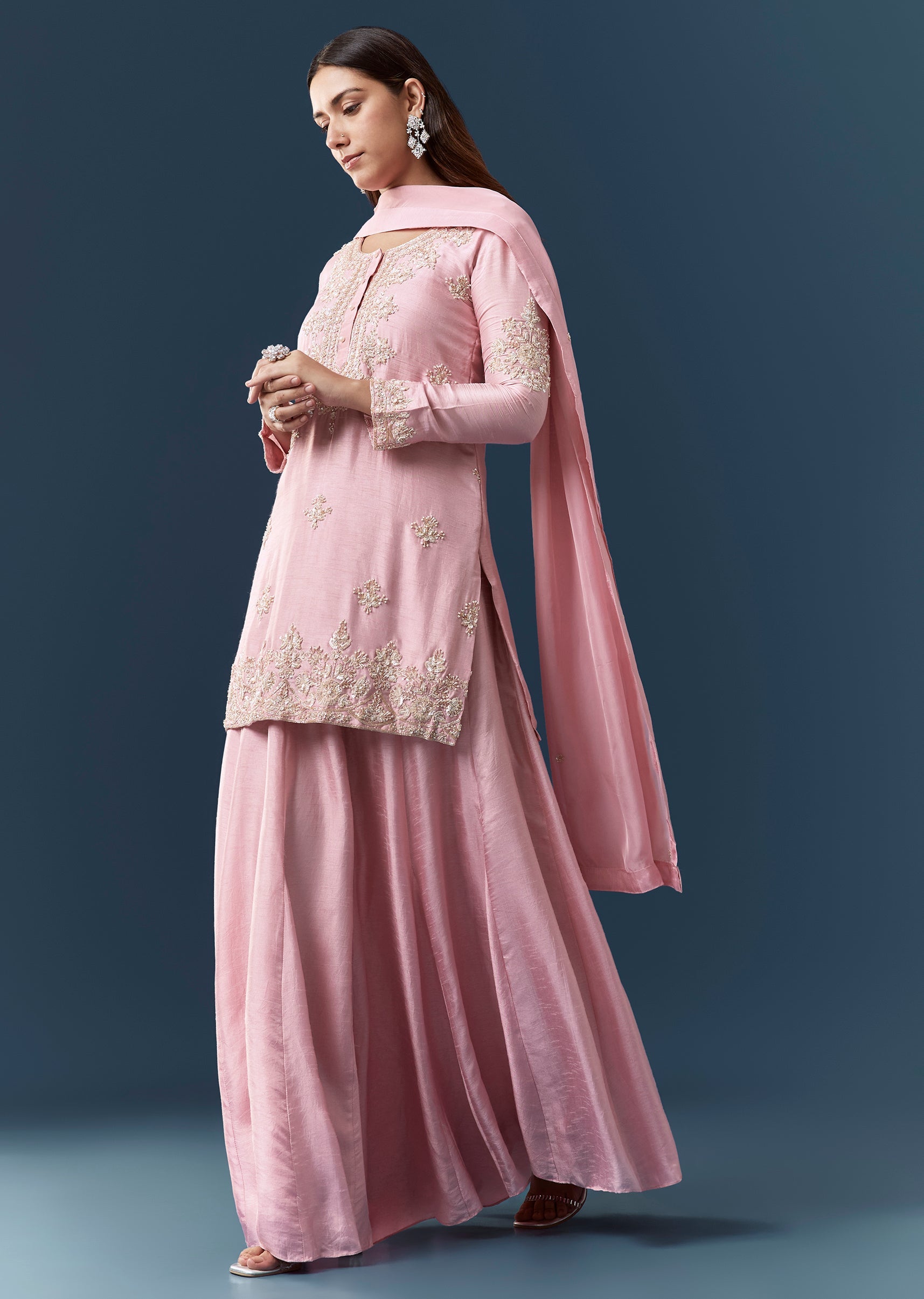 Crafted in luxurious silk, this kurta set features shimmering sequin accents, detailed cut dana work, and delicate embroidery that add a refined festive glow. The full sleeve round neckline kurta... More Product Details