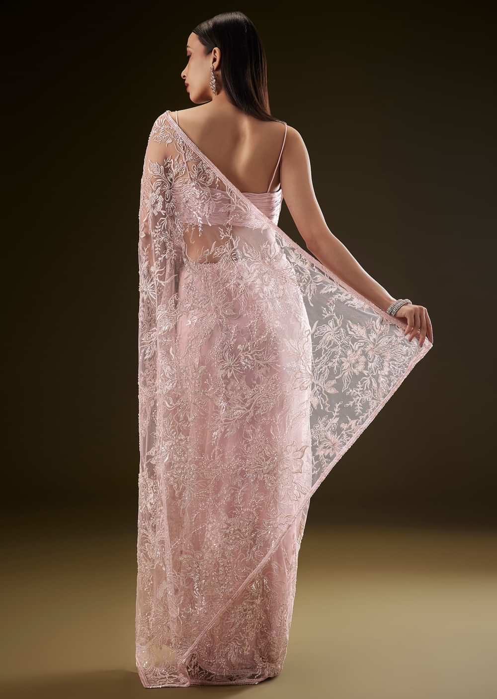 Step Into A World Of Ethereal Charm With This Pink Ruched Blouse Paired With An Enchanting Fancy Sequins Saree. The Delicate Ruched Detailing On The Blouse Creates A Captivating Silhouette While The Open Saree Drapes Gracefully Shimmering With Every Movement. Adorned With An Attached Lace Border This Ensemble Captures The Essence Of Modern Elegance Blended With Timeless Tradition. Perfect For Cocktail Nights And Festive Soirées It Ensures You Steal The Spotlight Effortlessly.Collar Work May Change Awarded As The Most Trusted Brand We'Re Delivering Styles You Love Just As Promised.