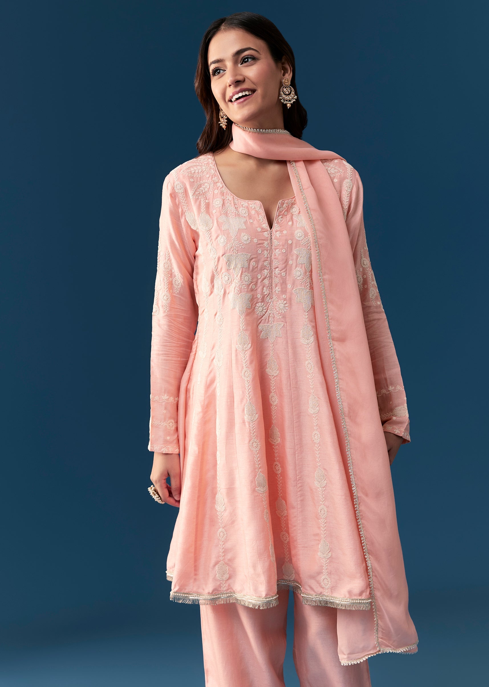 ; This pink anarkali suit features a peplum silhouette inspired by Pakistani style crafted from luxurious silk material. It is beautifully adorned with delicate thread work embroidery enhancing its ethnic... More Product Details