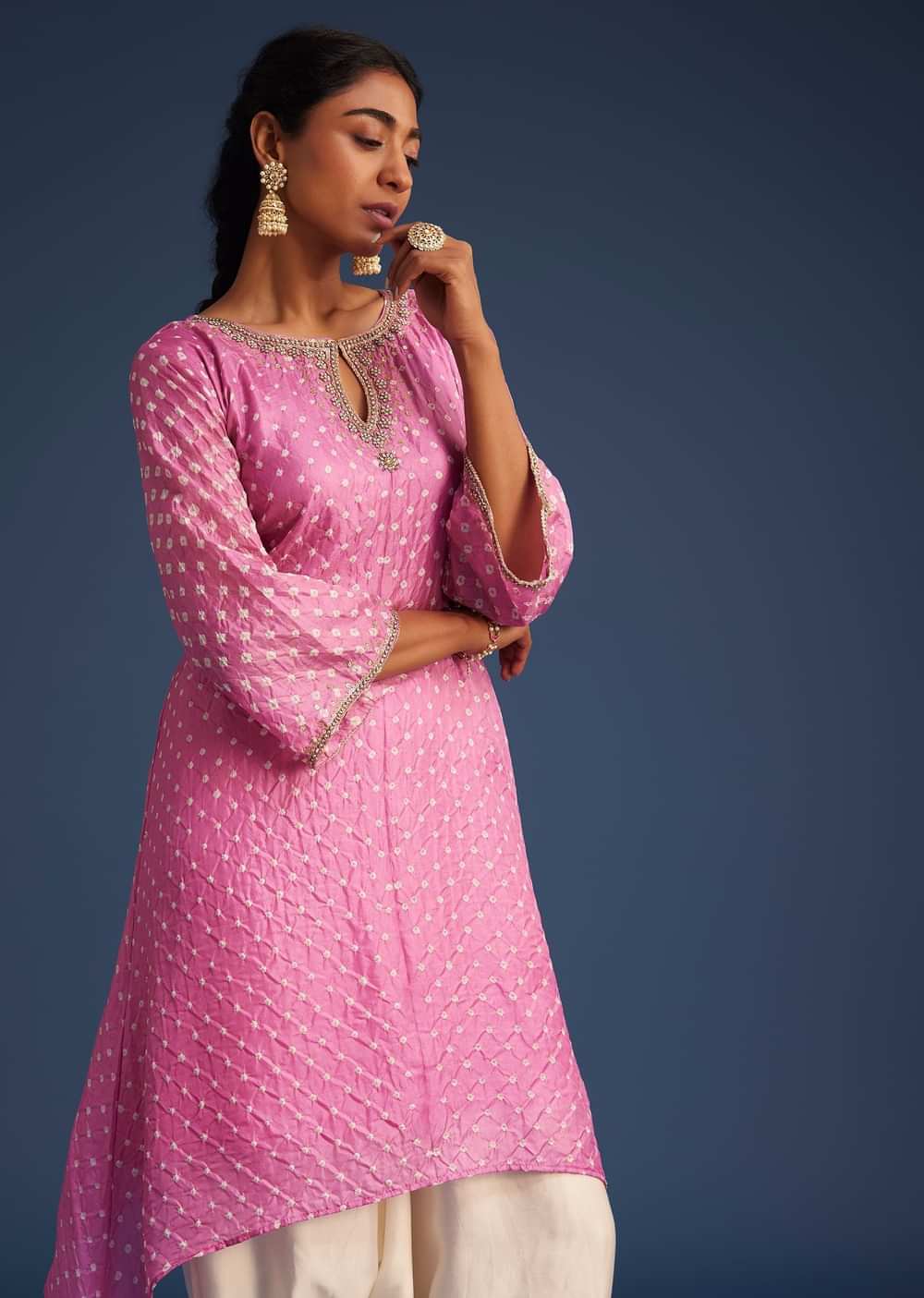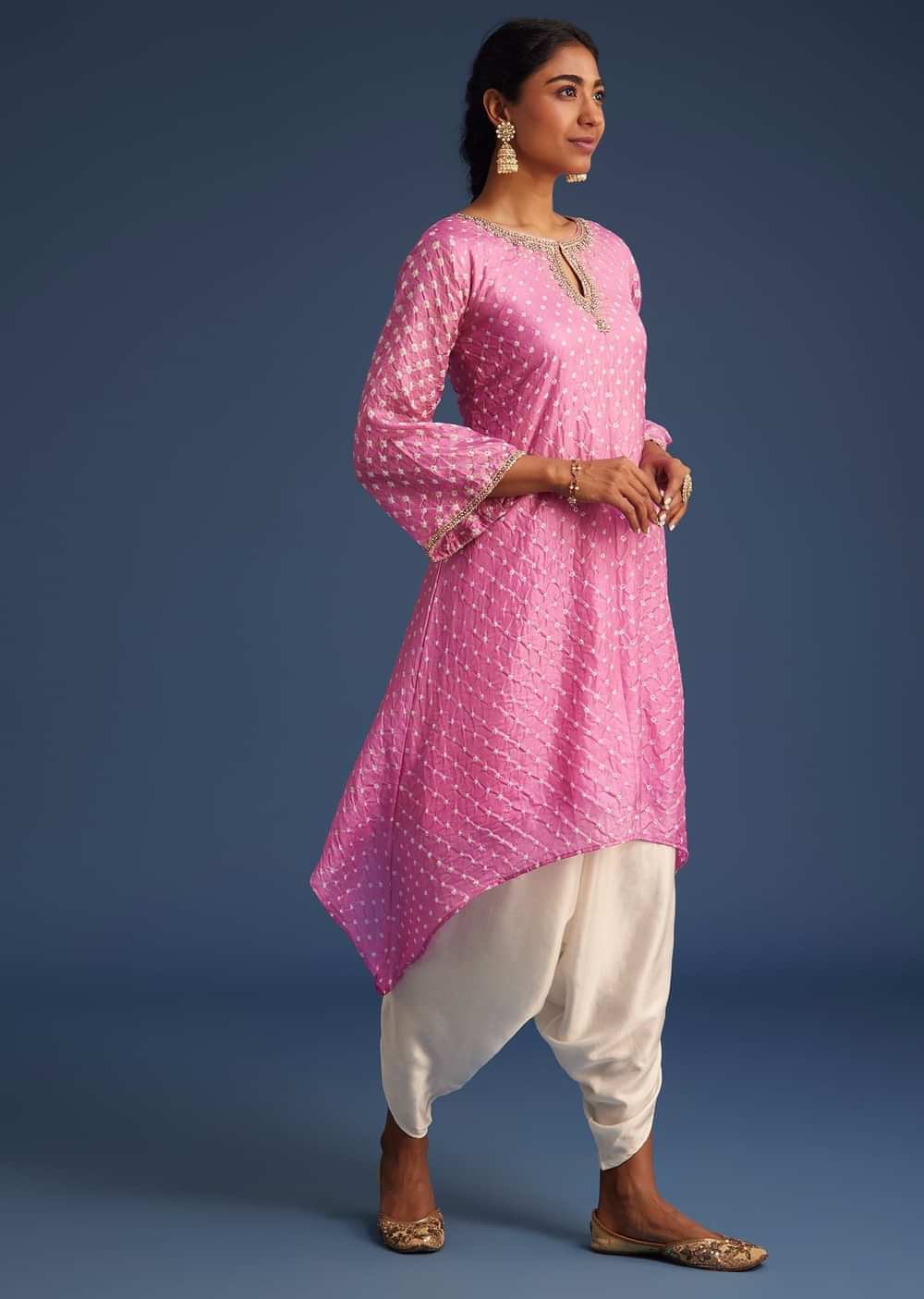 • Embrace Heritage Charm With This Pink Silk Asymmetrical Kurta Dhoti Set Enriched With Bandhani Prints Sequins Moti And Zardosi Embroidery.