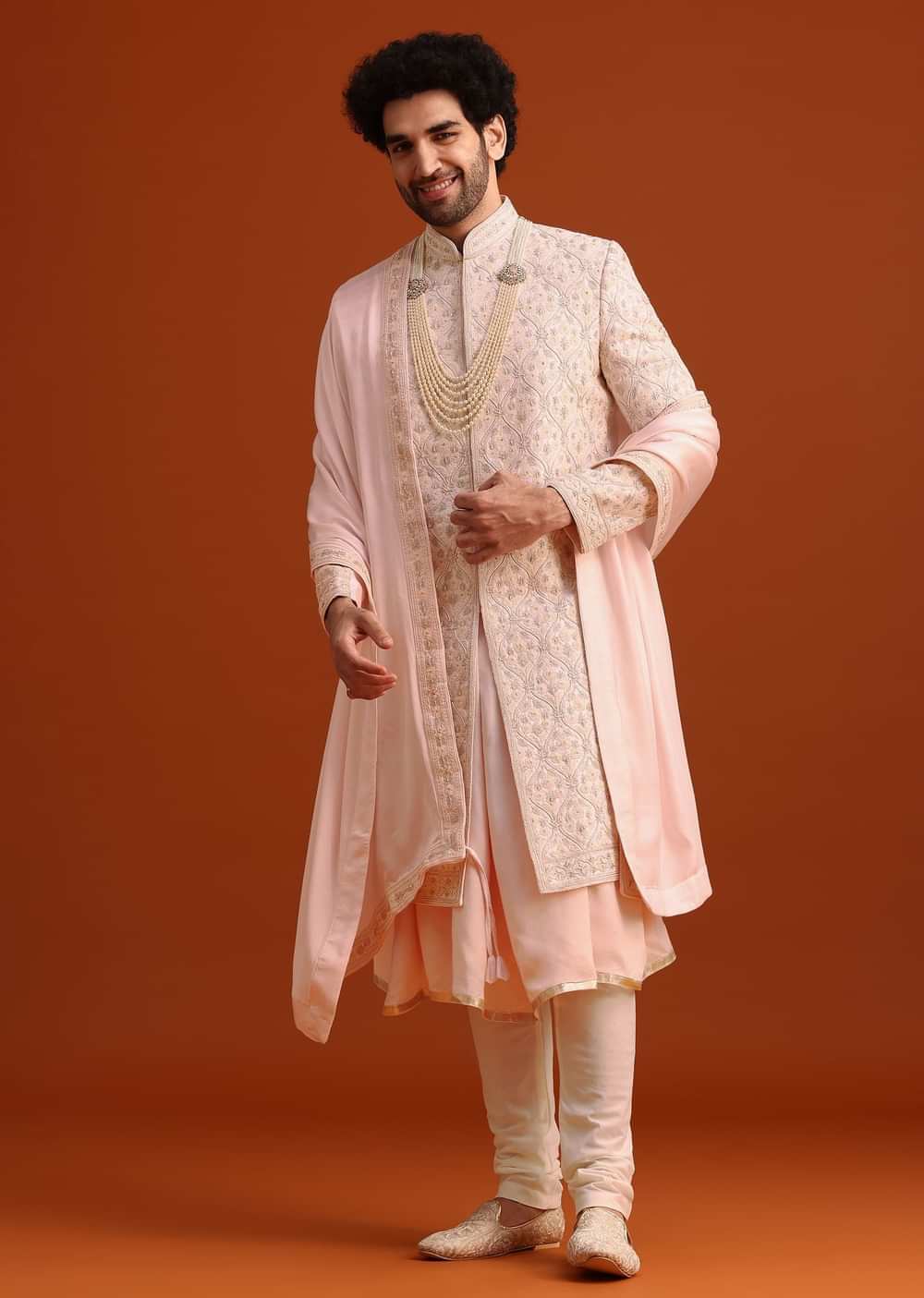 Showcasing a timeless masterpiece that will help you exude charm and sophistication is this pink sherwani set. Tailored from rich silk the sherwani boasts a mandarin collar and full sleeves. Adorned with exquisite artistry and heavy thread embroidery this grandeur set is completed with a kurta coordinating bottoms and a dupatta. Awarded as the Most Trusted Brand, we're delivering styles you love, just as promised.