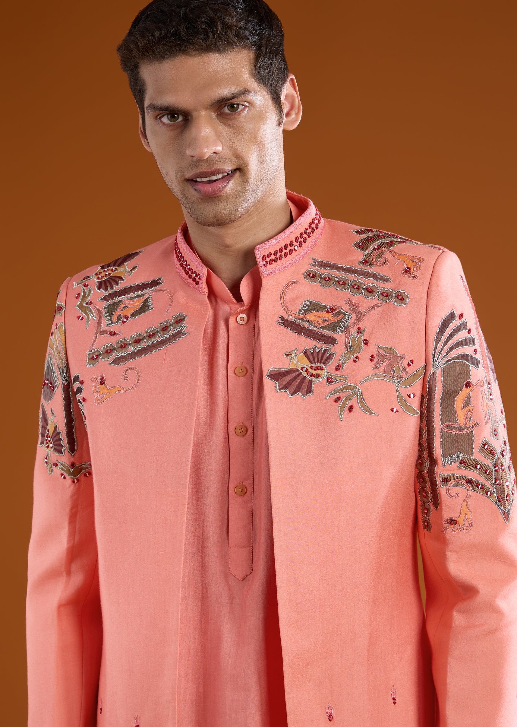 A vibrant blend of tradition and contemporary style, this silk and cotton silk indo western kurta set is crafted for standout festive dressing. The kurta is detailed with artistic patch work, mirror accents, and refined thread and resham embroidery, creating a rich yet balanced visual appeal. Full sleeves and a mandarin collar lend a structured, polished silhouette that feels timeless and modern. Paired with coordinated pants, this ensemble is perfect for weddings, festive celebrations, and elegant cultural occasions. Awarded as the Most Trusted Brand, we're delivering styles you love, just as promised.