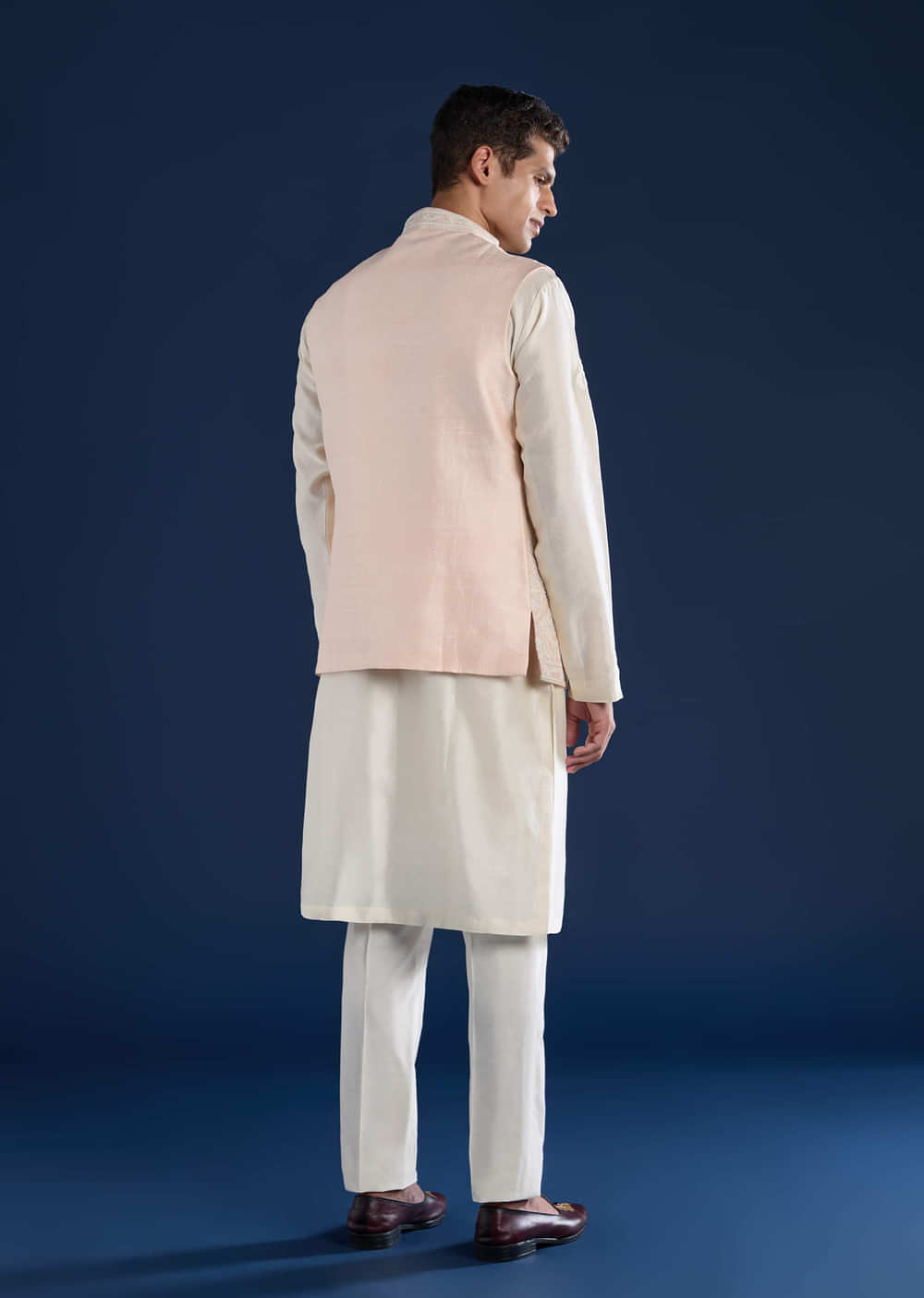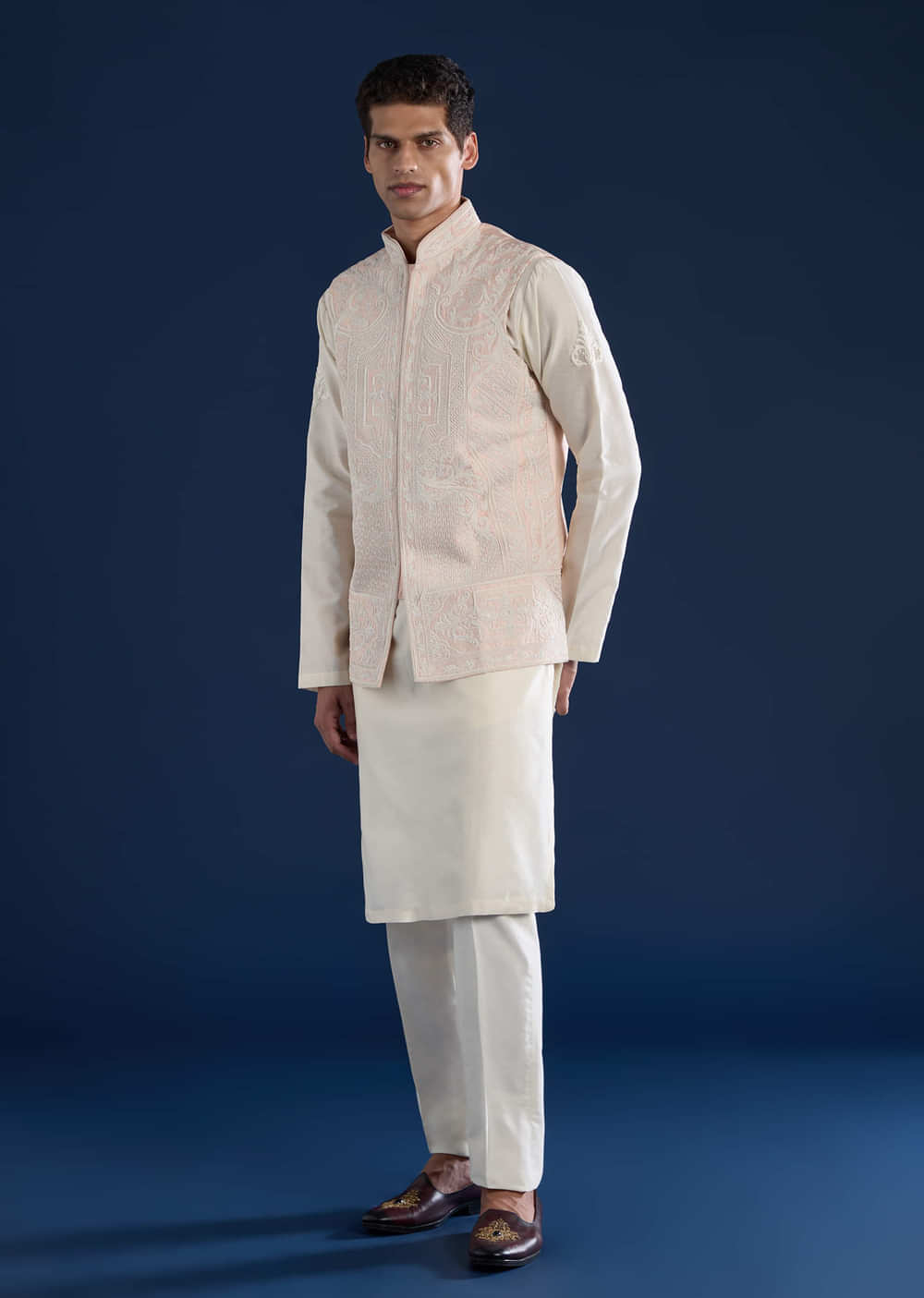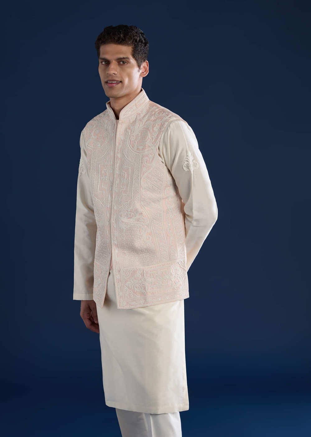 Soft, sophisticated, and full of grace, this pink silk jacket and kurta set redefines festive elegance. The lustrous silk fabric radiates subtle sheen, while intricate dori embroidery adds delicate texture... More Product Details