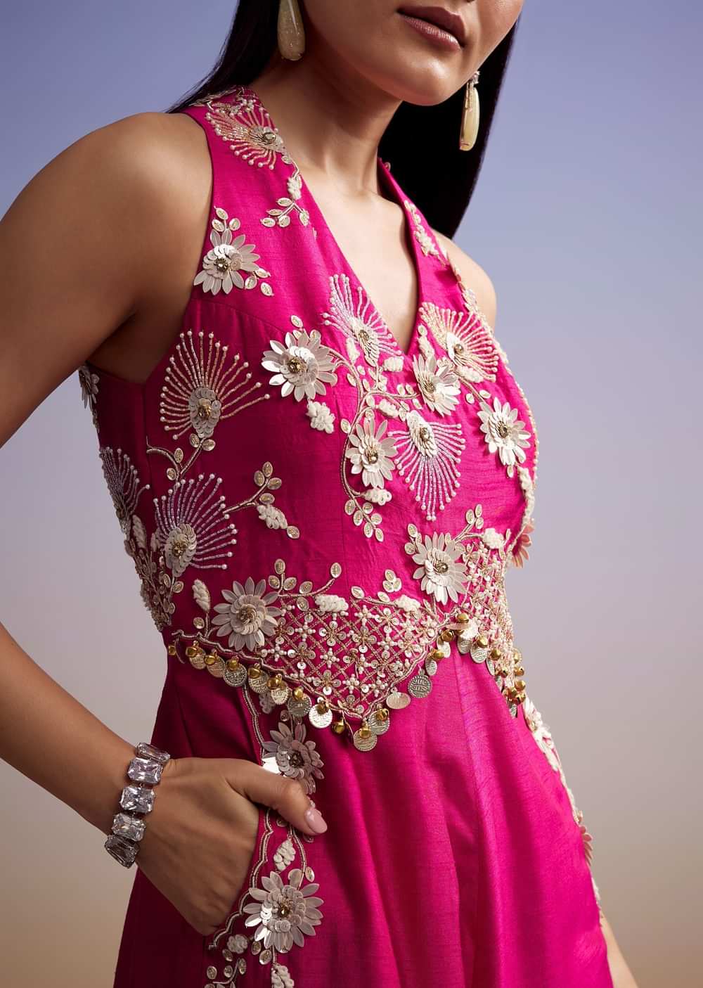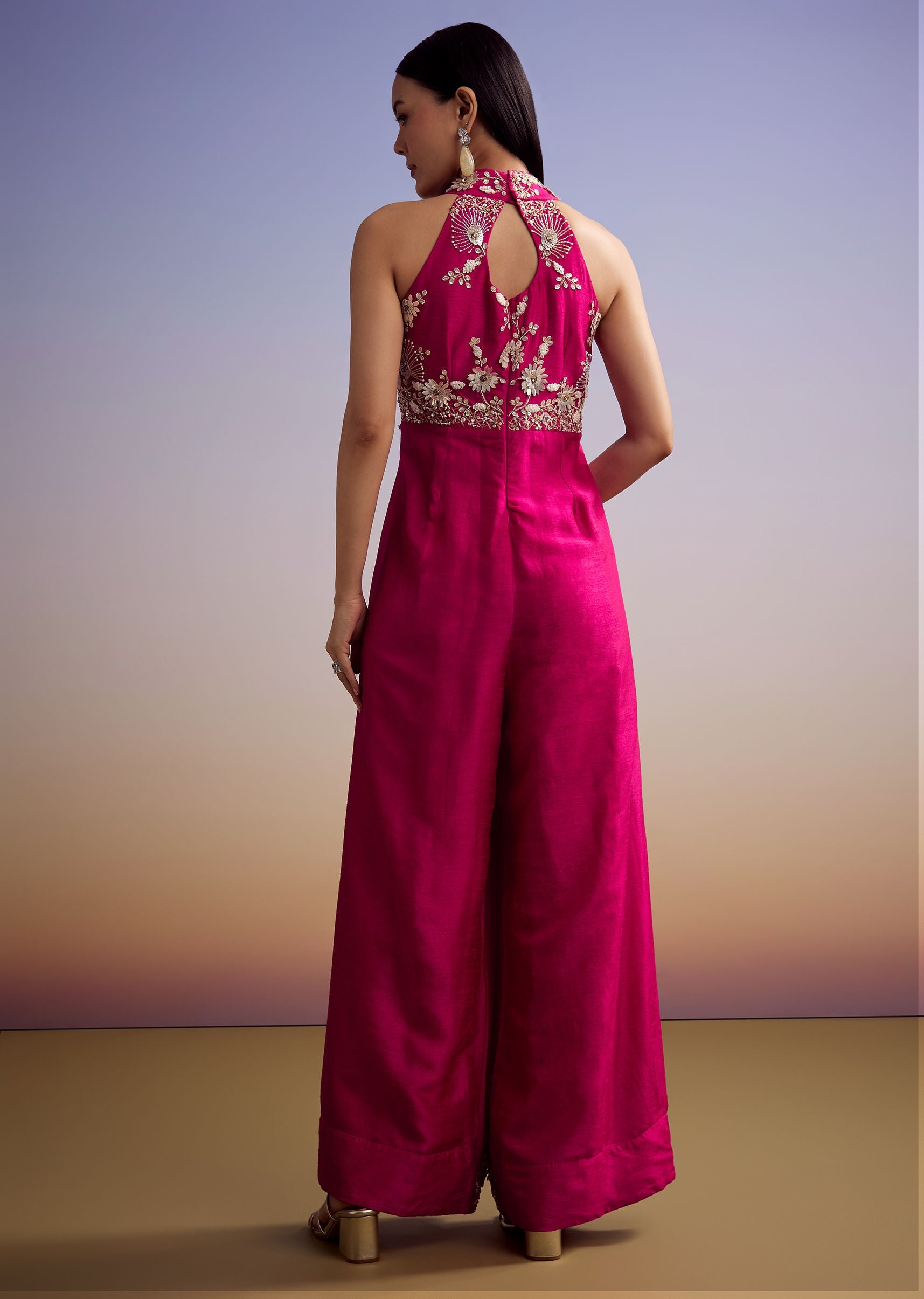 This pink embroidered jumpsuit brings together elegance and ease in a modern silhouette. Made in silk fabric with a sleeveless cut and a deep V neckline, it’s designed for those... More Product Details