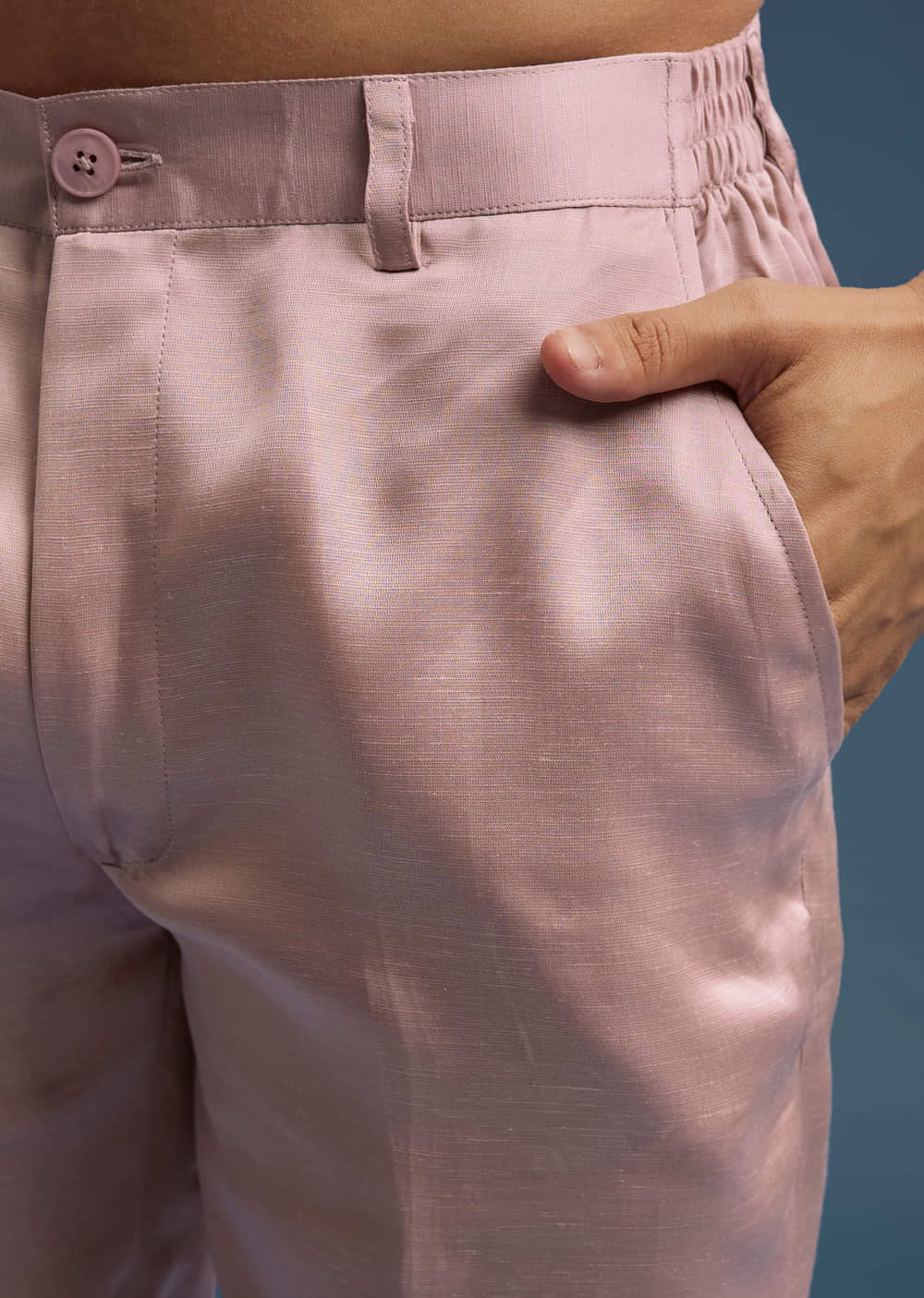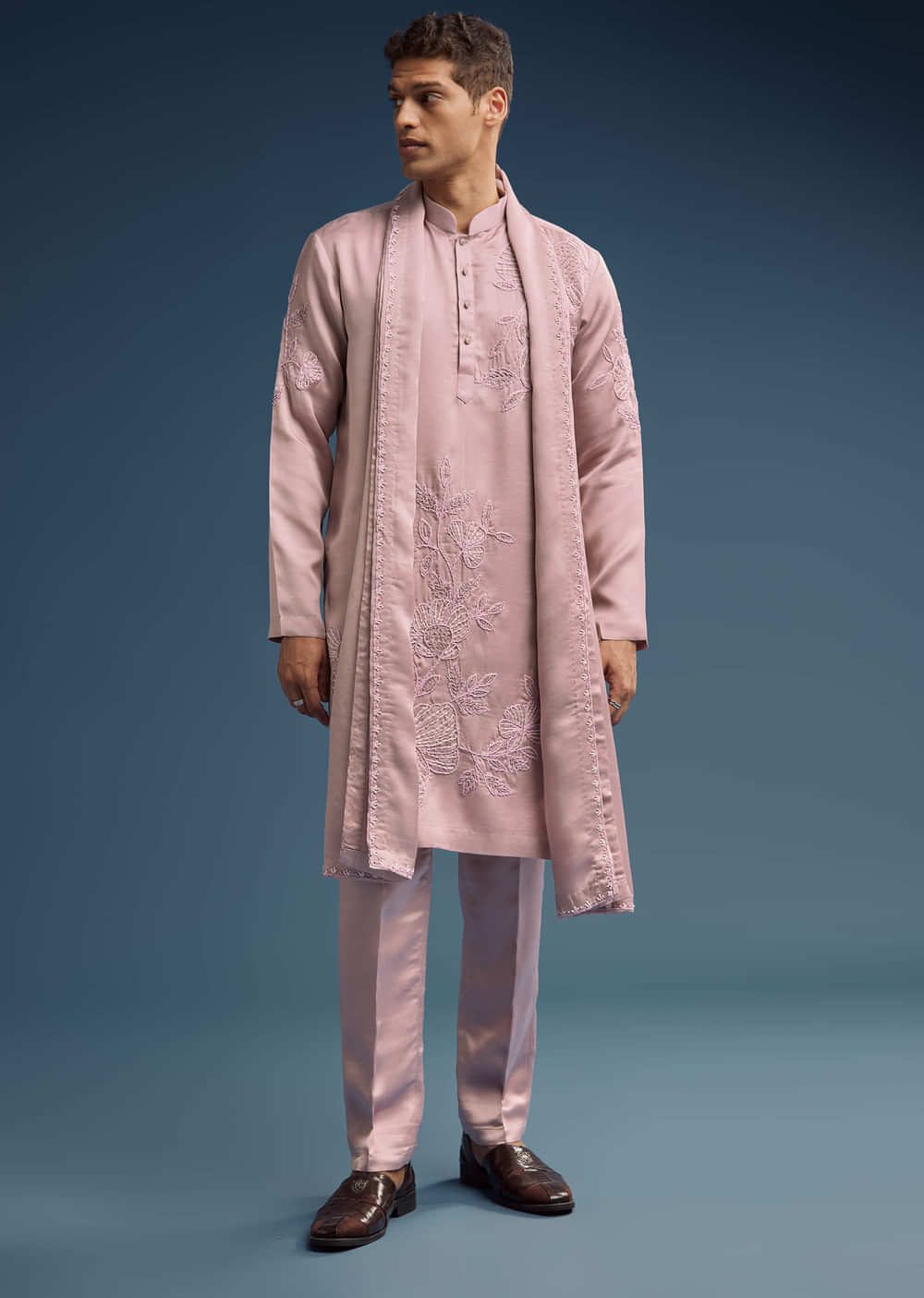 Pink Silk Kurta Set For Men With Hand Done Thread Work