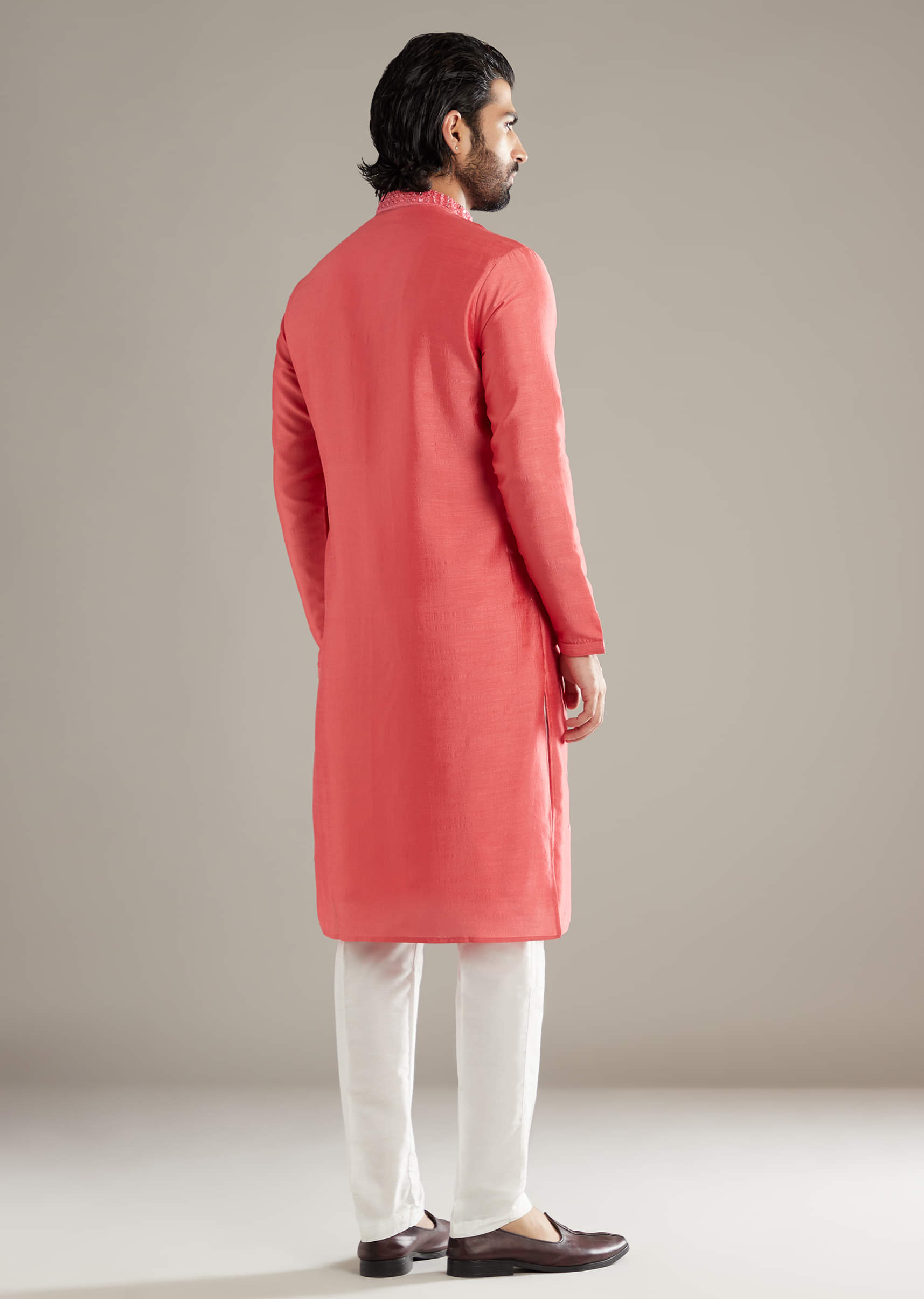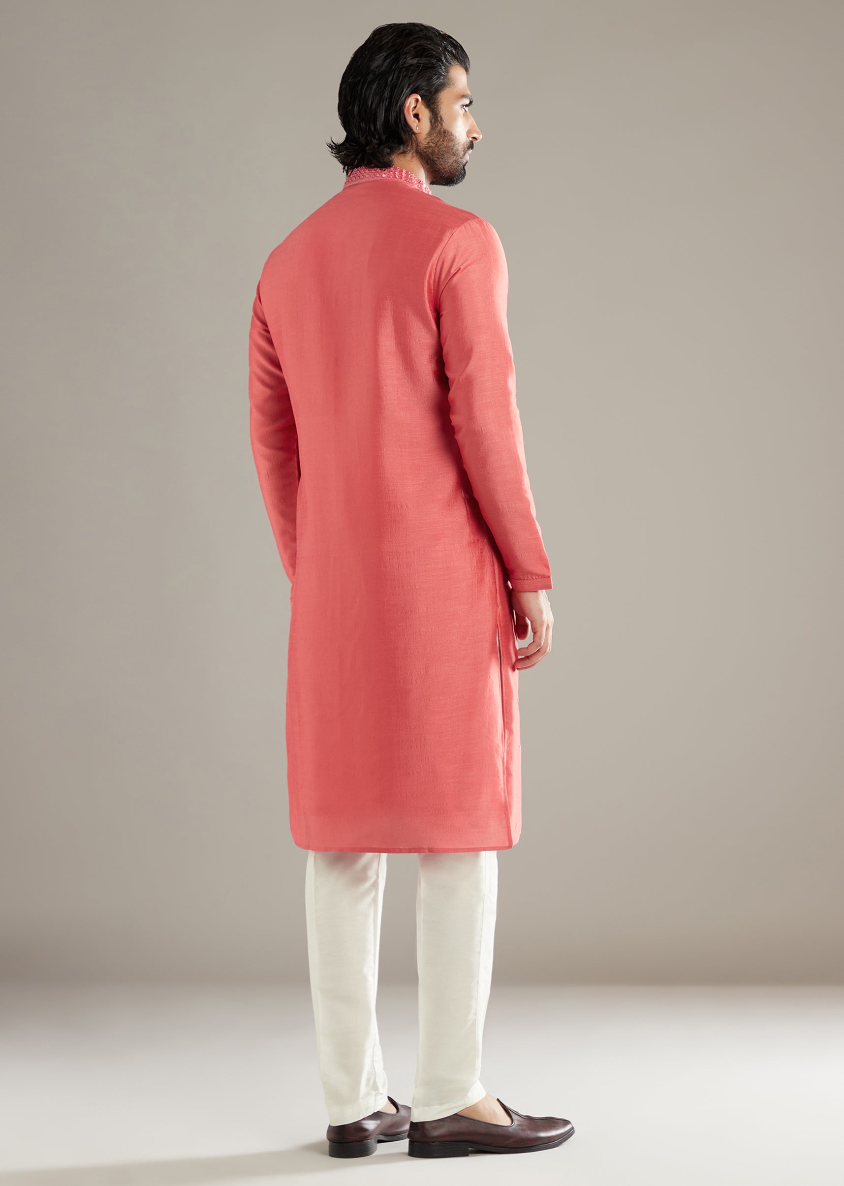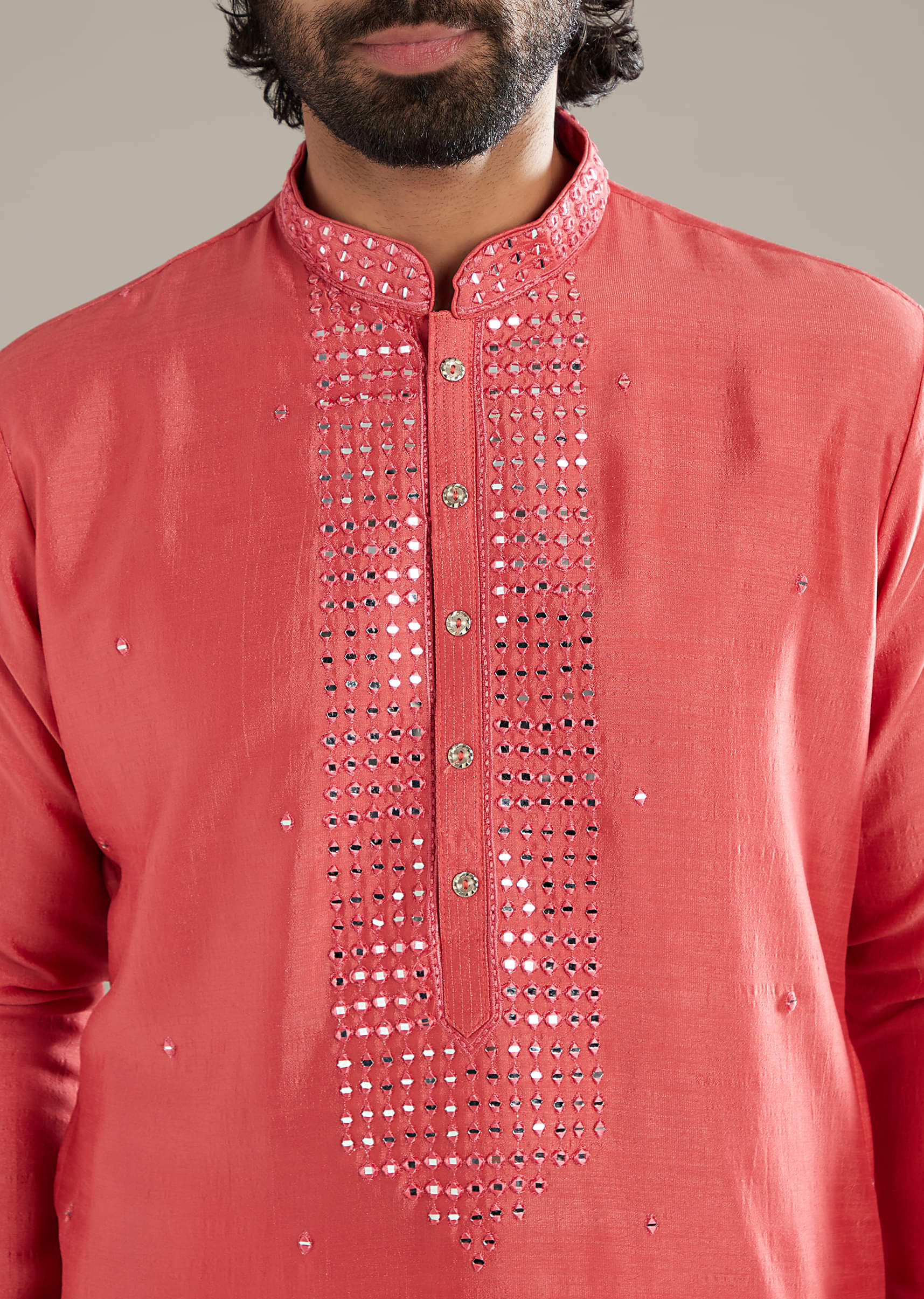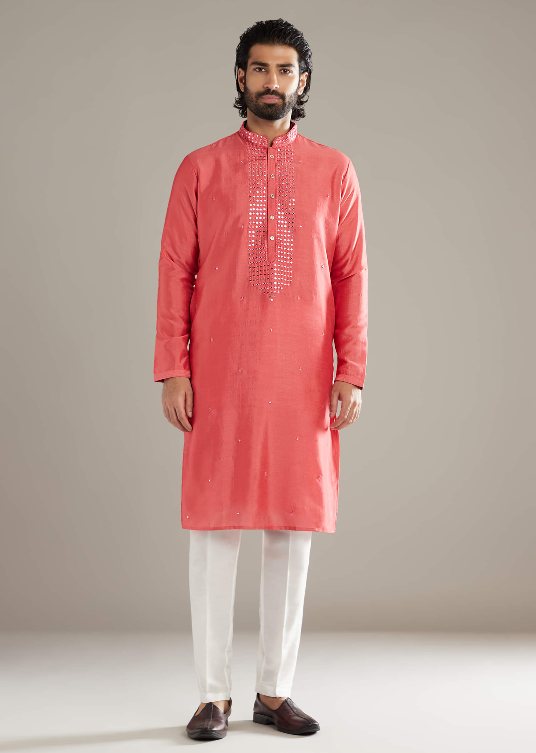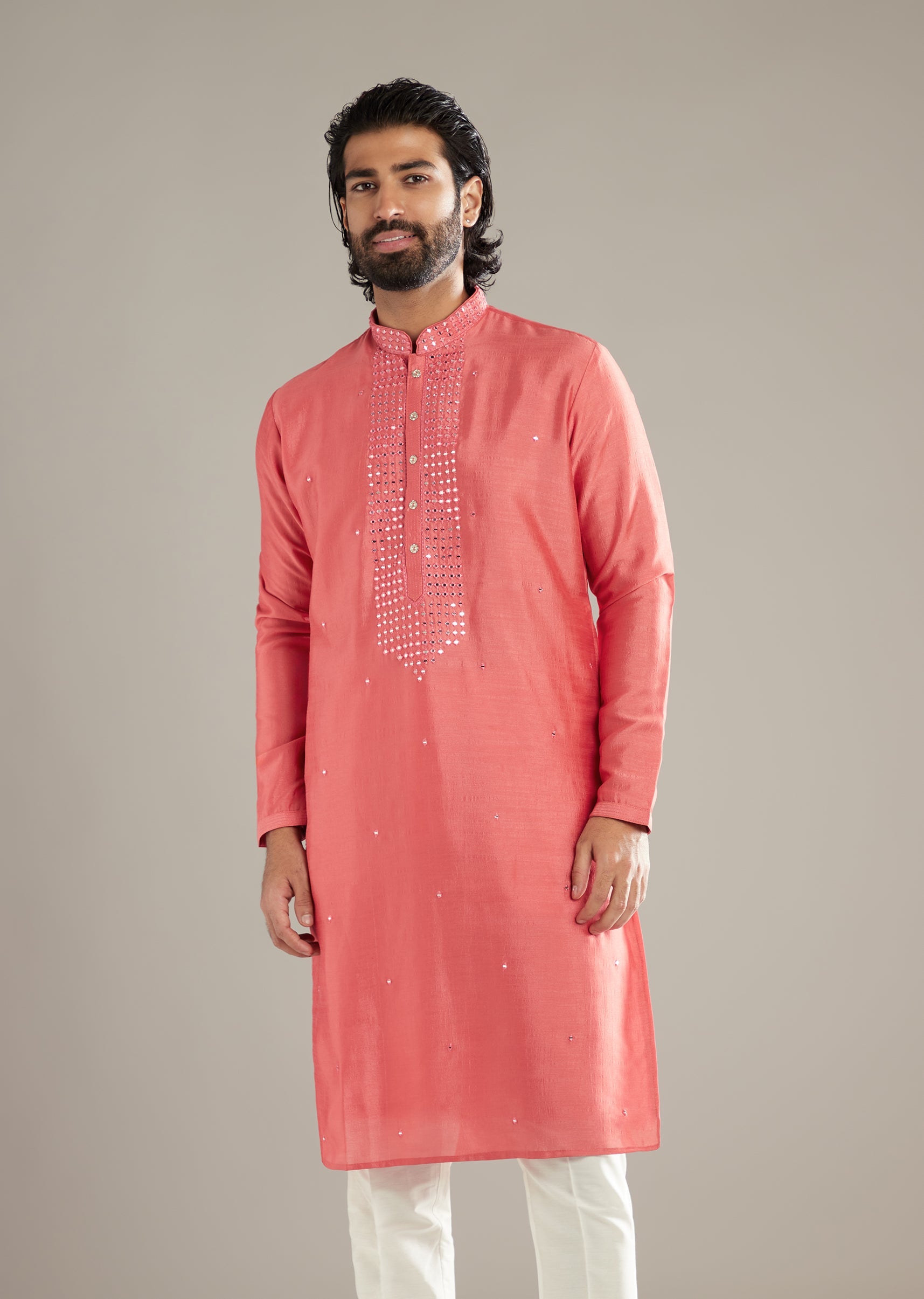 This pink art silk men’s kurta set places mirror accents to lift the collar and placket, adding a bright, festive glint to a smooth base. The tone stays cheerful while... More Product Details