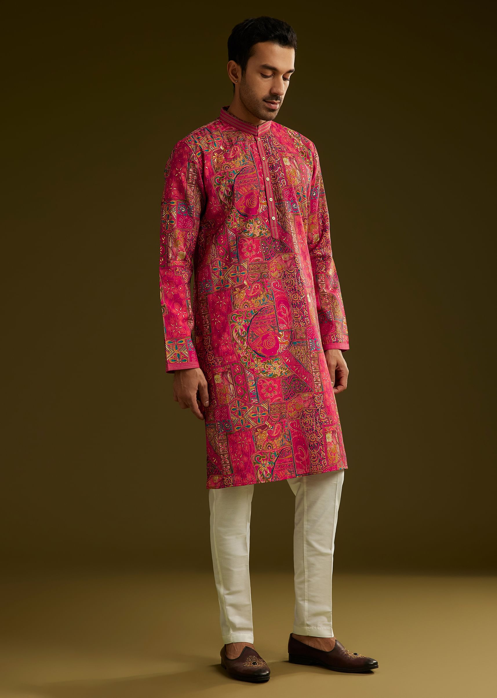 A charming pink silk kurta set with elegant floral abstract prints. The mandarin collar full sleeves and front button closure create a graceful and sophisticated ethnic look..Awarded As The Most... More Product Details