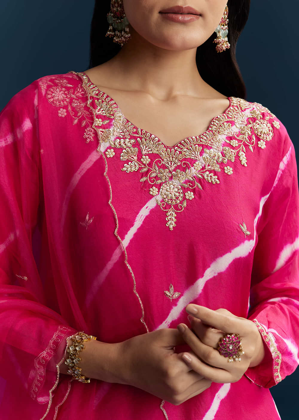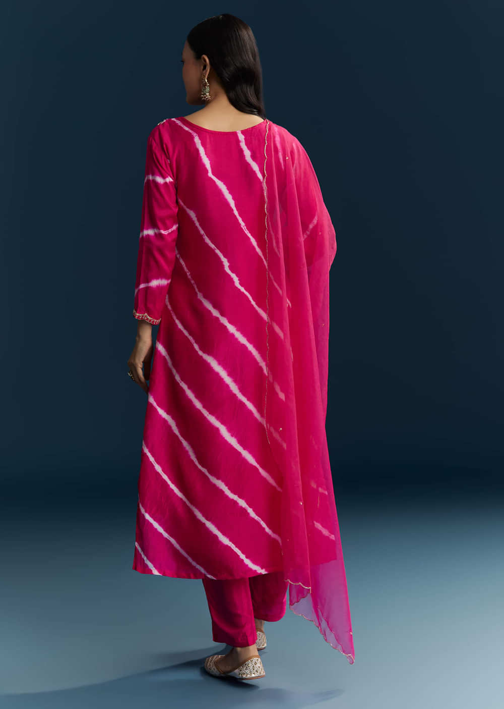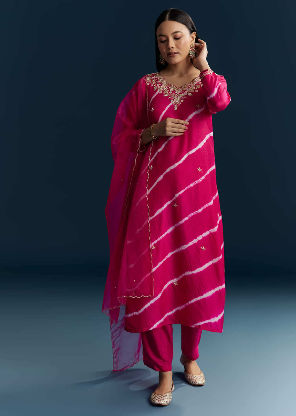 Joyful and feminine, this Pink Silk Kurta Set pairs playful leheriya stripes with delicate embroidery. It is a polished yet lively look that brightens up any occasion. Awarded as the... More Product Details