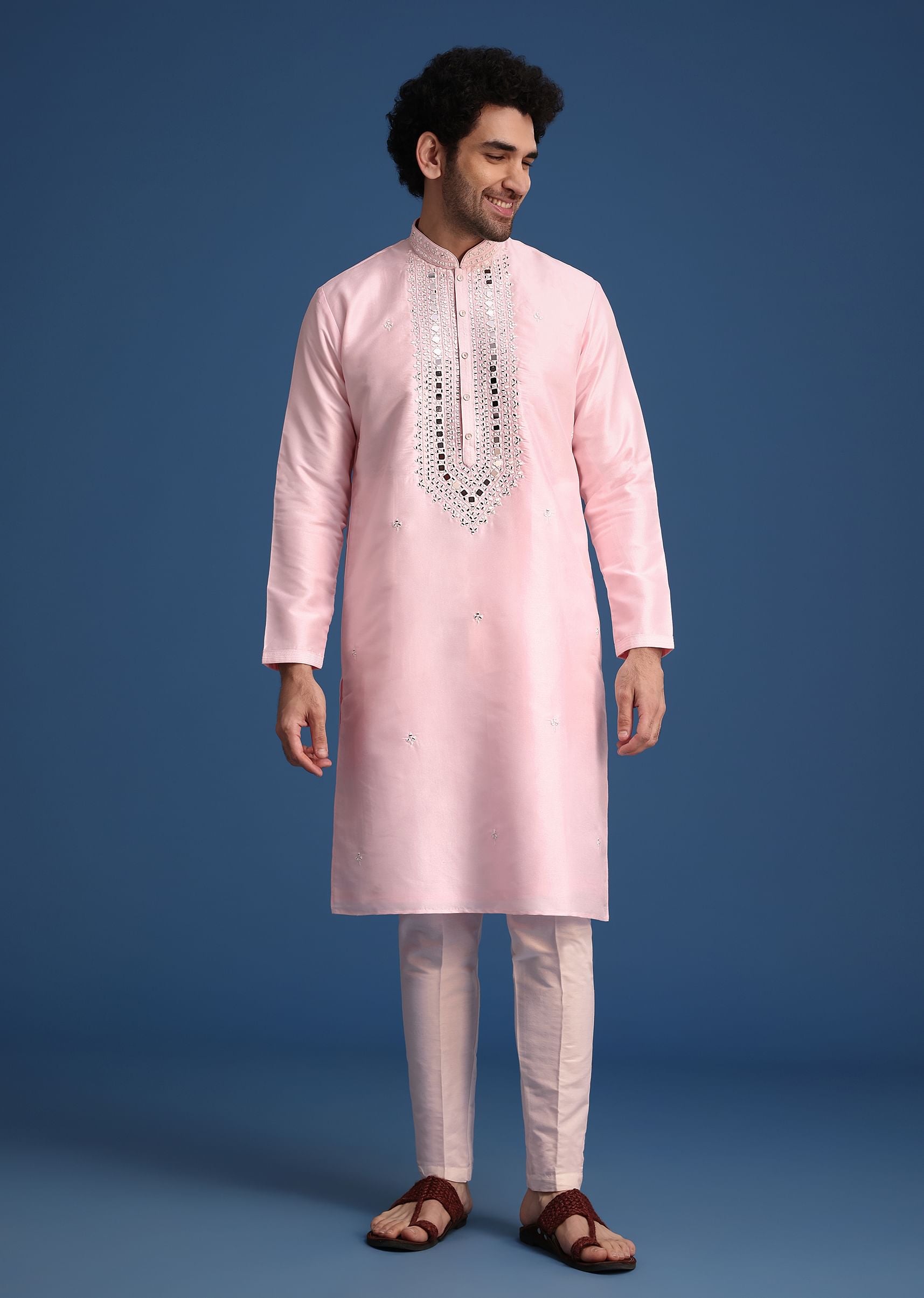 Mirror work embellishments on a pink silk kurta create a festive masterpiece. Its luxurious fabric adds a touch of opulence to any celebration. The vibrant color ensures a standout look... More Product Details