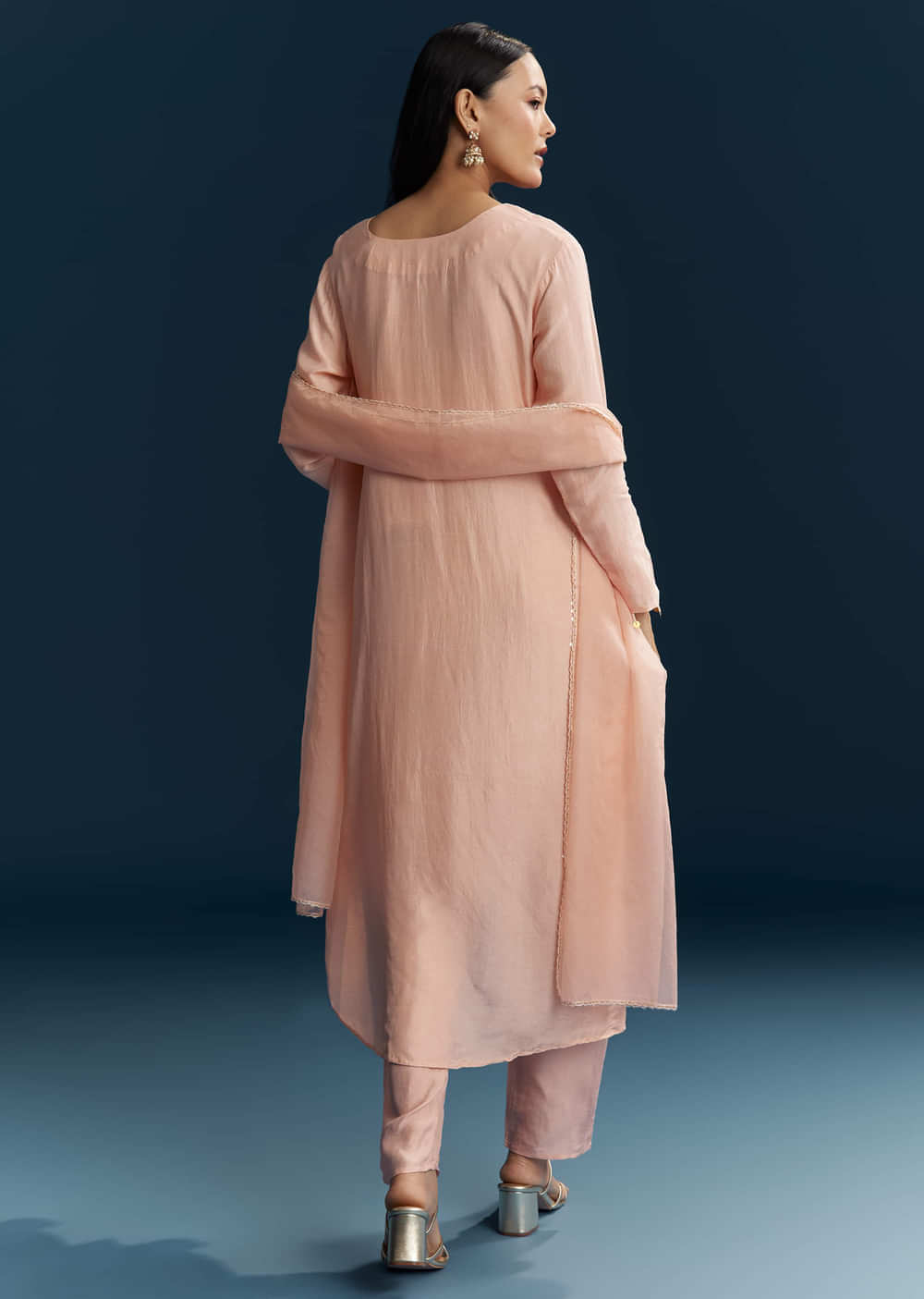 Chic yet graceful, this Pink Silk Kurta Set is touched with fine thread and zari work and finished with a playful high low cut. The natural sheen of silk adds... More Product Details