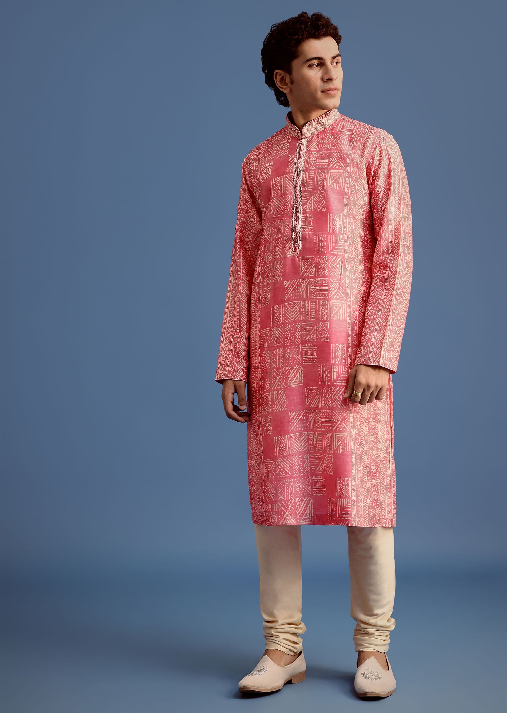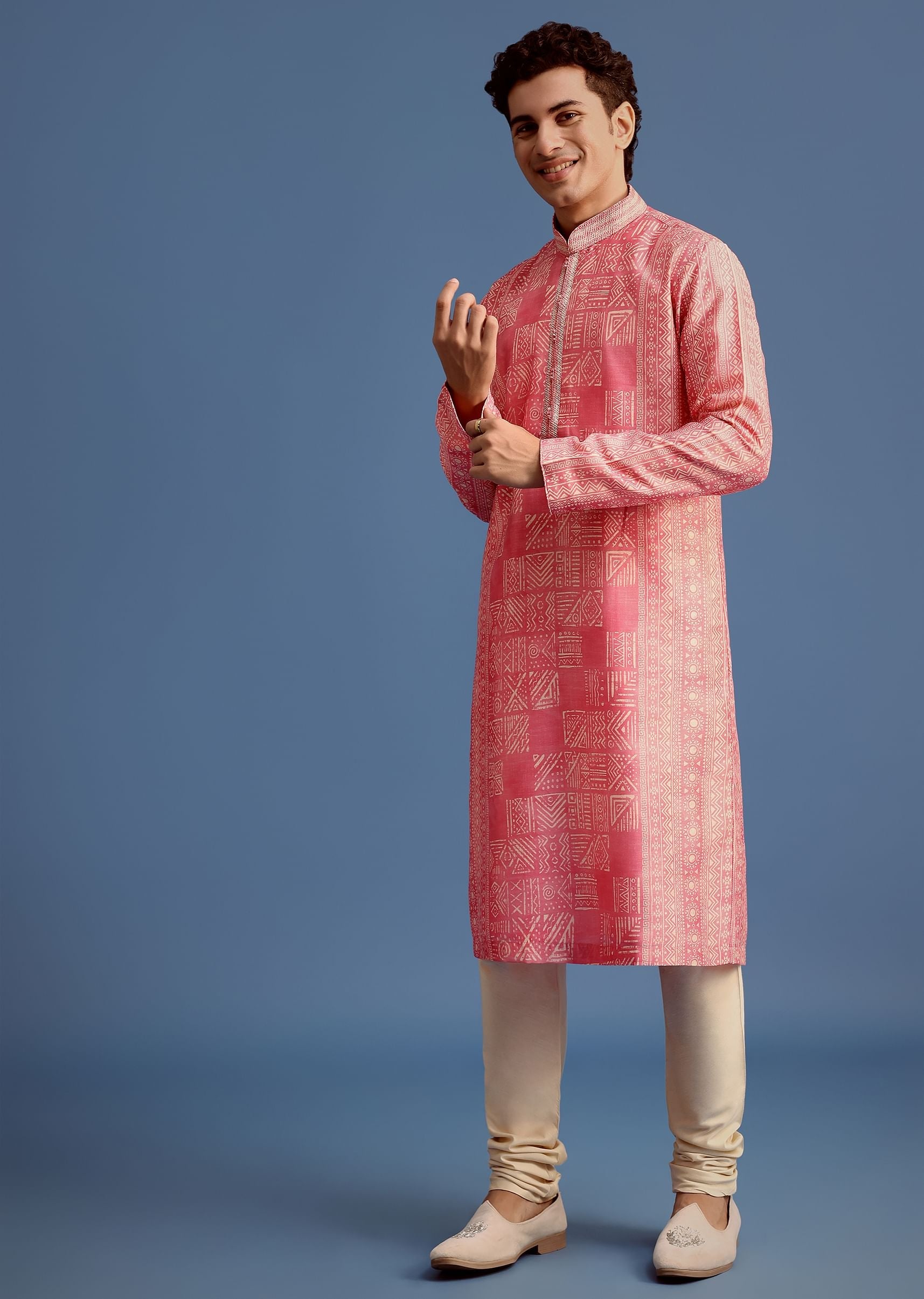 Pink Silk Printed Kurta Set With Mandarin Collar