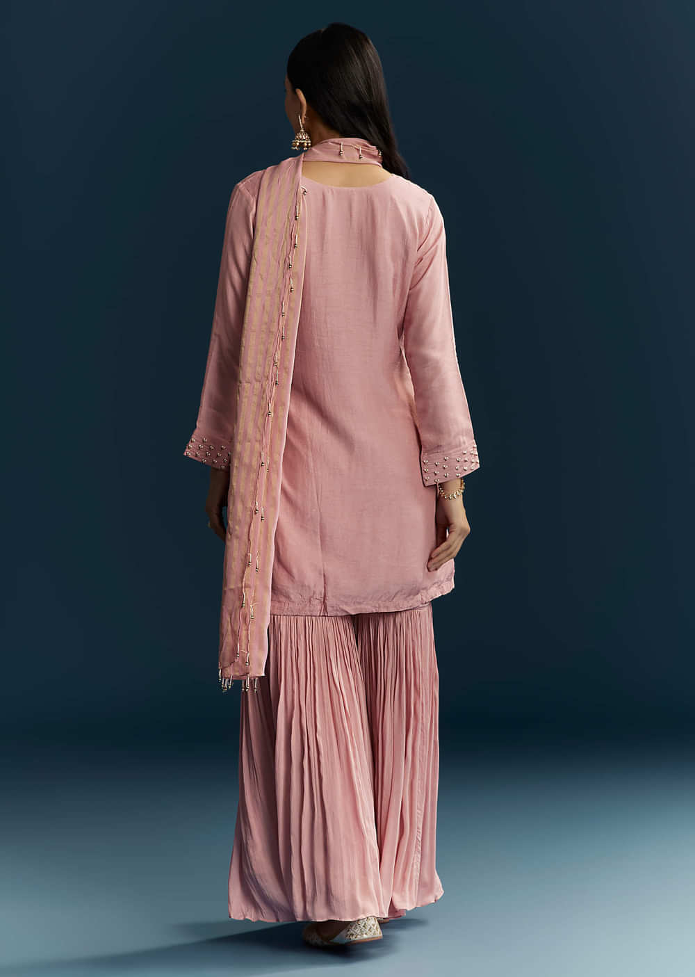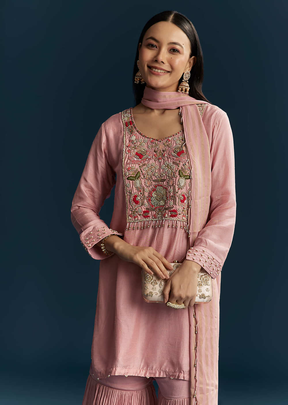 Bright and graceful, this pink silk sharara suit is designed with embroidery that adds just the right amount of intricacy. It’s easy to dress up for a day of celebrations... More Product Details