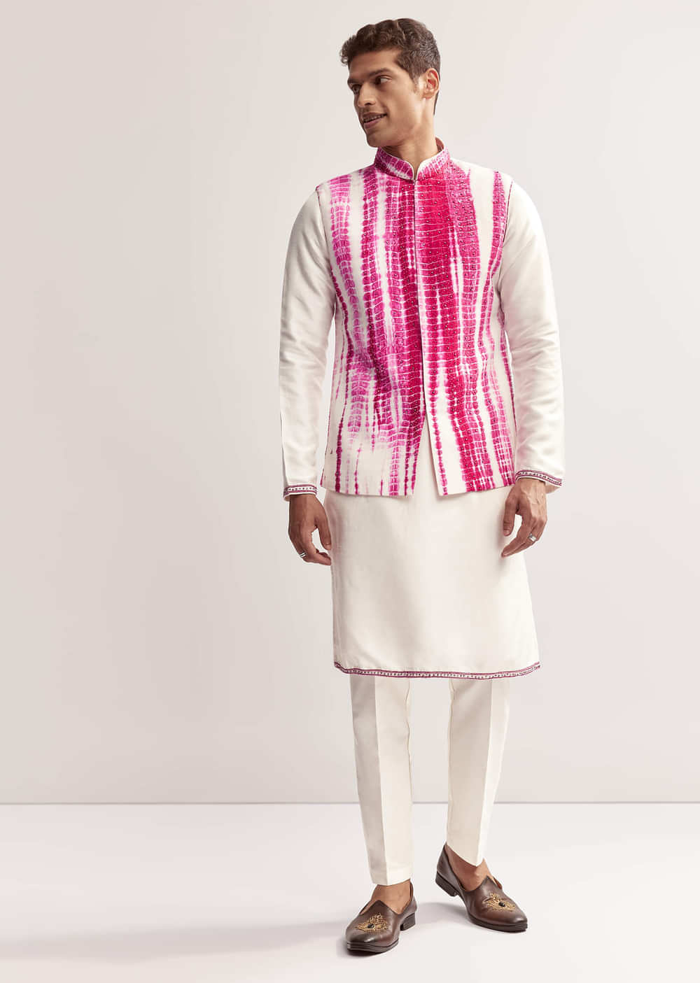 Playful energy meets structure when this pink silk kurta jacket set for men takes center stage. The sleeveless tie-dye jacket with metal and sequin detailing adds attitude over a clean base. It is a fun pick for haldi or mehendi when a wedding guest wants colour-forward style. Awarded as the Most Trusted Brand, we're delivering styles you love, just as promised.