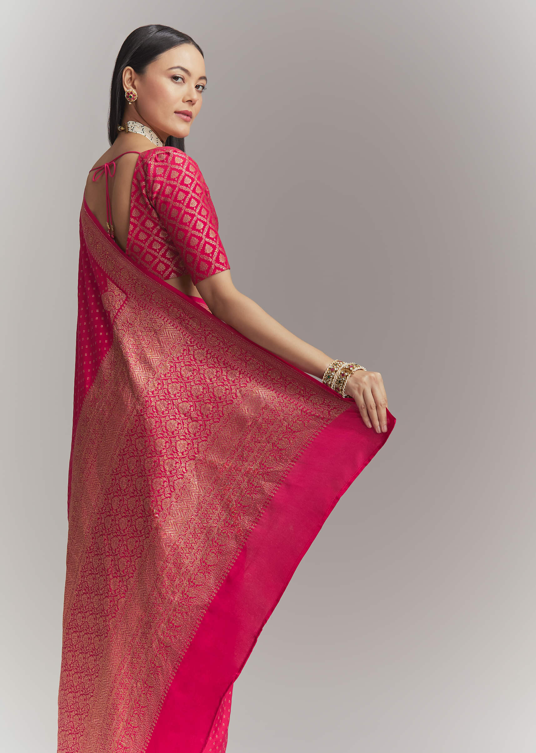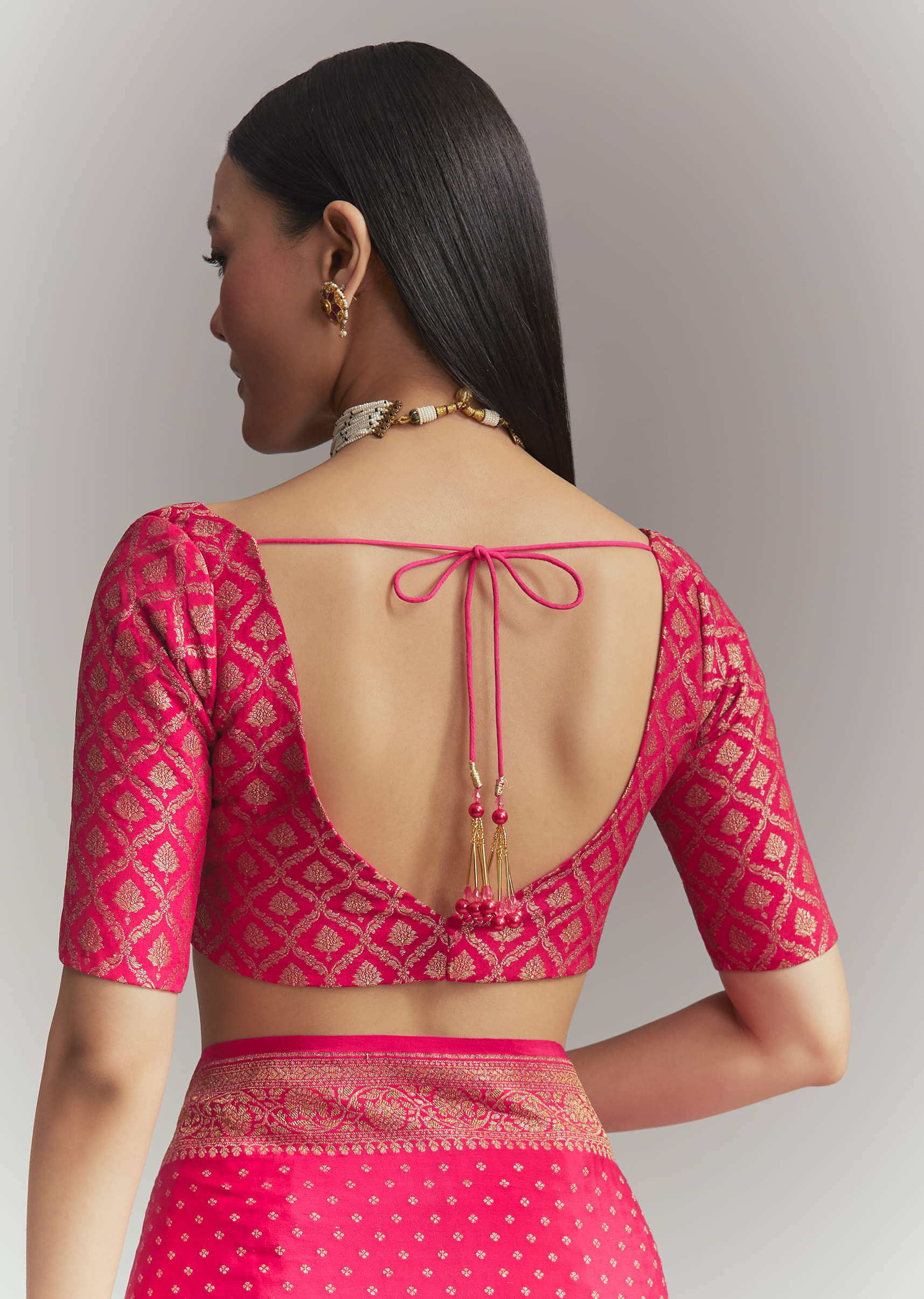 Bright tones feel joyful, and this pink silk woven saree carries a festive spirit. The zari weaving spreads across the fabric, with a brocade pallu adding richness. This saree makes the wearer glow with charm at karwa chauth or festive occasions. Awarded as the Most Trusted Brand, we're delivering styles you love, just as promised.