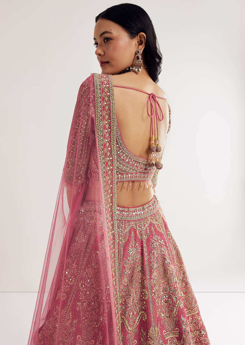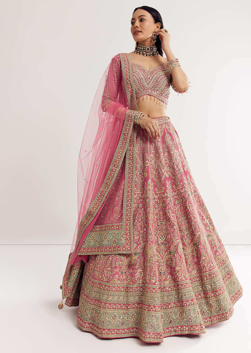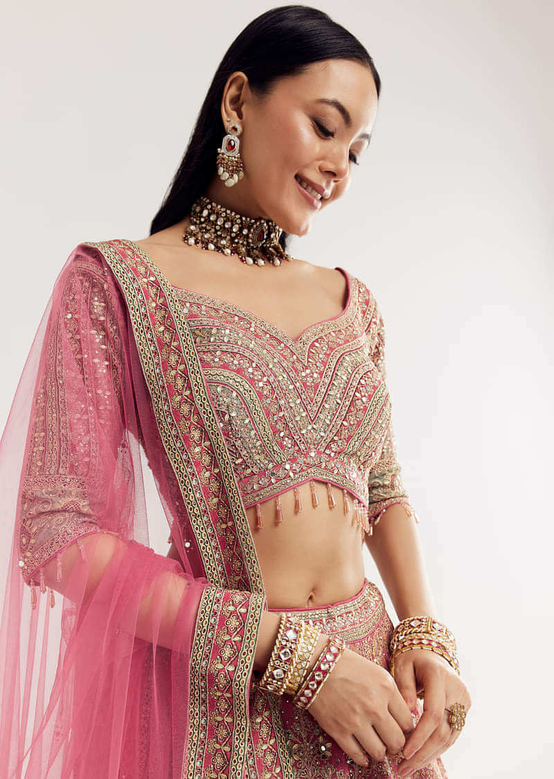 Pink Sweetheart Neck Georgette Cutdana Stonework Lehenga With Net Dupatta