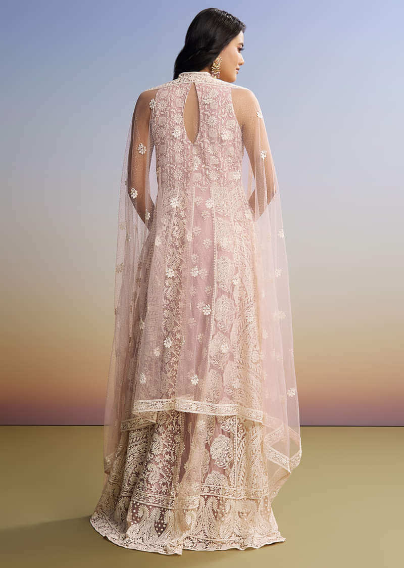 A pastel pink anarkali in delicate net, adorned with intricate threadwork and a mandarin collar. Float into the room like a garden breeze, soft and composed. Let the swirls of... More Product Details