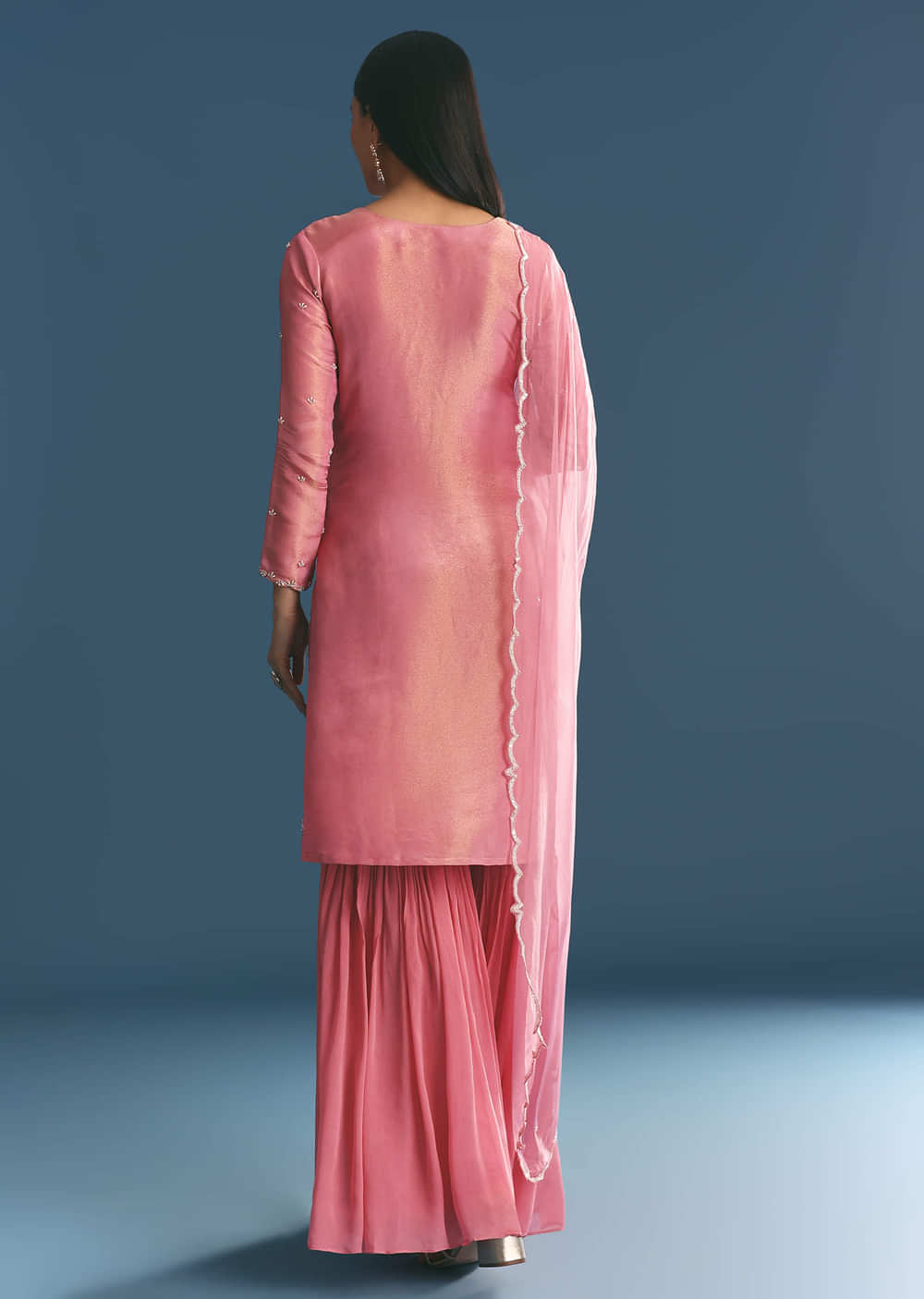 Pink Tissue Kurta Sharara Suit With Moti Cut Dana Work